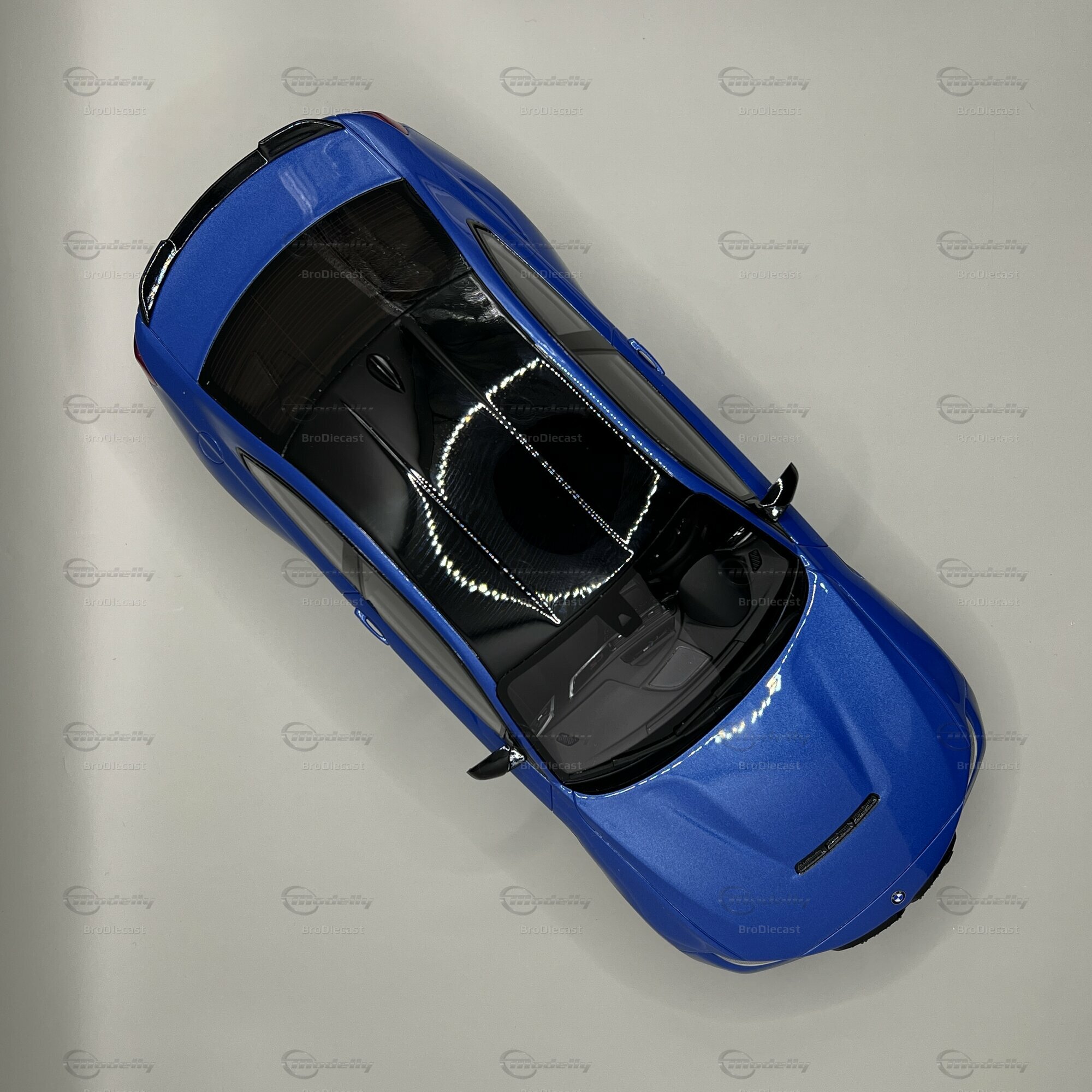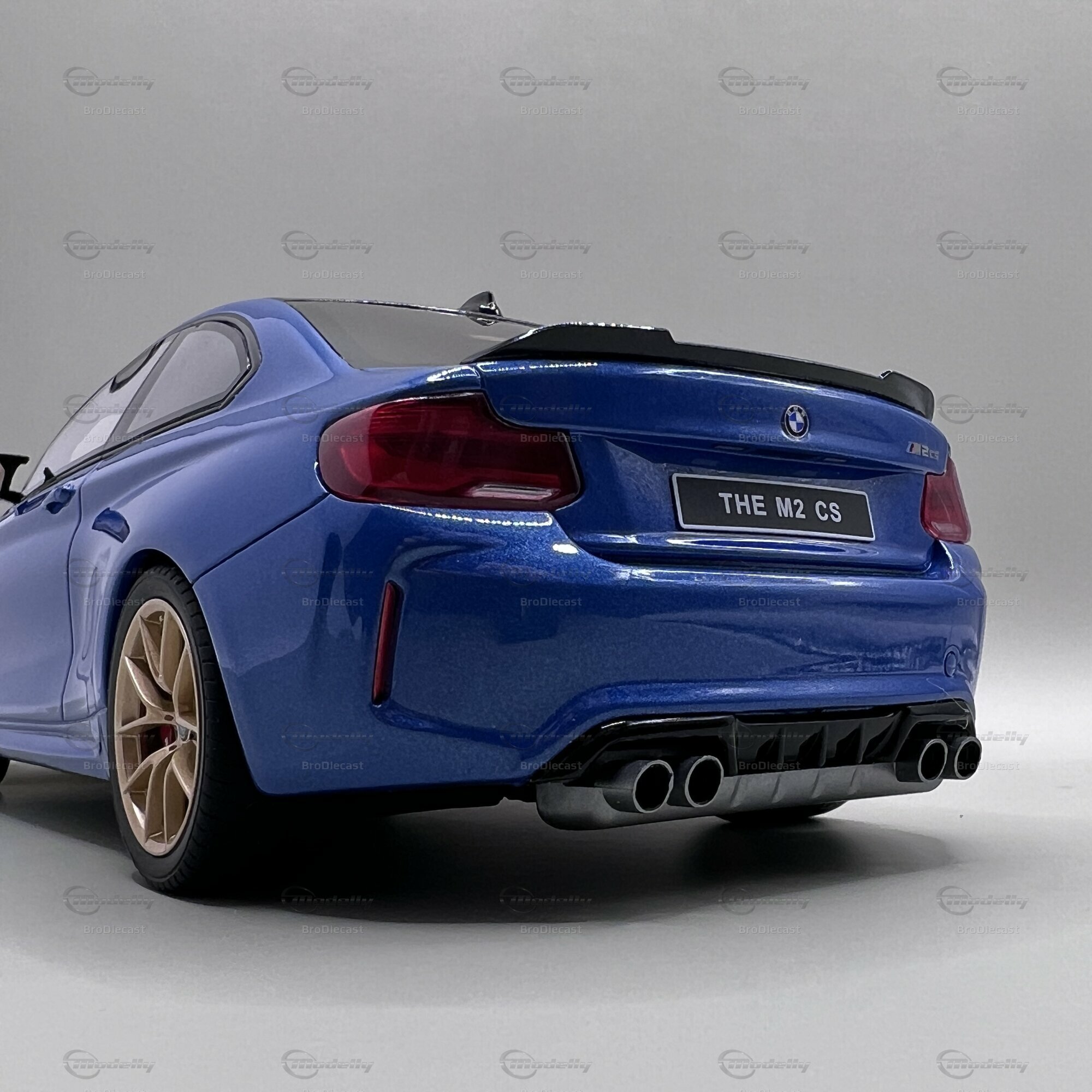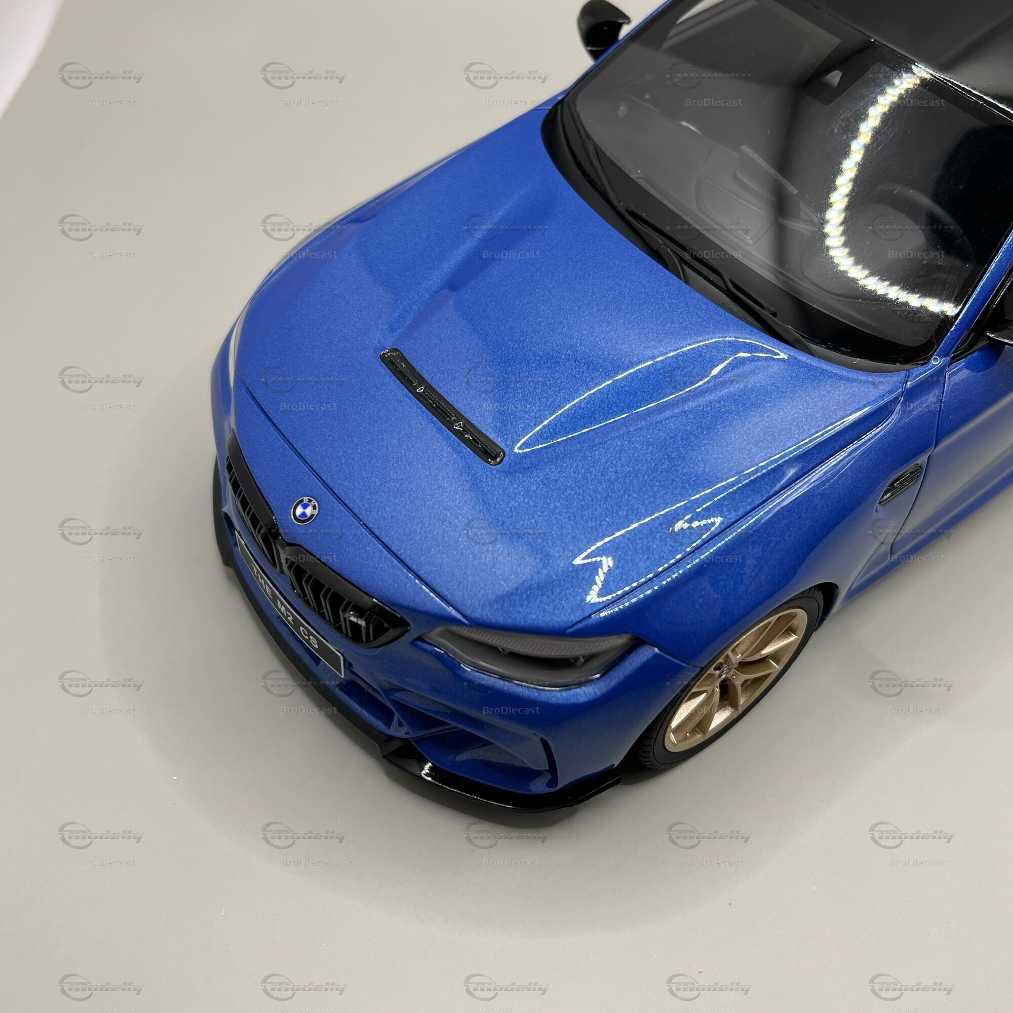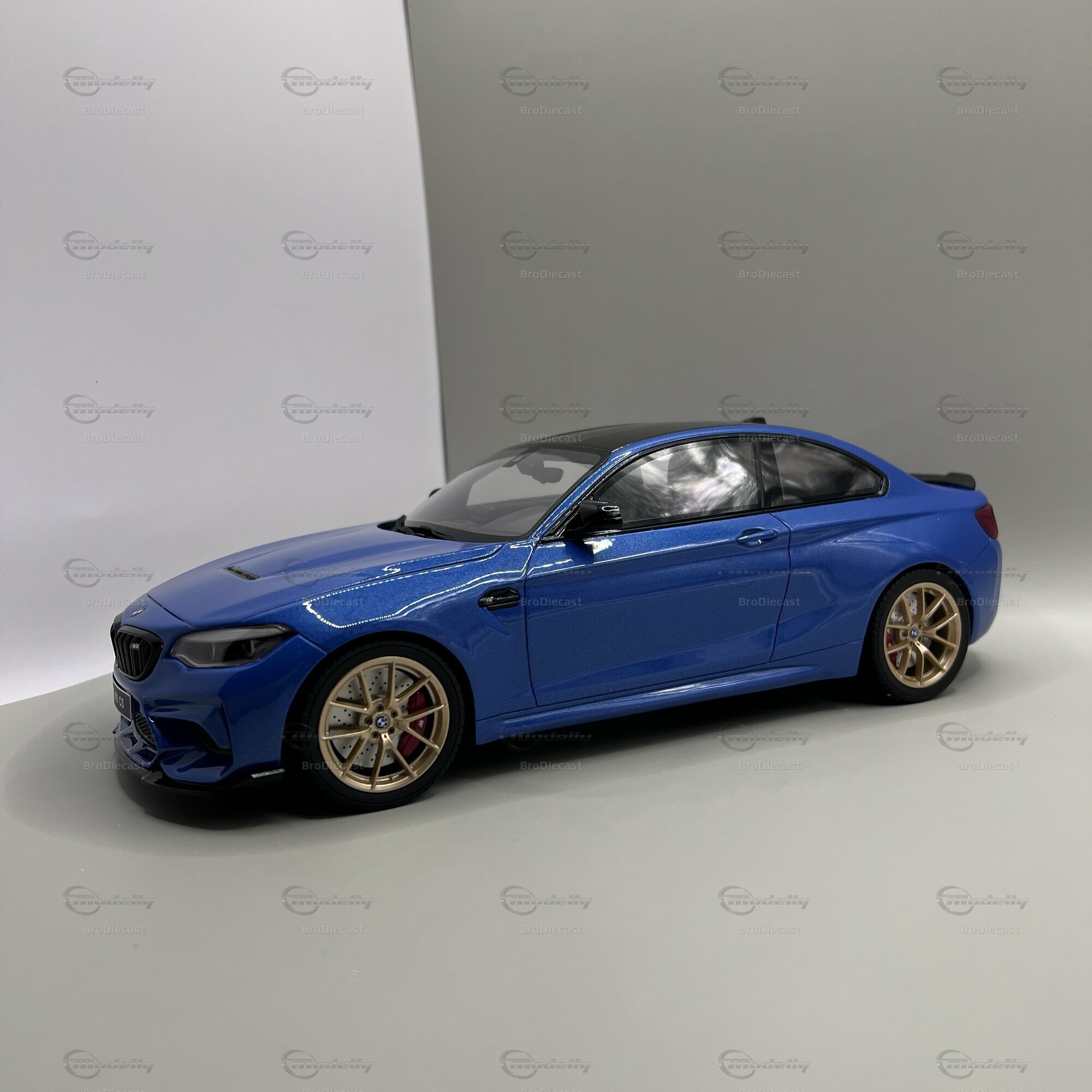 Betrachtet man das Modellauto genauer, fallen sofort einige spezifische Merkmale auf. Die Lackierung in einem auffälligen Blau ähnelt stark der originalen Lackfarbe "Misano Blau Metallic", die das Originalfahrzeug des BMW M2 CS (F87) ziert. Die schwarzen Akzente auf der Motorhaube und das Dach aus Karbonfaser sind ebenso perfekt nachgebildet. Dieses Modellauto hat goldene Felgen, die einen schönen Kontrast zur blauen Karosserie bieten und das sportliche Design weiter betonen. Die Details der Bremssättel, das BMW-Emblem und der markante Kühlergrill sind Beispiele für die Präzision, mit der GT Spirit dieses Modell gefertigt hat.