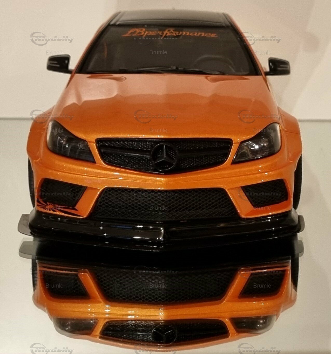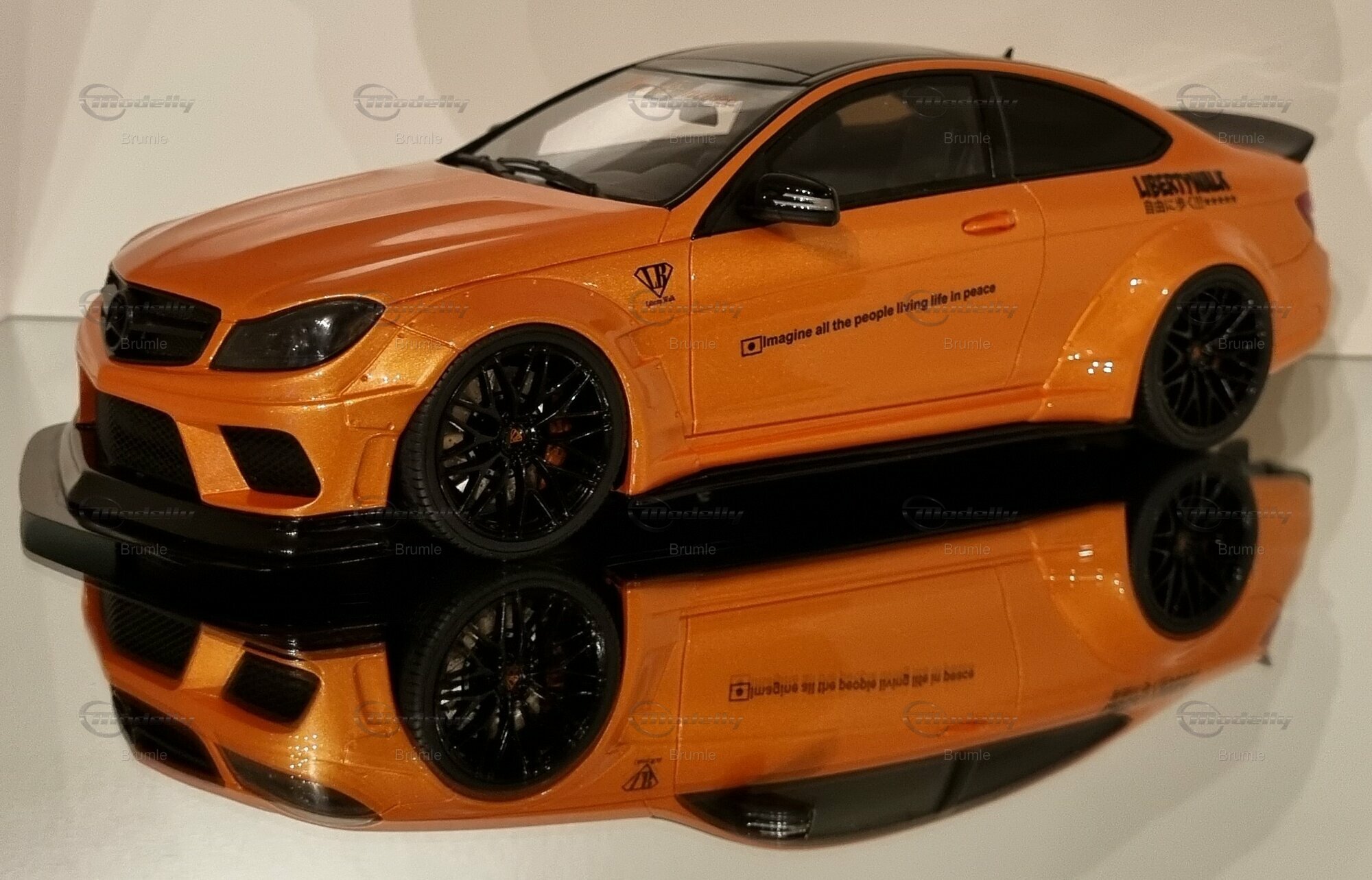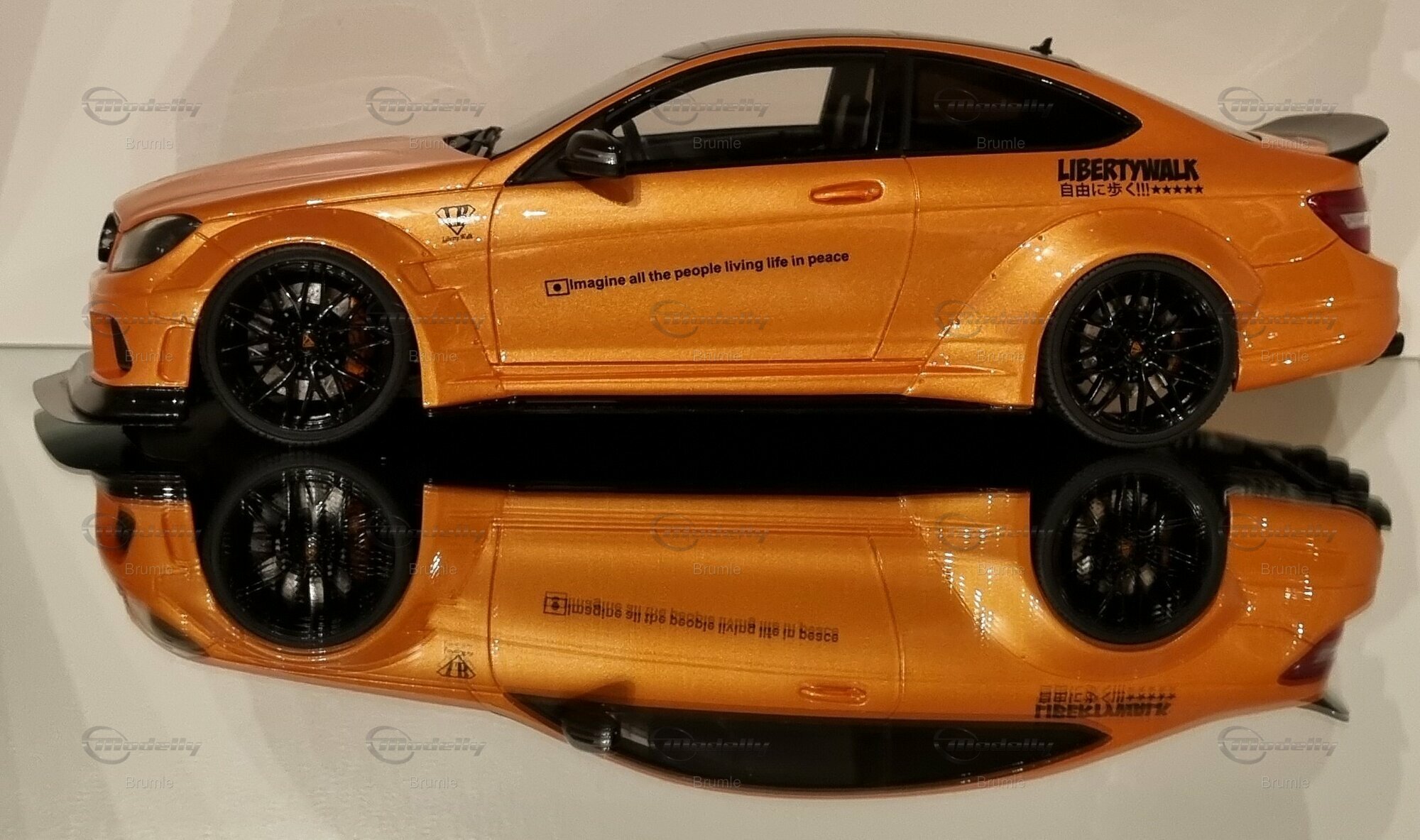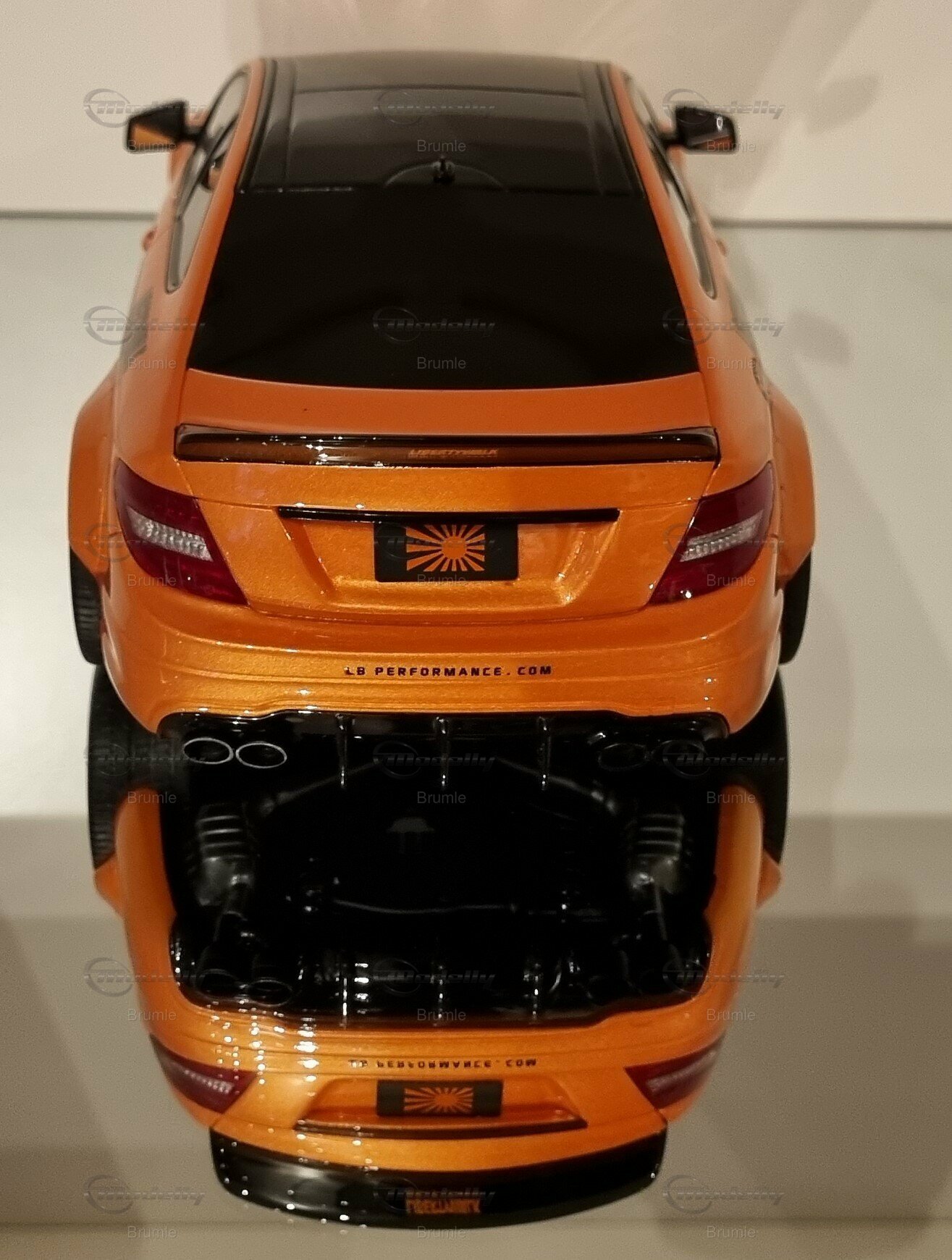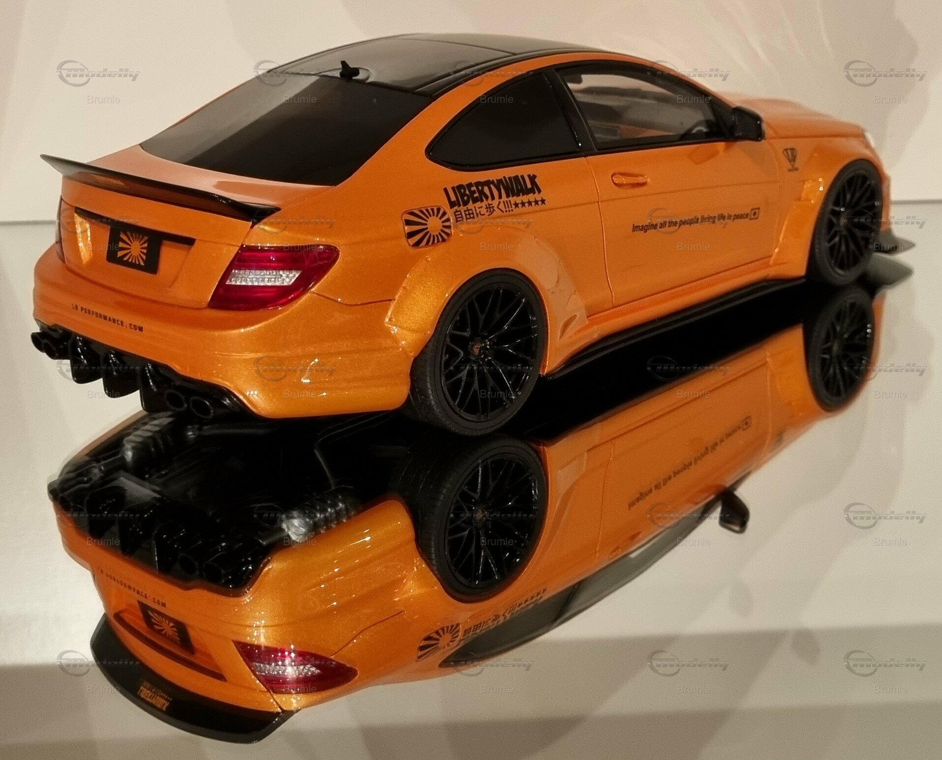 Das hier dargestellte Modell zeigt eine Version des Mercedes-Benz C 63 AMG Coupé, die von der japanischen Tuningfirma Liberty Walk modifiziert wurde. Liberty Walk, gegründet 2008 in Japan, ist bekannt für seine auffälligen und breitgebauten Tuning-Kits. Diese Version ist mit einem markanten Widebody-Kit ausgestattet, das die Karosserie des Fahrzeugs stark verbreitert und ihm ein besonderes aggressives Aussehen verleiht. Die auffälligen Kotflügelverbreiterungen und der große Heckspoiler sind typische Merkmale von Liberty Walk, die auf diesem Modell gut zu erkennen sind. Dieses Tuningkit setzt das ohnehin schon kraftvolle Design des Mercedes-Benz C 63 AMG Coupé noch weiter in Szene.