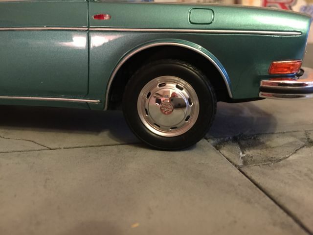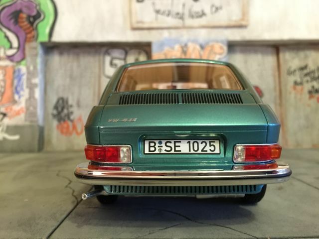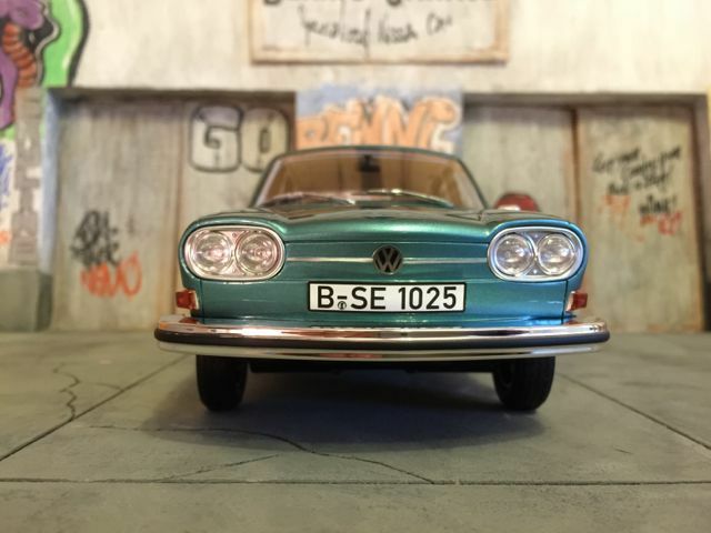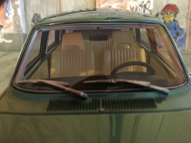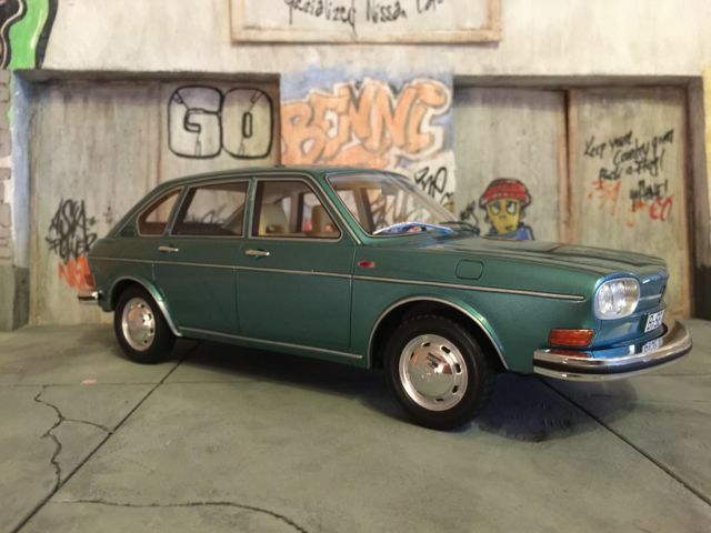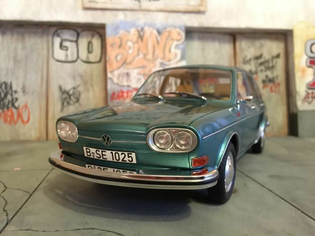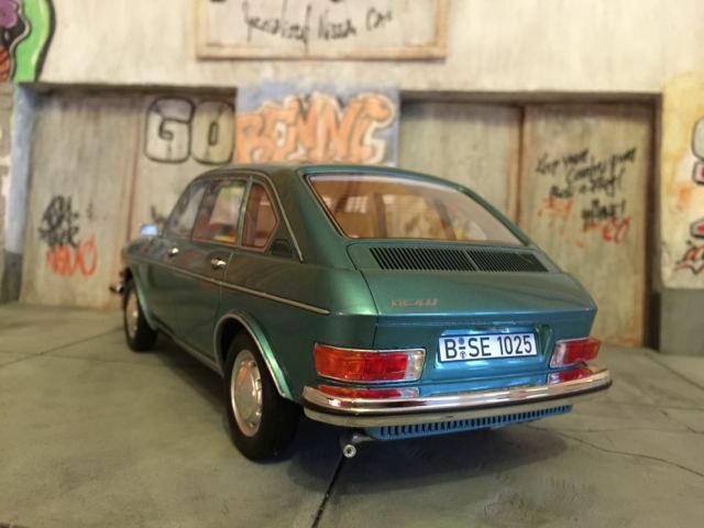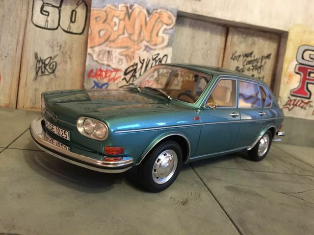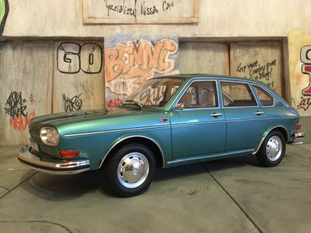 Das präsentierte Modellfahrzeug im 1:18-Maßstab von BoS basiert auf dem Volkswagen VW 411 und ist aus hochwertigem Resin gefertigt. Dieses Modell steht aufgrund seiner präzisen Details und der hochwertigen Umsetzung bei Sammlern hoch im Kurs. Die Miniatur zeigt den Volkswagen VW 411 in einem markanten Blaugrün-Ton, was an den beliebten Farben der späten 60er Jahre erinnert. Das Modellfahrzeug ist auf der Sammlung von Modelly-Mitglied “c-kadett” zu sehen und besitzt eine detailgetreue Innenausstattung, bei der sogar die spezifischen Texturen und Materialien des Originals nachempfunden sind. Der elegante Farbton des Lacks und die akkurate Umsetzung der Chromdetails vermitteln ein authentisches Bild des historischen Fahrzeugmodells.