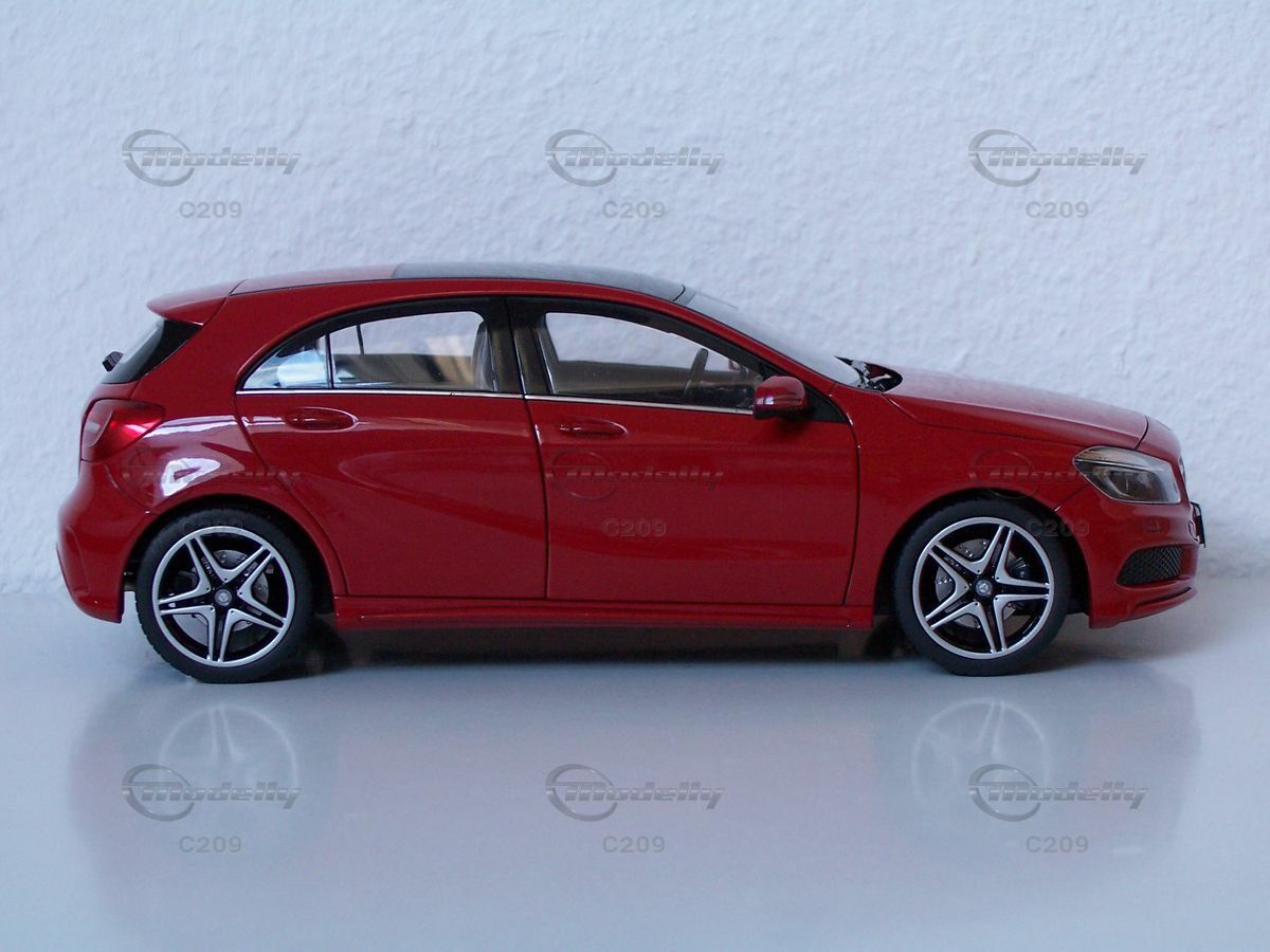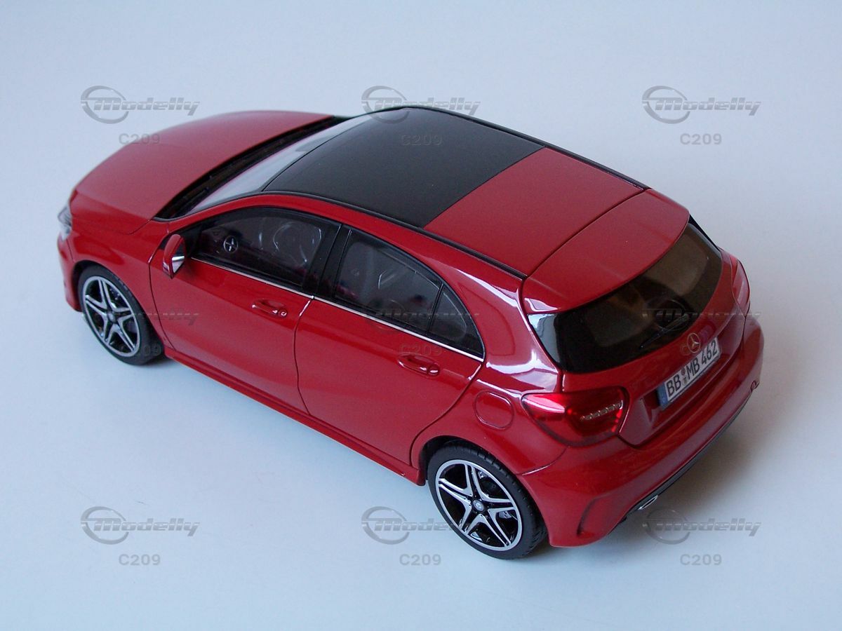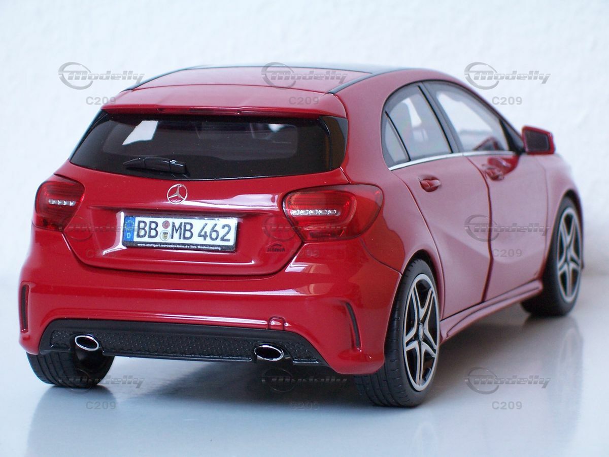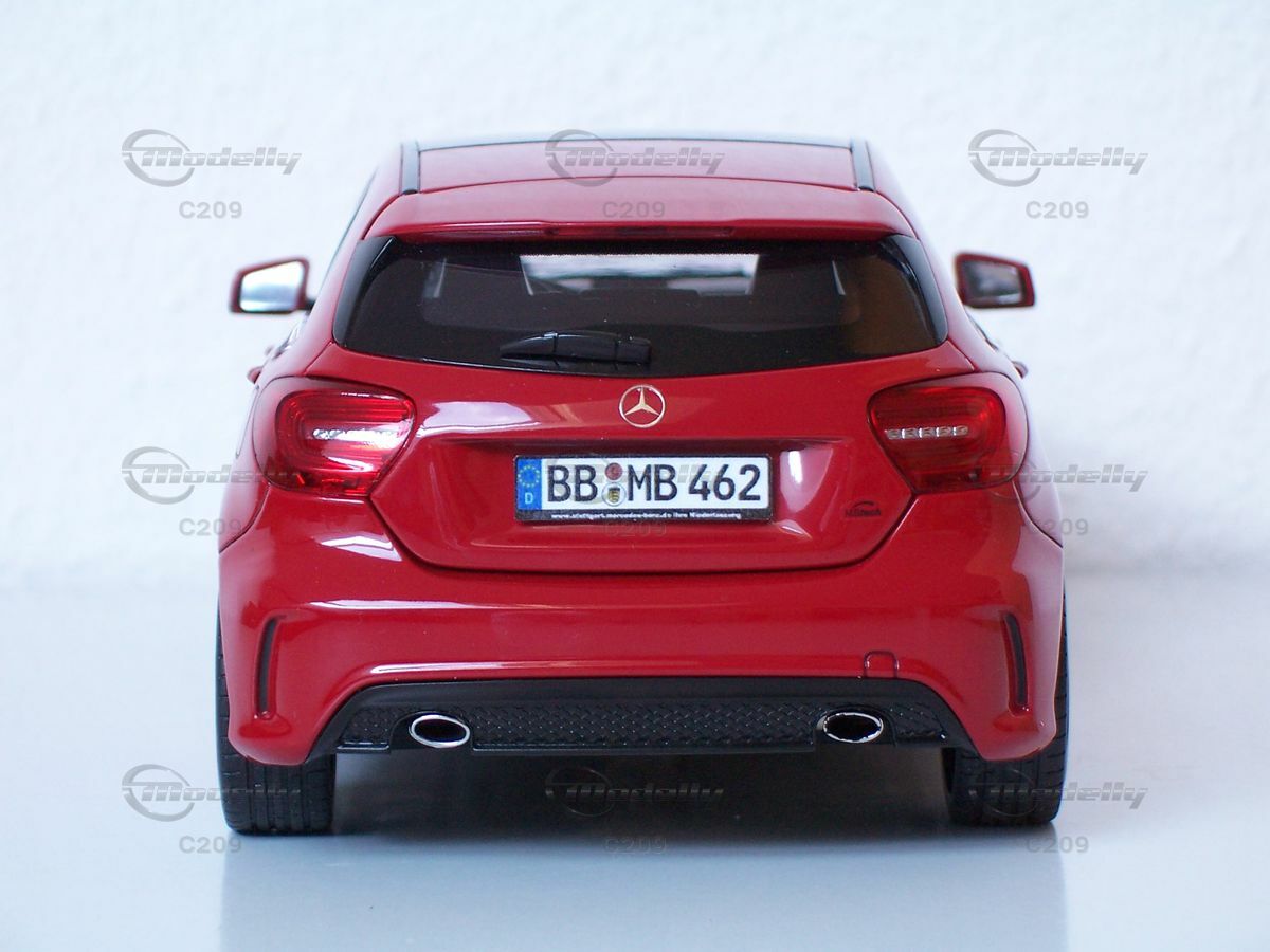 Das Modellauto ist eine detailgetreue Darstellung eines Mercedes A180 AMG Line (W176) im Maßstab 1:18, gefertigt von Norev. Es wurde aus hochwertigem Druckgussmaterial hergestellt (diecast) und zeichnet sich durch seine besondere Präzision in der Form- und Farbgebung aus. Die Außenlackierung ist ein auffälliges, glänzendes Rot, das durch die schwarzen Akzente im Dachbereich und an den Spiegelkappen ergänzt wird. Dies verleiht dem Modell eine authentische Optik, die den originalen sportlichen Charakter des Mercedes widerspiegelt. Auf den Fotos werden die feinen Details wie der Kühlergrill mit dem großen zentralen Mercedes-Stern und die perfekt proportionierten Scheinwerfer sowie Rückleuchten sichtbar.
