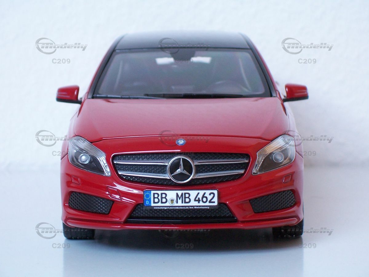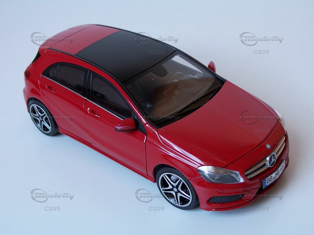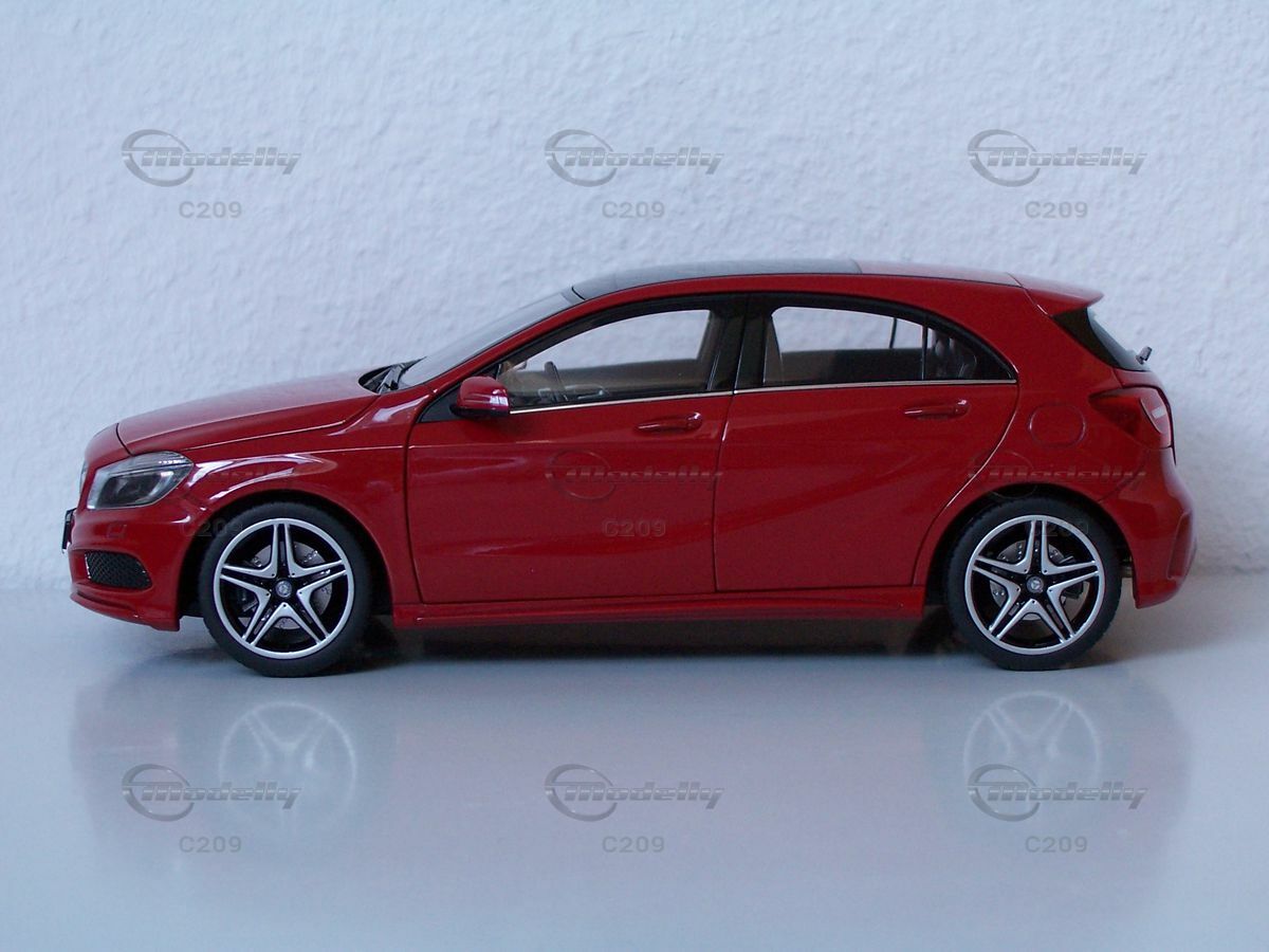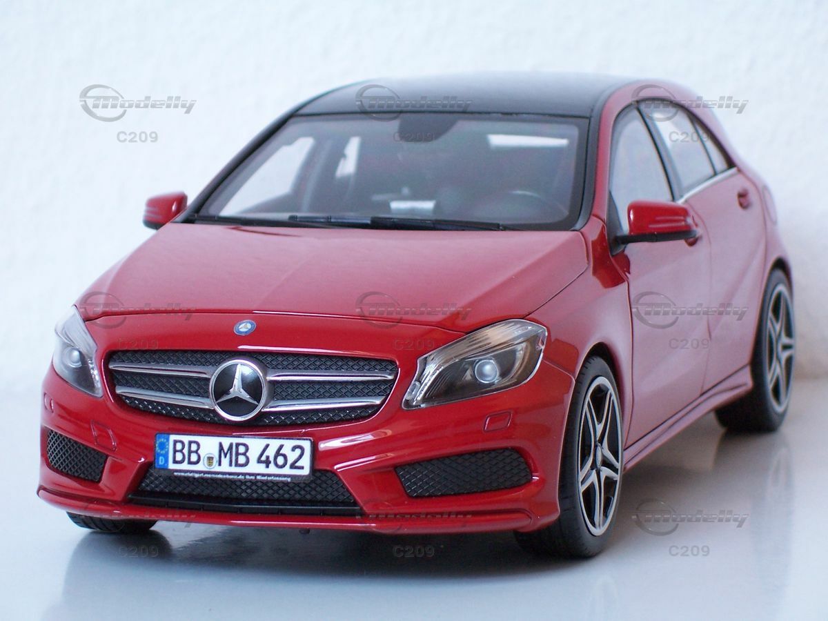 Das Modellauto ist eine detailgetreue Darstellung eines Mercedes A180 AMG Line (W176) im Maßstab 1:18, gefertigt von Norev. Es wurde aus hochwertigem Druckgussmaterial hergestellt (diecast) und zeichnet sich durch seine besondere Präzision in der Form- und Farbgebung aus. Die Außenlackierung ist ein auffälliges, glänzendes Rot, das durch die schwarzen Akzente im Dachbereich und an den Spiegelkappen ergänzt wird. Dies verleiht dem Modell eine authentische Optik, die den originalen sportlichen Charakter des Mercedes widerspiegelt. Auf den Fotos werden die feinen Details wie der Kühlergrill mit dem großen zentralen Mercedes-Stern und die perfekt proportionierten Scheinwerfer sowie Rückleuchten sichtbar.