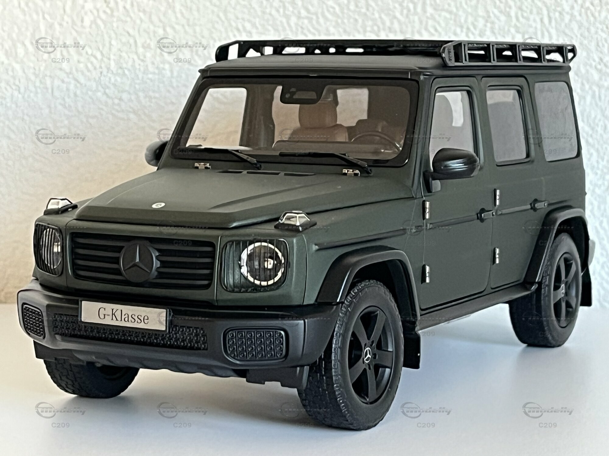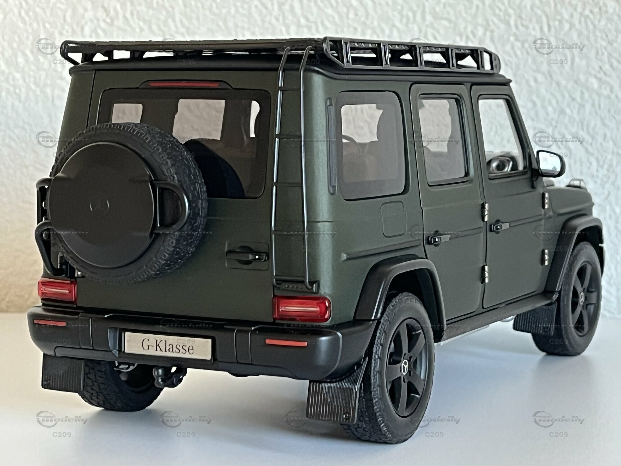 Das hier gezeigte Modellauto im Maßstab 1:18, hergestellt von Norev, ist eine detailgetreue Darstellung des Originals. Es wurde auf der Basis von hochpräzisen Daten aus dem Originalfahrzeug entwickelt. Das Material, aus dem dieses Modell gefertigt wurde, ist hochwertiges Diecast-Metall, was zu einer besonders originalgetreuen Wiedergabe beiträgt. Das Modell, Teil der Sammlung des Modellbau-Enthusiasten "C209", zeigt spezifische Details wie den Dachgepäckträger, die Reserveradabdeckung am Heck und die breite Spurweite der Offroad-Bereifung. Die lackierte Oberfläche in einem matten Olivgrün erinnert an die Geländetauglichkeit und verleiht dem Modell zusätzliche Authentizität. Ebenfalls authentisch sind die Reifen mit Mercedes-Logo und die kleinen Details wie Türschlösser, Rückleuchten sowie der Schriftzug "G-Klasse" auf der Heckklappe.