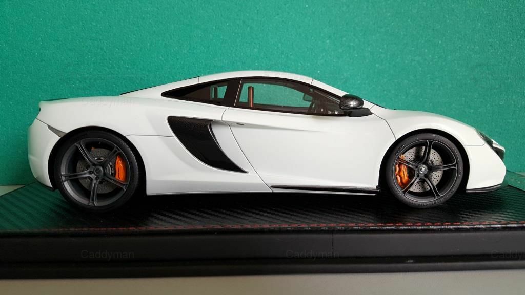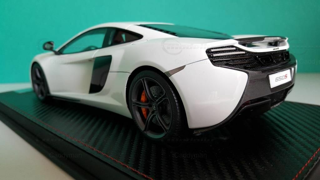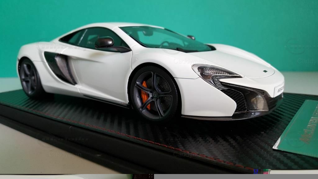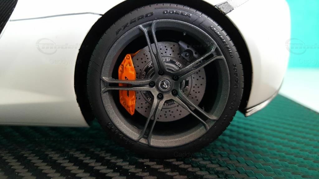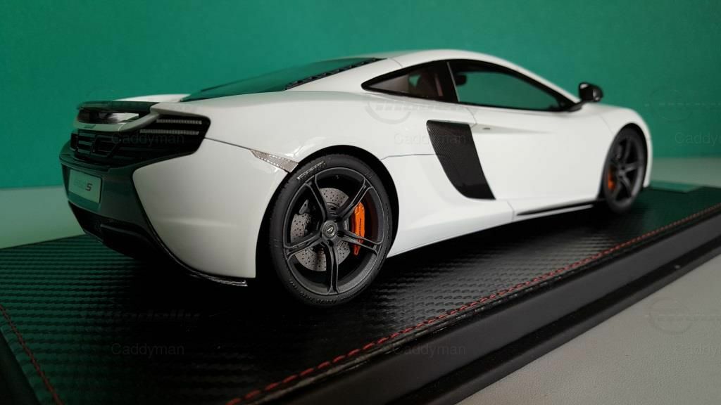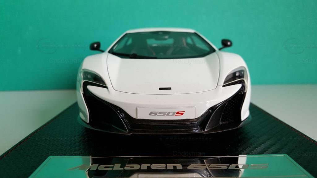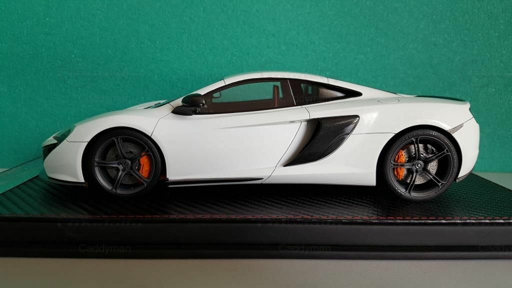 Das hier gezeigte Modellauto im Maßstab 1:18 wird von AvanStyle hergestellt und gehört zur Sammlung des Modelly-Mitglieds "Caddyman". Es handelt sich um eine detailgetreue Nachbildung des originalen McLaren 650S. Besonders ins Auge fällt die präzise Verarbeitung der Karosserie aus Resin, die den authentischen weißen Lack hervorragend zur Geltung bringt. Die Carbon-Details und die orange lackierten Bremssättel sind ebenfalls sehr genau umgesetzt. Die Räder wirken sehr realistisch und es erscheinen so, als wären sie tatsächlich aus Leichtmetall, ähnlich wie das Originalfahrzeug.