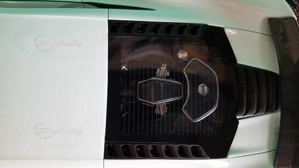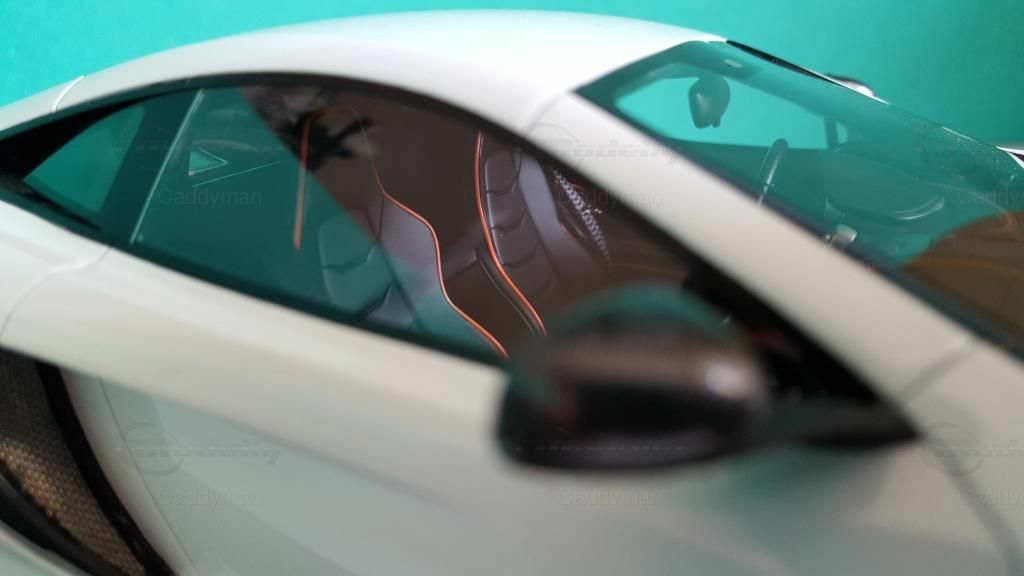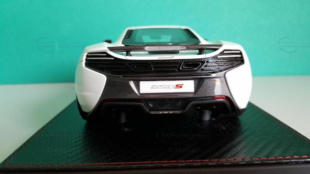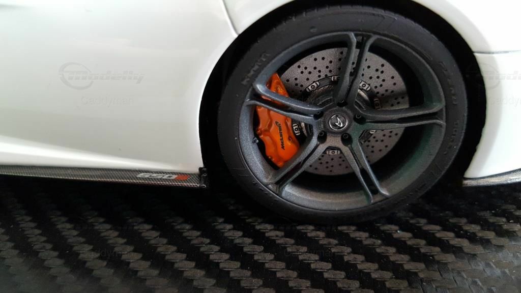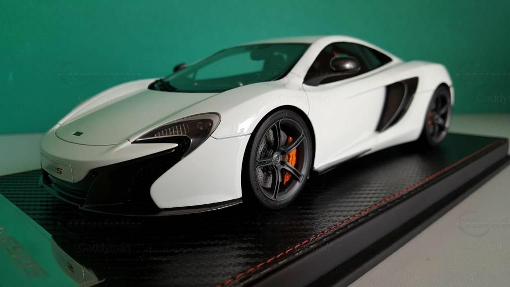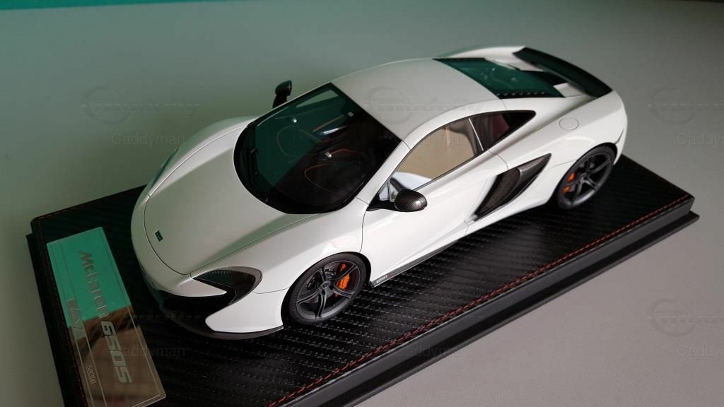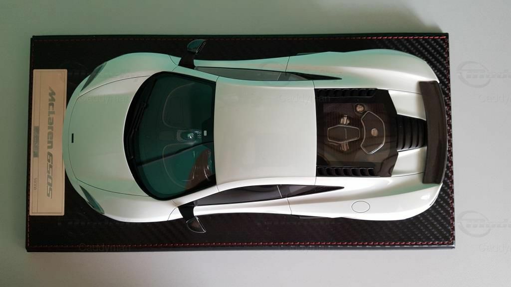Das hier gezeigte Modellauto im Maßstab 1:18 wird von AvanStyle hergestellt und gehört zur Sammlung des Modelly-Mitglieds "Caddyman". Es handelt sich um eine detailgetreue Nachbildung des originalen McLaren 650S. Besonders ins Auge fällt die präzise Verarbeitung der Karosserie aus Resin, die den authentischen weißen Lack hervorragend zur Geltung bringt. Die Carbon-Details und die orange lackierten Bremssättel sind ebenfalls sehr genau umgesetzt. Die Räder wirken sehr realistisch und es erscheinen so, als wären sie tatsächlich aus Leichtmetall, ähnlich wie das Originalfahrzeug.