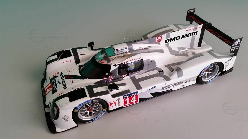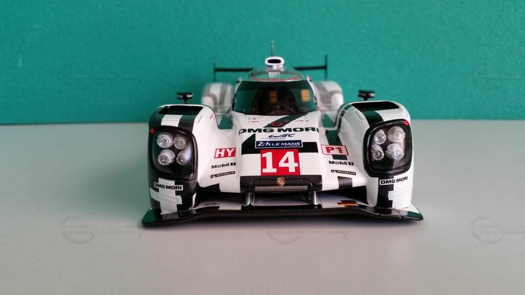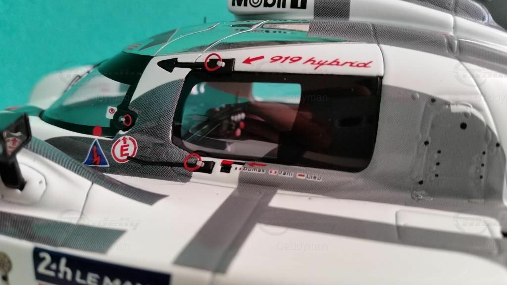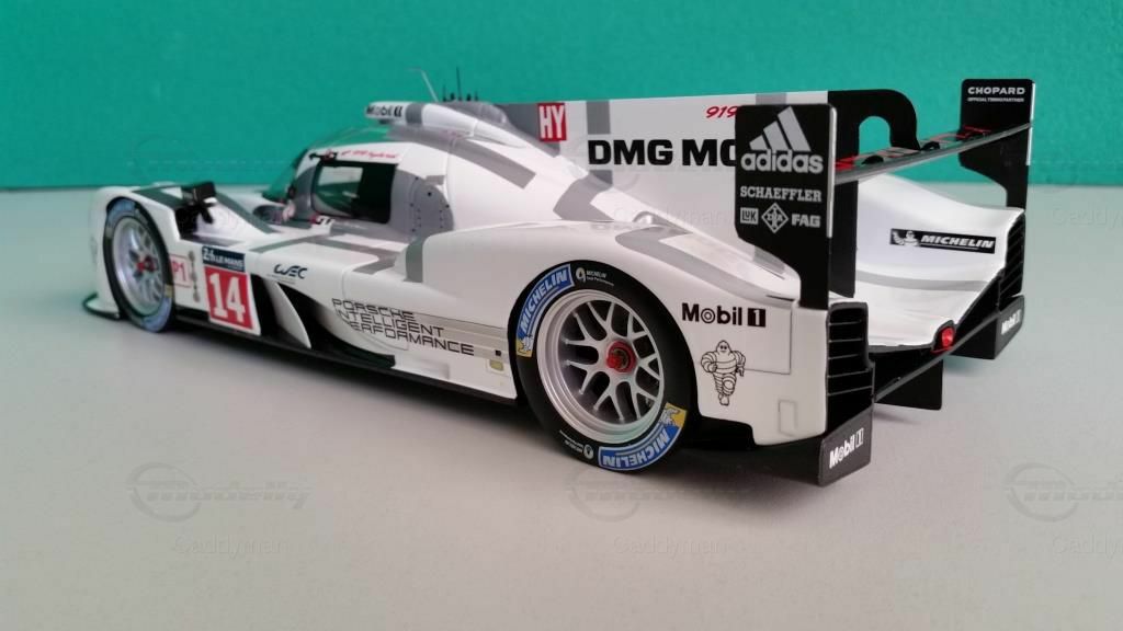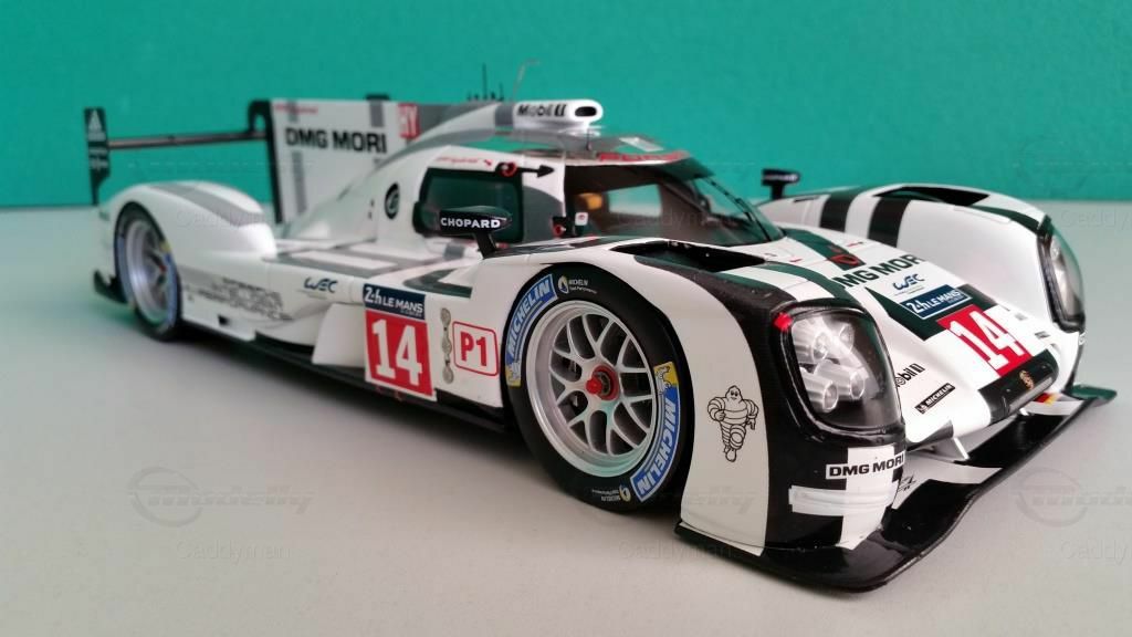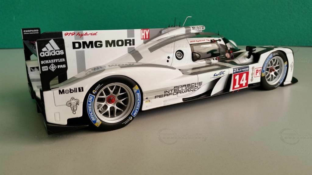 Ein Blick auf das Modell zeigt die detailgetreue Nachbildung des Originals inklusive der Sponsoren. Zu den prominenten Sponsoren, die auf dem Modellauto zu sehen sind, gehören DMG MORI, Chopard und Michelin. Diese Sponsoren hatten eine große Bedeutung für das Team und die Entwicklung des Autos. Das Design des Modells ist beeindruckend und spiegelt die Farben und die Formgebung des Originals wider. Der Porsche 919 Hybrid ist im charakteristischen Weiß mit schwarzen und grauen Akzenten lackiert, was ihm ein markantes und wiedererkennbares Erscheinungsbild verleiht.