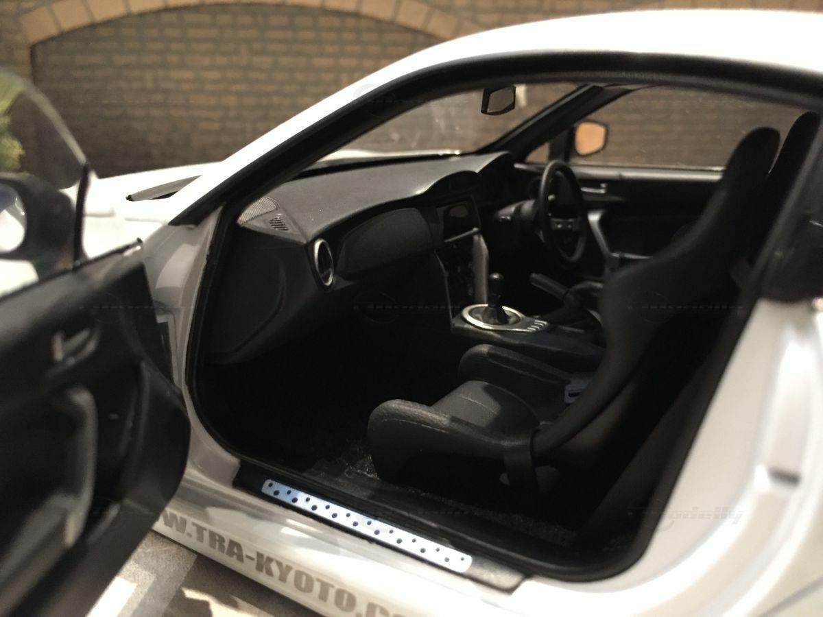 Dieses Modellauto ist im Maßstab 1:18 von AUTOart gefertigt, einem renommierten Hersteller von präzisen Miniaturautos. AUTOart ist bekannt für seine hohe Detailtreue und Qualität, was auch in diesem Modell deutlich sichtbar ist. Das Modell wurde aus Resin hergestellt, was eine hohe Detailgenauigkeit beim Abbilden feiner Strukturen ermöglicht. Zu den auffälligsten Merkmalen des Modells gehören die breiten Kotflügelverbreiterungen, die charakteristisch für den Rocket Bunny Umbau sind. Die Frontschürze mit integriertem Splitter und der massive Heckspoiler unterstreichen die aggressive Optik des Fahrzeugs. Der Schriftzug "Rocket Bunny" und das Logo von TRA-Kyoto, dem Unternehmen hinter diesem Bodykit, sind deutlich auf der Seite des Modells zu sehen.