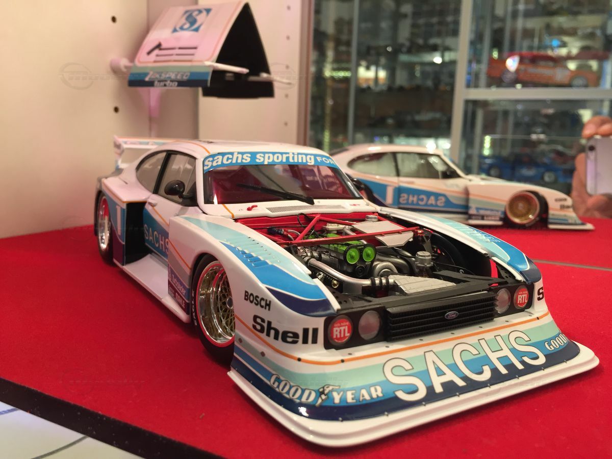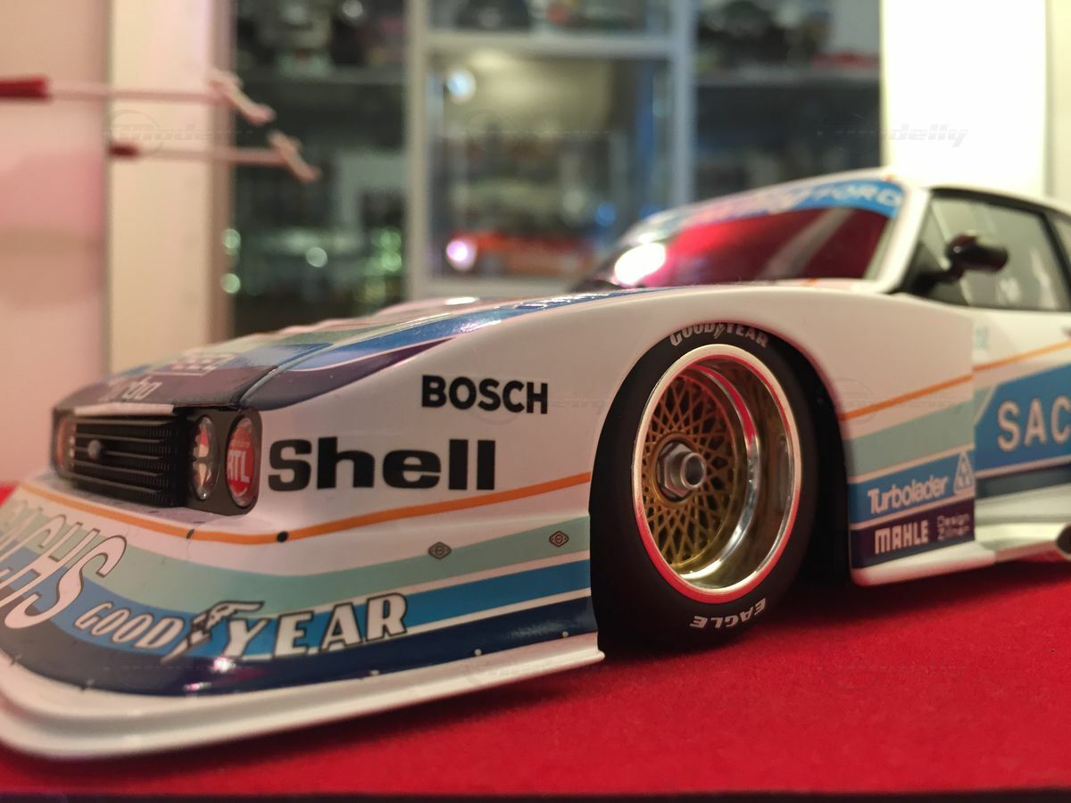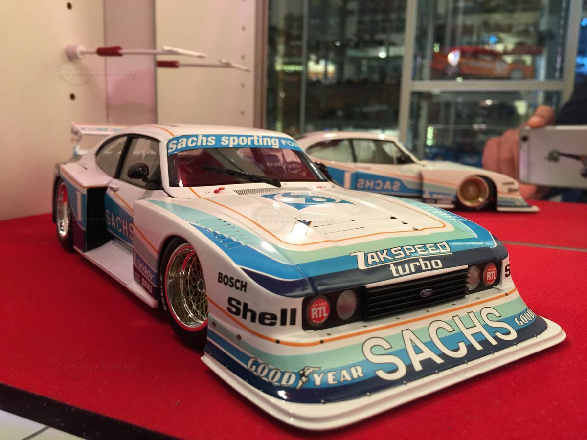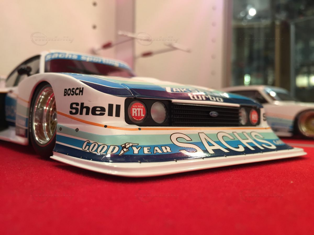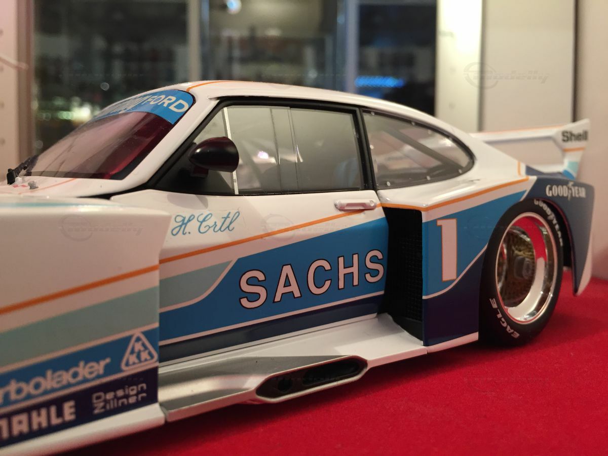 Das Modell des Ford Capri Turbo Gruppe 5 von Minichamps im 1:18-Maßstab ist ein echtes Highlight für jeden Sammler. Die perfekte Nachbildung und die detailgetreue Verarbeitung machen es zu einem begehrten Stück für Liebhaber historischer Rennfahrzeuge. Die matte und glänzende Oberfläche der Lackierung, kombiniert mit den akribisch aufgebrachten Sponsoren-Logos, verleihen dem Modell ein authentisches Aussehen. Besonders die auffällige "SACHS"-Beschriftung und die anderen Sponsoren-Logos wie Good Year und Shell stechen ins Auge und betonen die Herkunft dieses Rennboliden im historischen Motorsport. Jede einzelne Komponente des Modells – von der aerodynamisch gestalteten Front bis hin zum großen Heckspoiler – wurde mit Präzision und Liebe zum Detail gefertigt. Dieses Modell, das auf den Fotos gut zu erkennen ist, bietet Sammlern die Möglichkeit, ein Stück Motorsportgeschichte in die eigene Sammlung aufzunehmen.