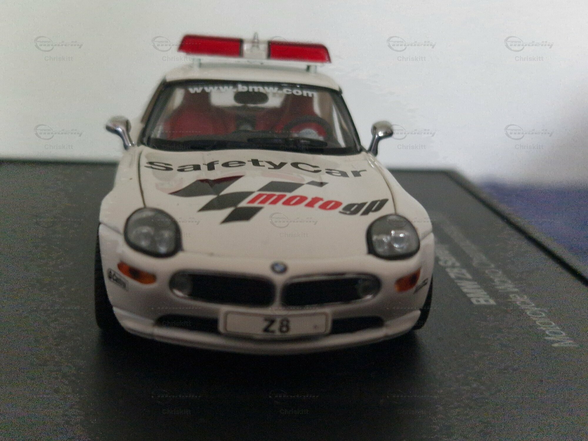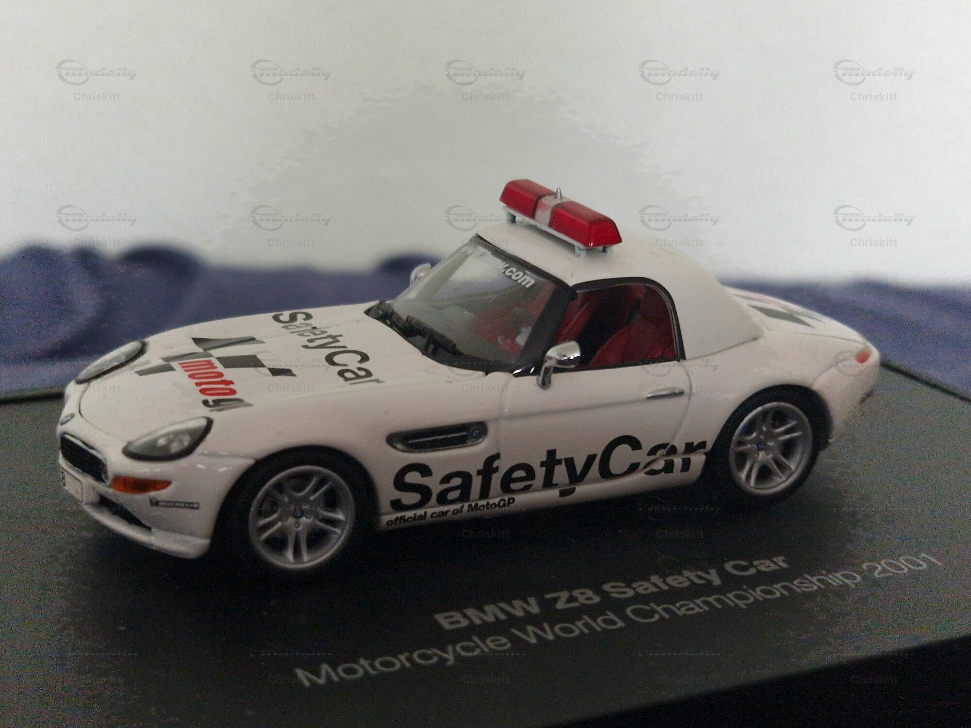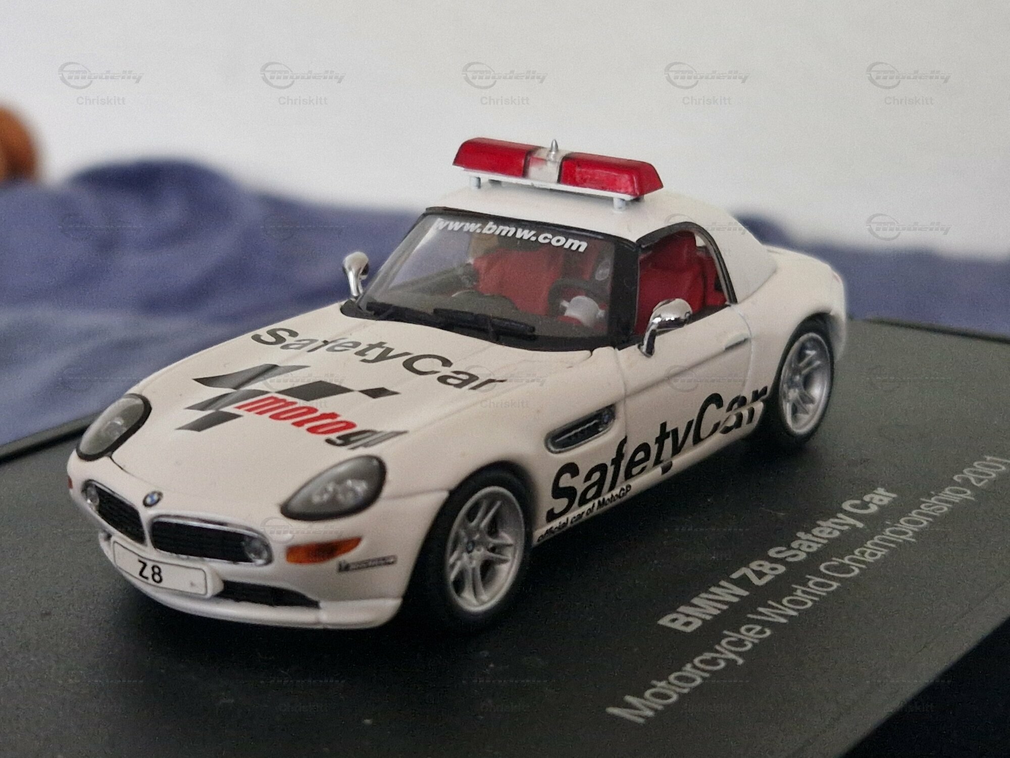 Das Miniaturmodell des BMW Z8 MotoGP Safety Car in 1:43 Maßstab von Modelly Mitglied Chriskitt, verkörpert viele Details des Originals. Minichamps hat diese Miniatur in einer limitierten Auflage von nur 2000 Stück weltweit produziert, was sie besonders wertvoll für Sammler macht. Diese exklusive Edition ist aus hochwertigem diecast Material gefertigt und präsentiert sich in detailgetreuer Ausführung. Die Karosserie des Modells ist im klassischen Weiß gehalten und trägt die originalen Safety Car Kennzeichnungen, einschließlich der Motorsport-Logos und Notfalllichtern auf dem Dach.
