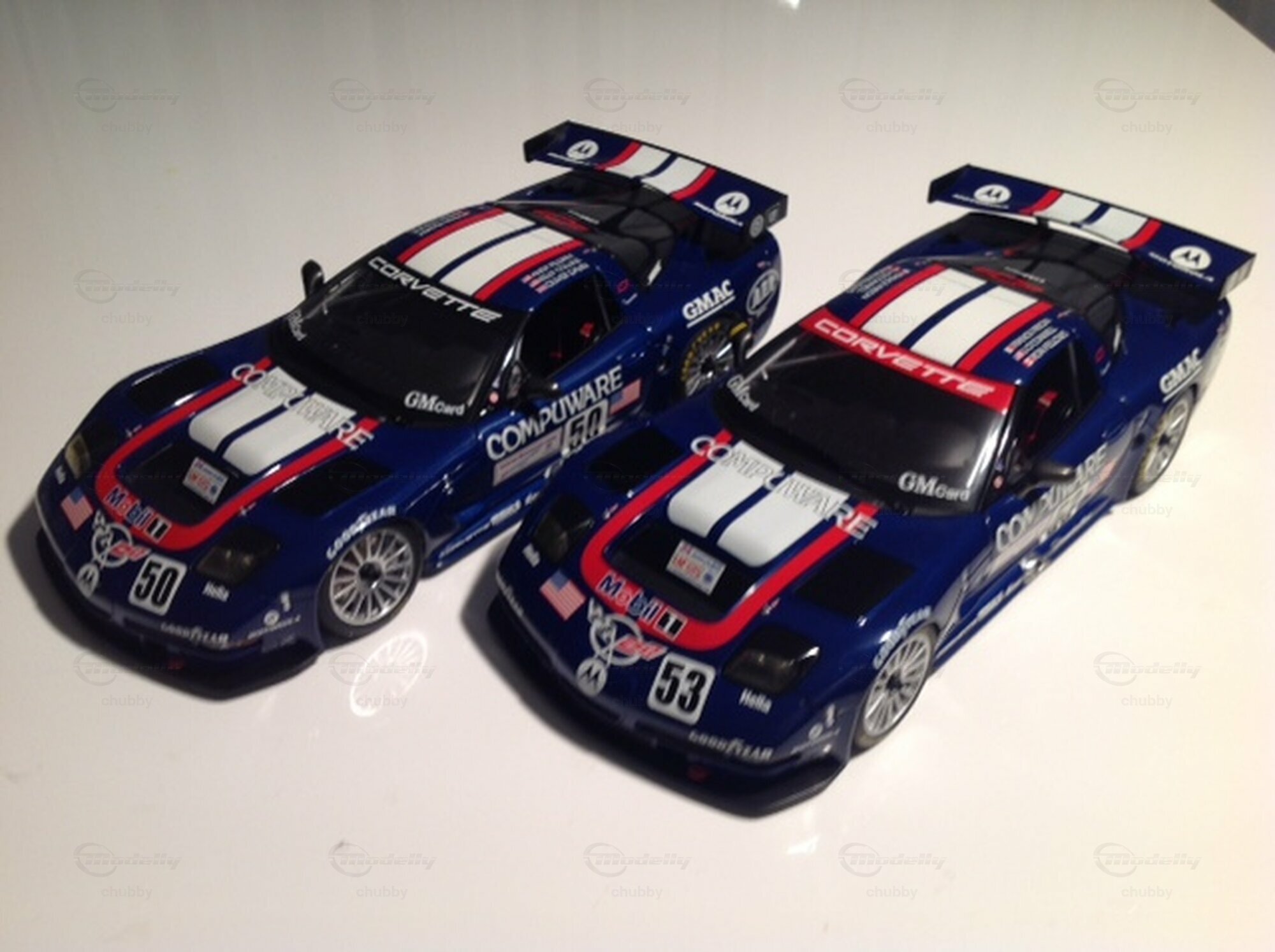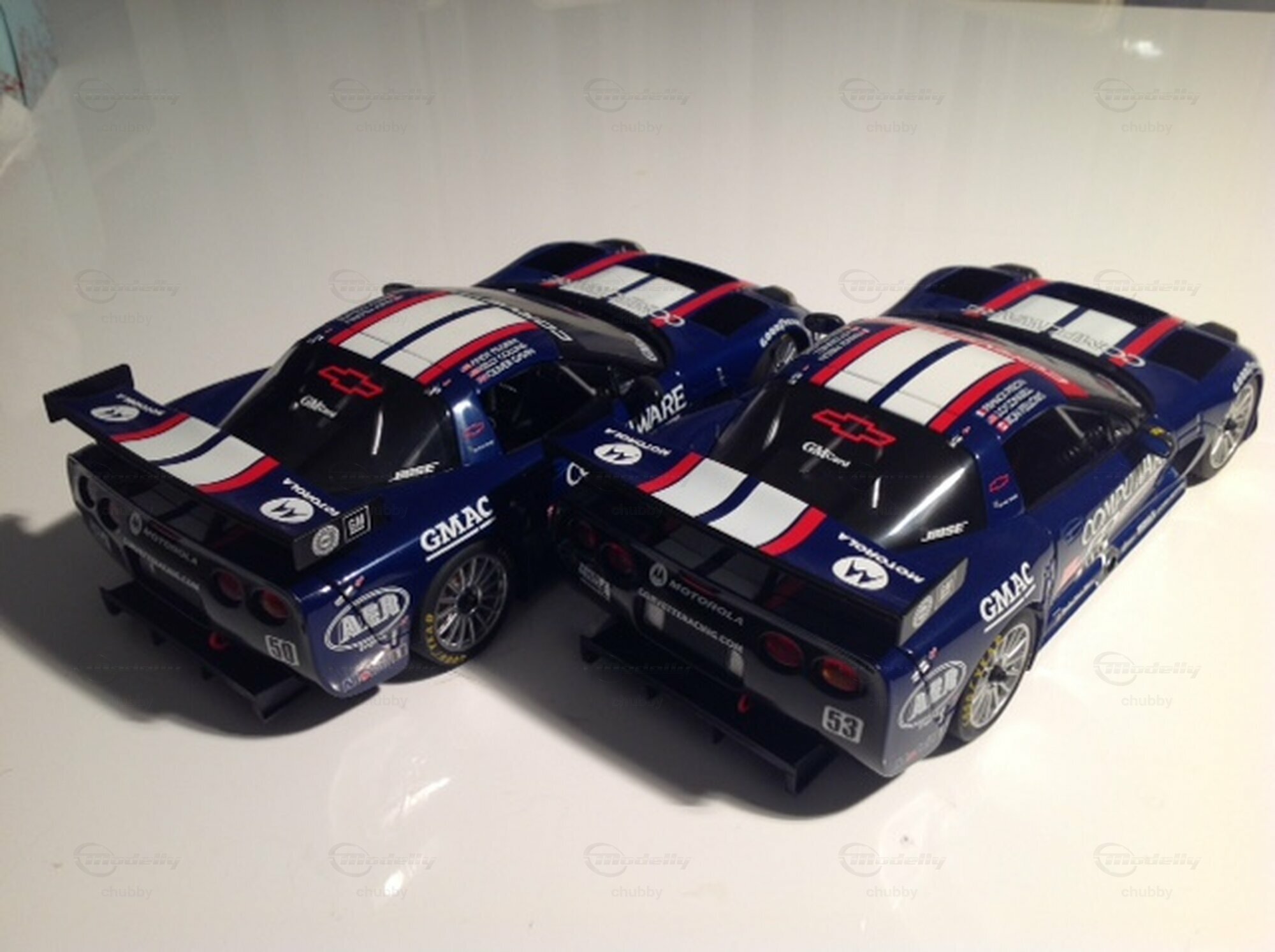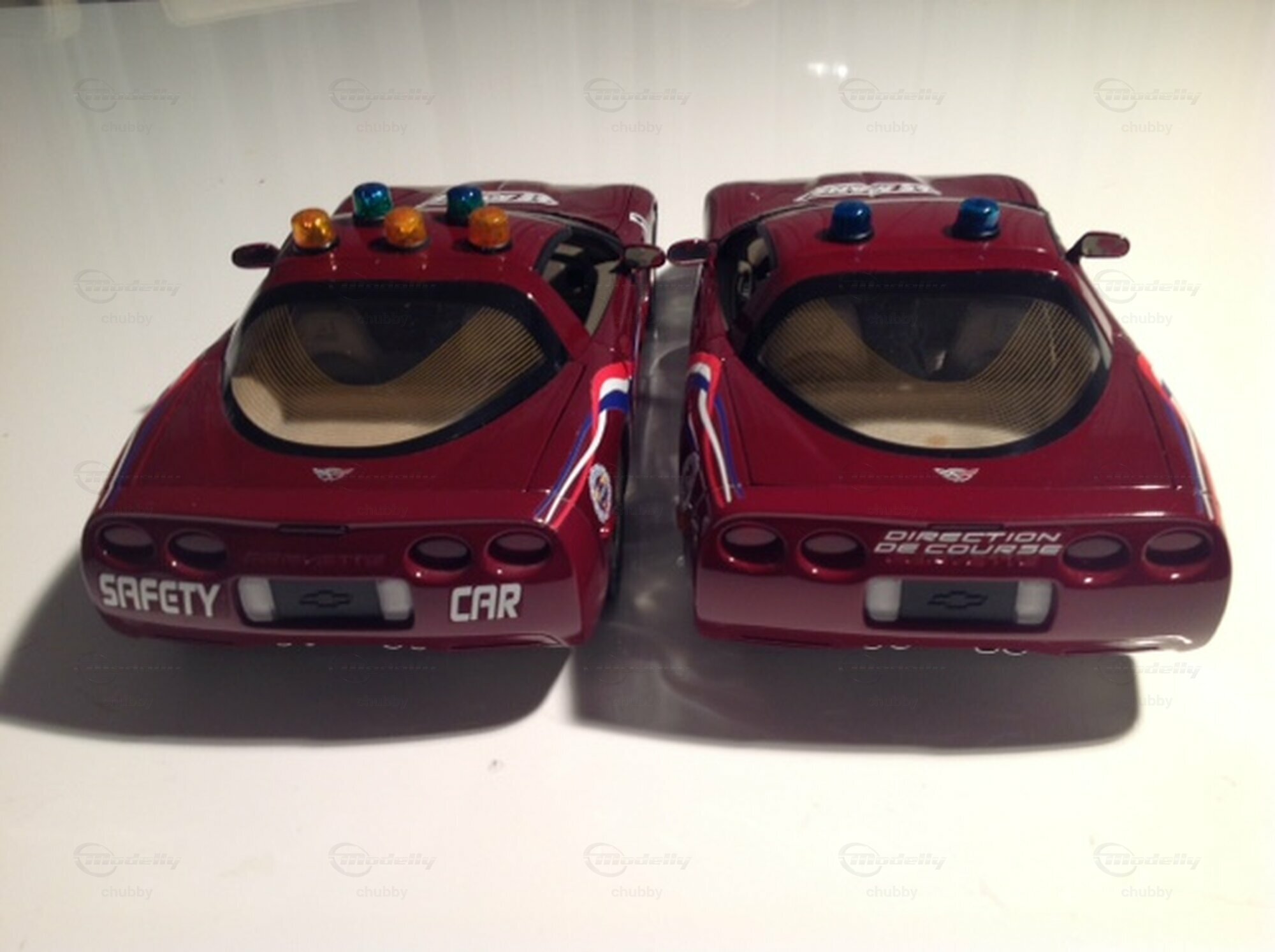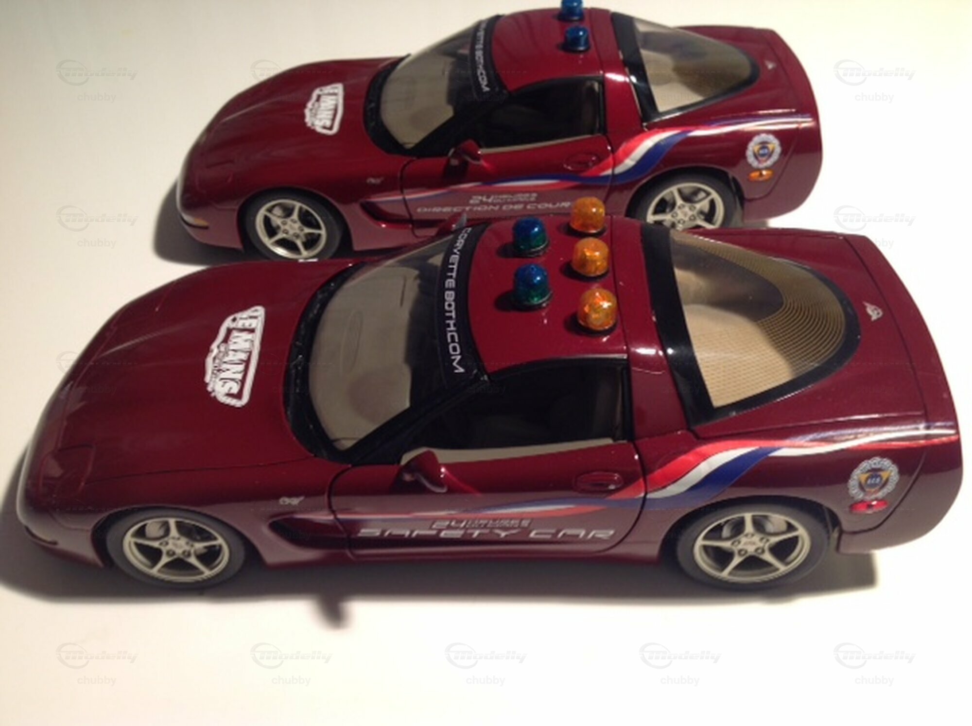 2003 heisst 50 Jahre Corvette. Am 24-Stunden-Rennen von Le Mans dieses Jahres waren, was nicht allen Corvette-Fans bekannt ist , vier, nicht nur zwei Fahrzeuge beteiligt. Da waren natürlich die beiden als Ehrung des Gastgeberlandes Frankreich im wunderschönen Trikolore-Outfit gestalteten Rennfahrzeuge mit den Startnummern 50 und 53 (diese Ziffern stehen natürlich für 50 Jahre Corvette bzw. für den Corvette-Beginn im Jahr1953; in den anderen C5R-Jahren waren die Werks-Vetten immer gelb und trugen immer die Nummern 63 und 64) . Da waren aber auch auch noch zwei weinroten Corvette- "Begleitfahrzeuge": das Safety Car bzw. Pace Car und das Auto der Rennleitung. Ironie des Schicksals: Im Jahr 2003 siegte in der GTS-Kategorie in Le Mans fast ausnahmsweise keine der beiden Corvetten, sondern ausgerechnet ein von einem englischen Team eingesetzter knallroter Ferrari 550 Maranello (s. letztes Bild)! Da sahen die Fahrer der beiden zweit- und drittplatzierten Vetten und auch alle Verantwortlichen und Mitarbeiter von "Corvette Racing" im doppelten Sinne rot! Und wie kam ich zu den Modellen der beiden "Begleitfahrzeuge"? Ein Sammlerkollege hatte die zur Umwandlung nötigen Decals und klebte sie für mich auf zwei weinrote C5 2003 Jubiläumsmodelle von AUTOart. Die zwei bzw. fünf Dachleuchten machte er selber.