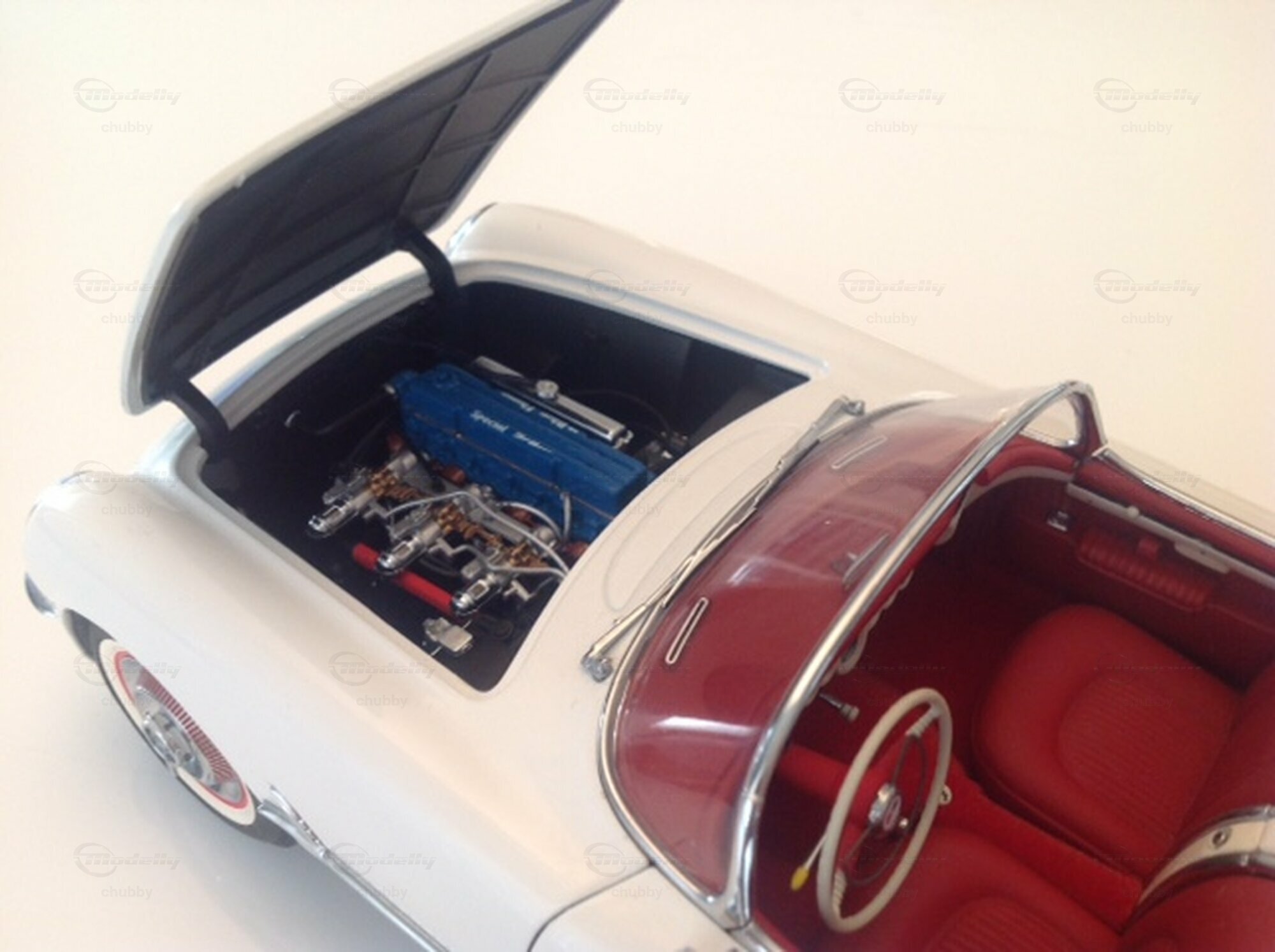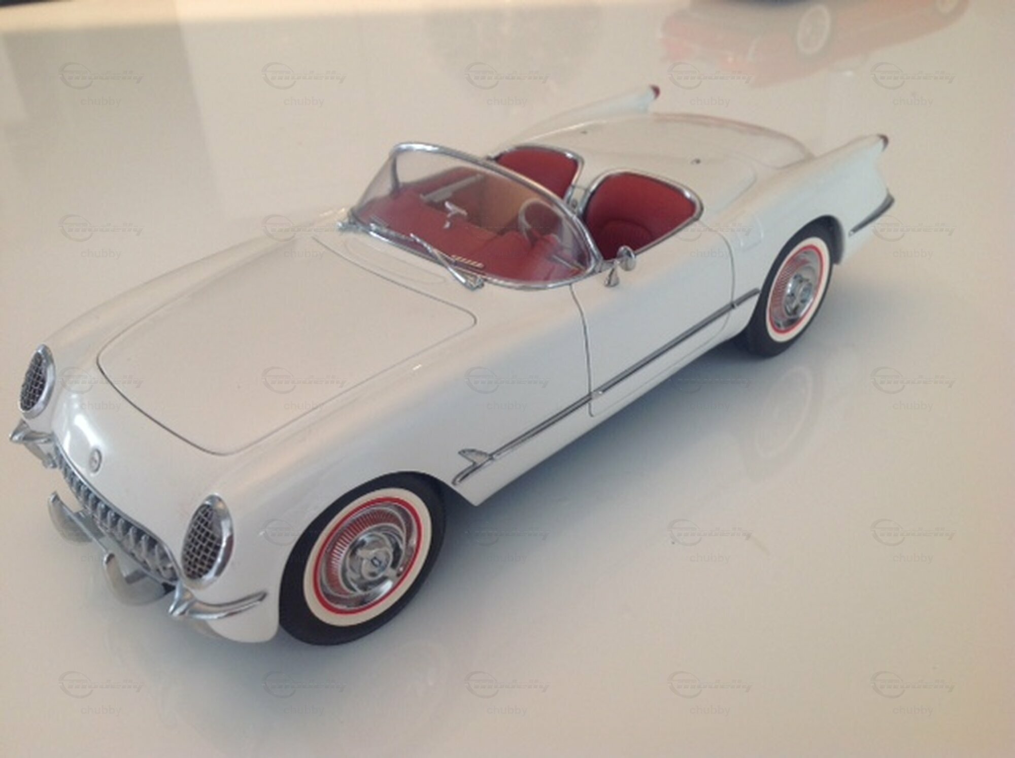 Anlässlich der Präsentation meiner Modelle von AUTOart gehen wir zeitlich zurück bis zum Beginn der nunmehr 73jährigen Corvette-Historie. Die hier gezeigte 1953 präsentierte "Ur-Corvette" gab es nur in Weiss und nur als Cabrio. Im zweiten Jahr konnte der Käufer dann unter verschiedenen Farben wählen. In den ersten zwei Jahren wurde das Auto von einem "Blue Flame" genannten Reihensechszylinder Motor angetrieben. Dieser war für einen Sportwagen zu "schwach auf der Brust". Die kräftiger motorisierte ausländische und auch inländische Konkurrenz (Ford Thunderbird) veranlasste GM, die Corvette ab dem Jahr 1955 mit einem bulligen V8-Aggregat zu bestücken. Die schönsten 1:18-Modelle der C1 Corvetten stammen von AUTOart. So auch dieses weisse Teil und alle anderen hier noch folgenden bis zum Jahrgang 1962.