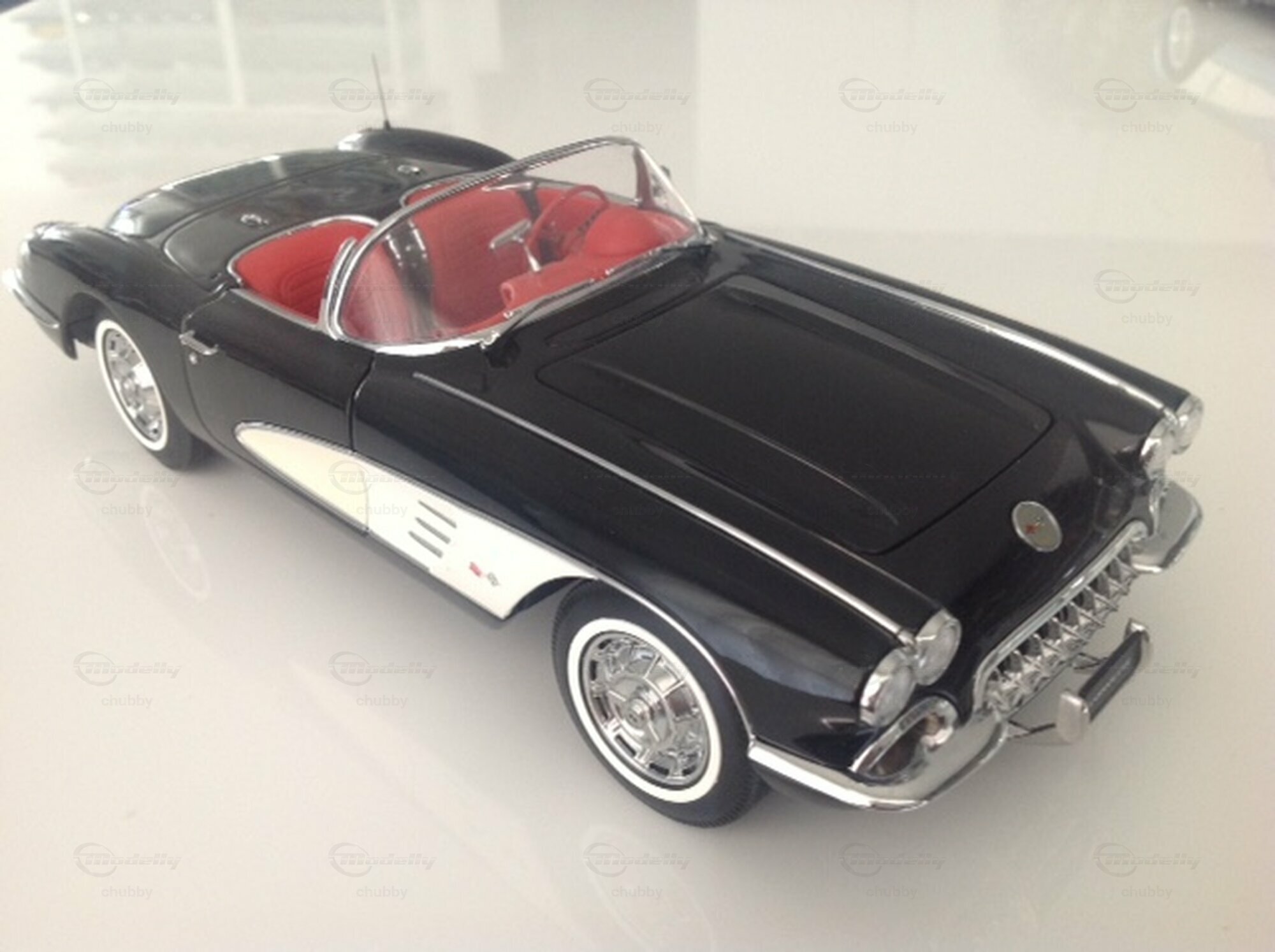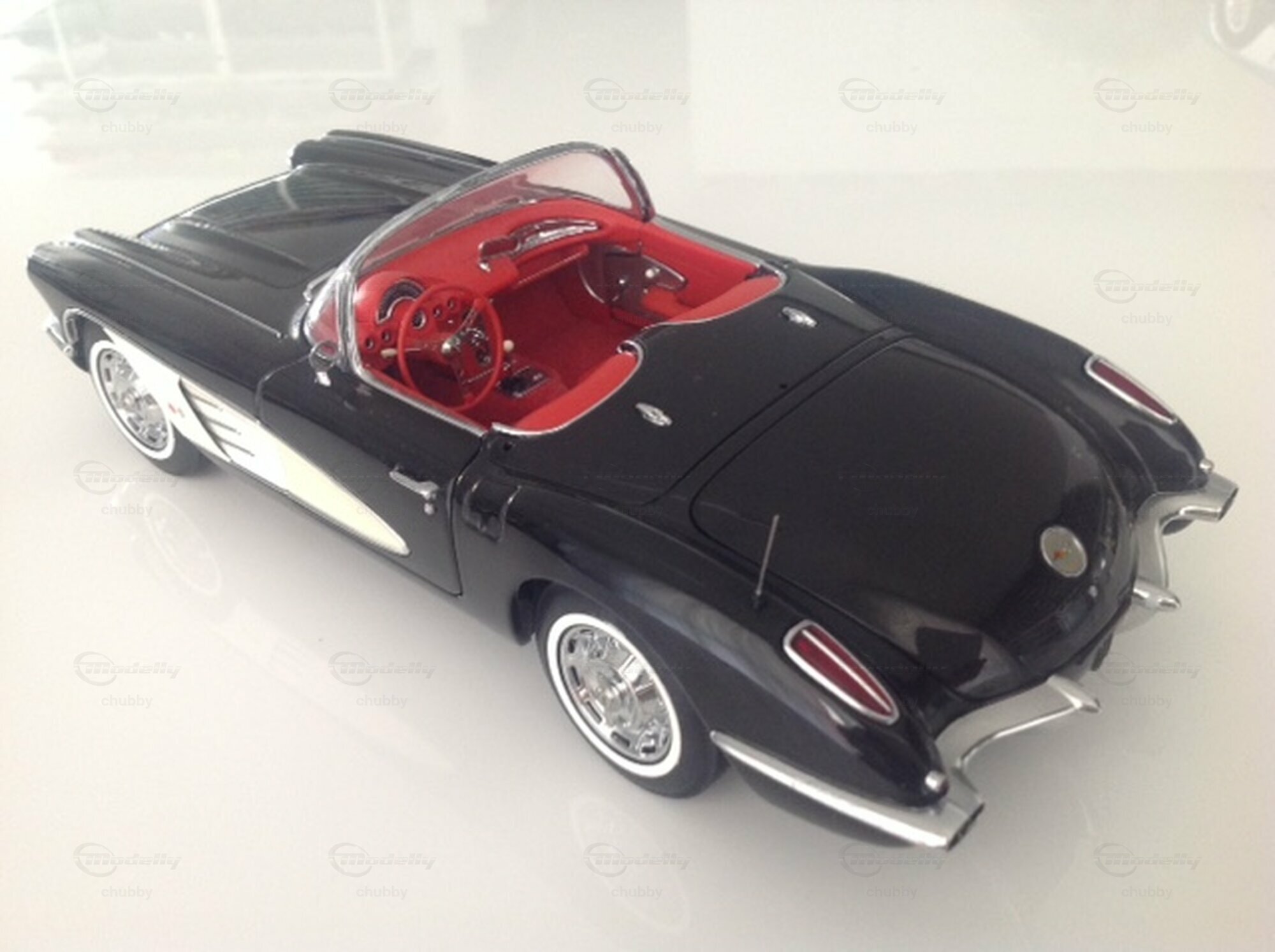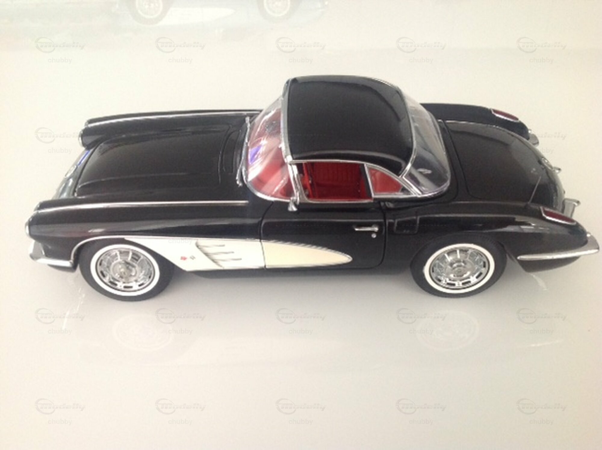 Die Jahrgänge 1959 und 1969 zeichnen sich durch eine schlichtere (weniger Chrom, weniger Rillen und Rippen) und damit elegantere Gestaltung der Haube und des Hecks aus. Hier ein schwarz-weisses Modell des Cabriolets mit Hardtop von AUTOart.