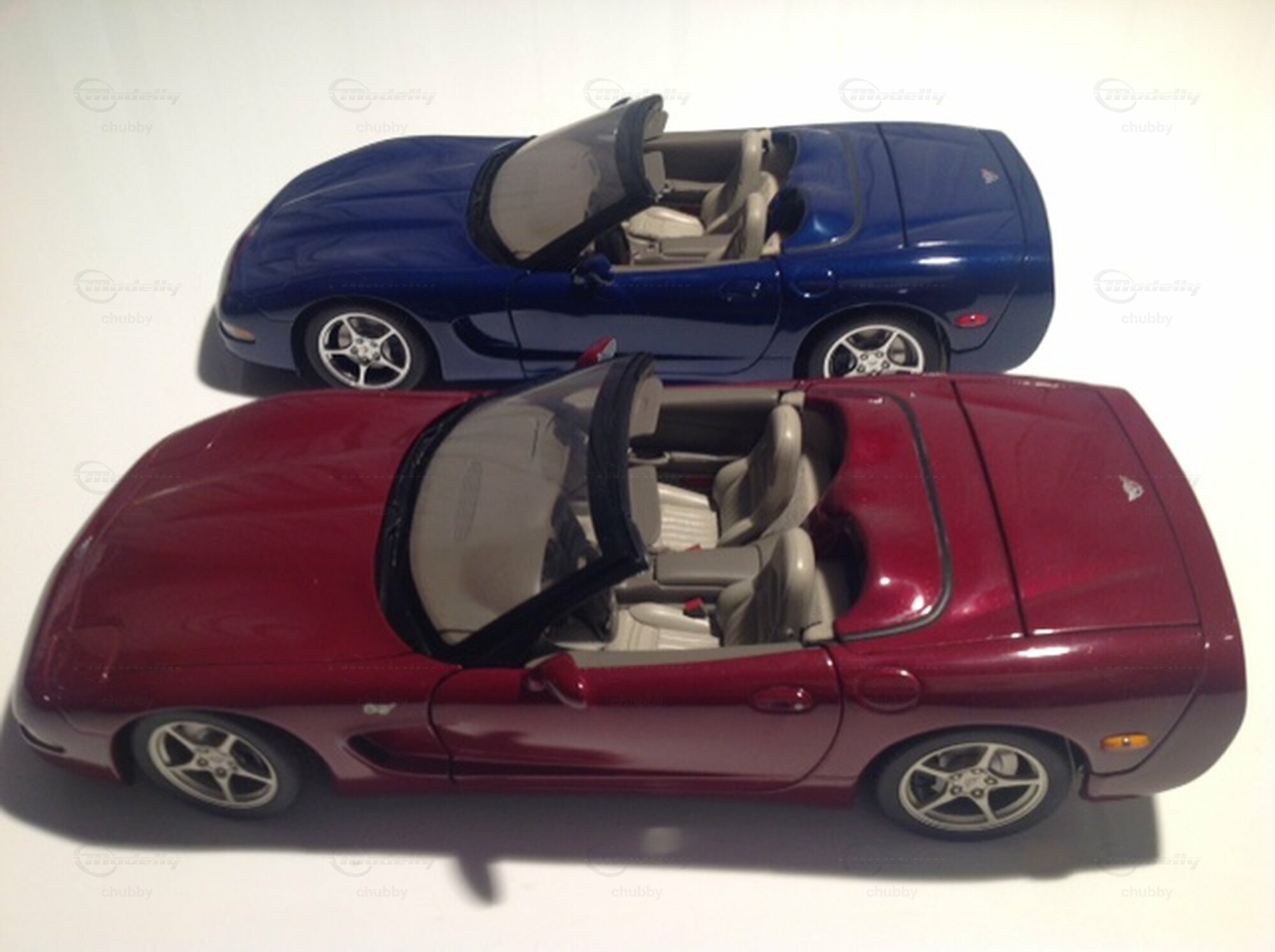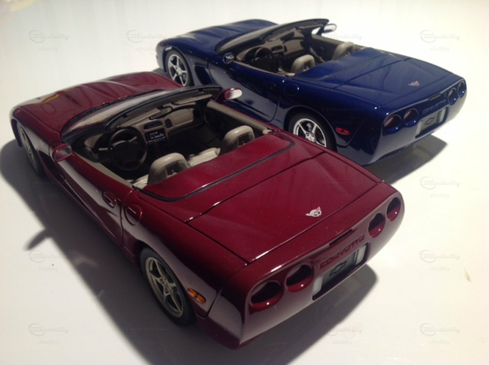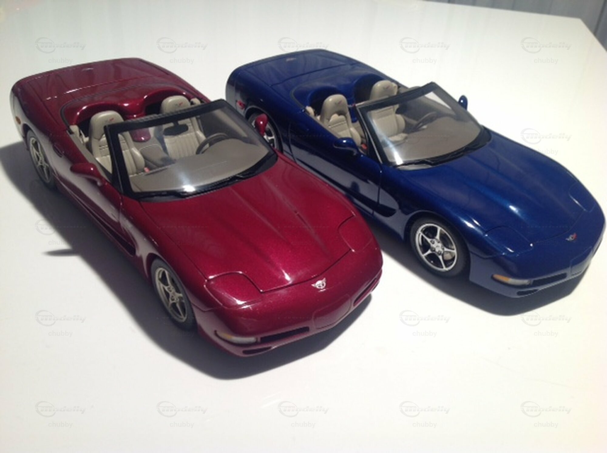 Hier seht ihr zwei elegante C5 Cabrios, eines der Anniversary Edition zugehörig (Kastanienblau, 2003) , das andere der Commemorative Edition (Blau, 2004). Die beiden Modelle stammen von AUTOart.