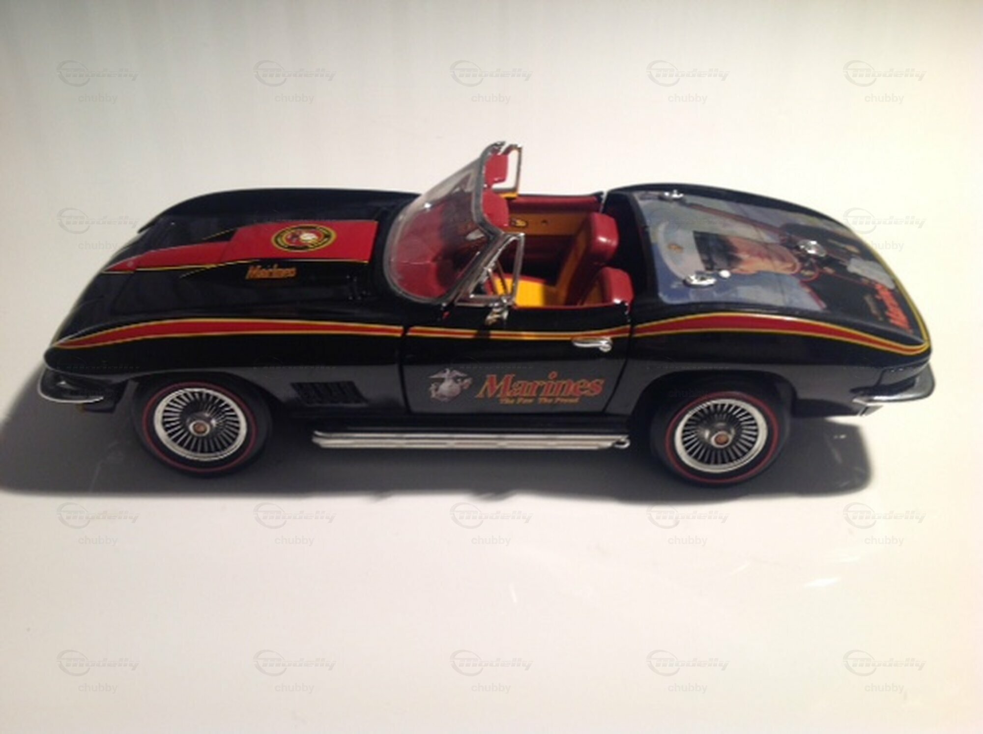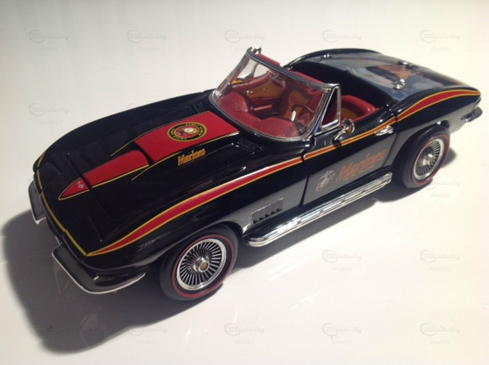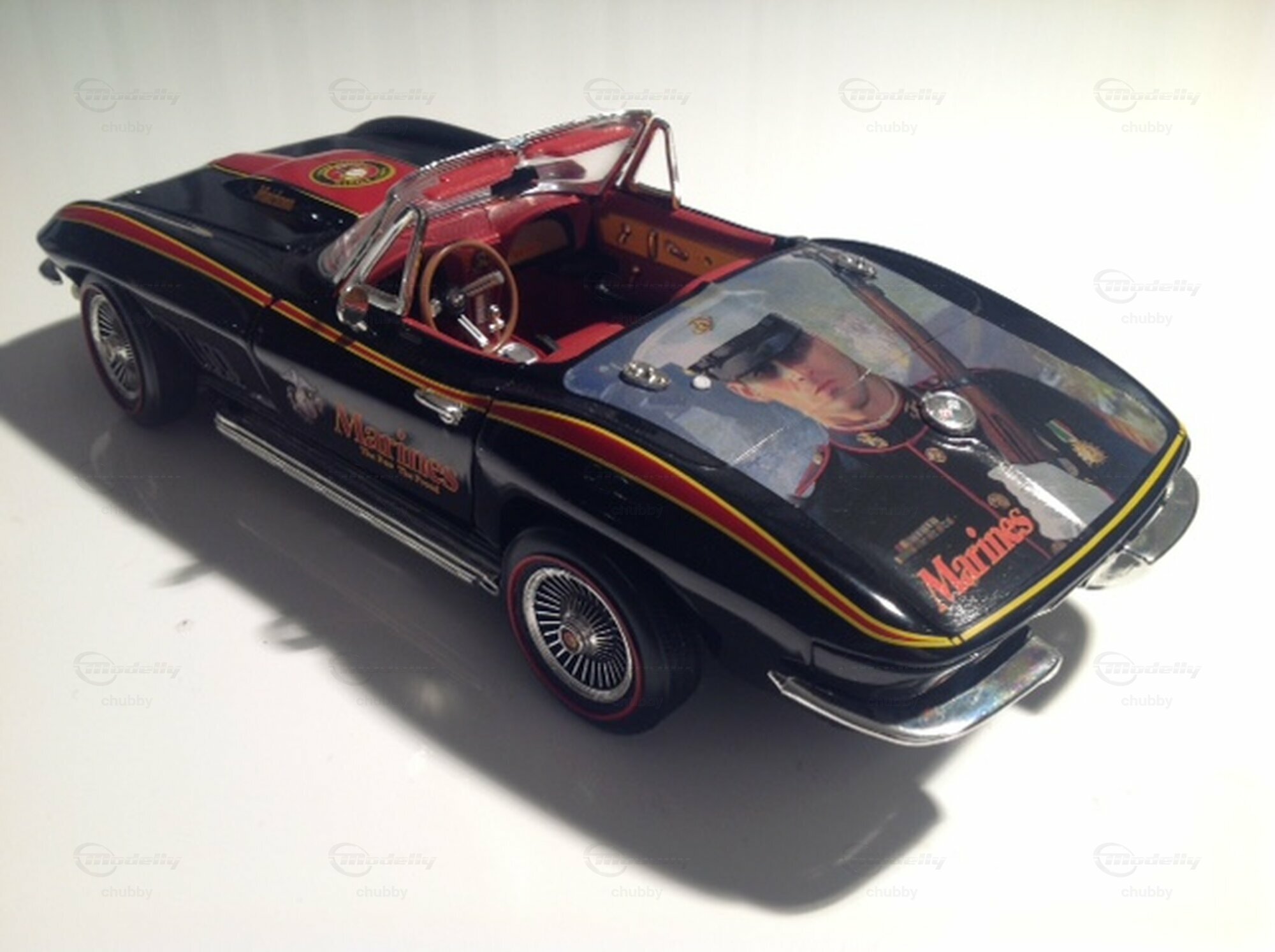 Mit der #614 Split Window ex-aequo klassiert, ist das hier vorgestellte Modell weniger bekannt als das oben genannte blaue Renn-Coupé. Aber das schmucke C2 1967 Big-Block Cabriolet "Marines",  welches Ertl zu Ehren des US Marines Corps herausgab, ist noch seltener zu finden. Meines Wissens gingen alle Exemplare dieses Modells ursprünglich ausschliesslich an Soldaten der genannten militärischen Elitetruppe. Nur  wenige fanden später den Weg in den öffentlichen Markt. Wir haben hier einen echter Hingucker bzw. Eye-Catcher!