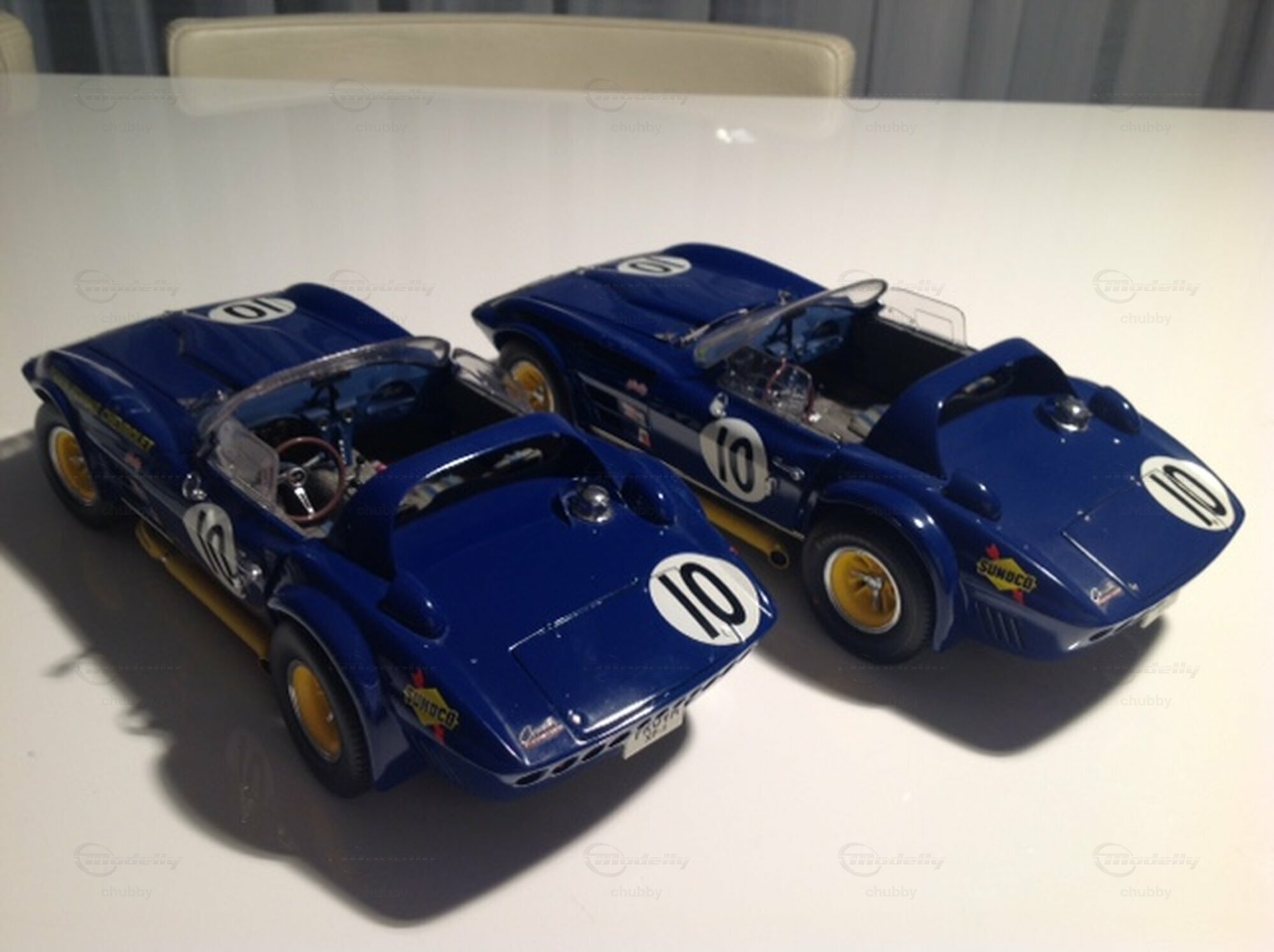 Und nun befassen wir uns mit den beiden zu offenen Rennwagen umgebauten C2 Grand Sport Autos und Modellen. Das blaue Fahrzeug mit der Nummer 10 gehörte zum Penske-Rennstall und wurde 1966 mit Roger Penske und Dick Guldstrand als Fahrern in Sebring eingesetzt, aber sie kamen nicht weit. die Grand Sport-Episode näherte sich dem Ende. Exoto machte von diesem blauen Auto gleich zwei Modelle, je eines in der "Pre-Race-Livery" und in der "Race-Livery". Die Unterschiede sind auf den hier angefügten Bildern leicht zu erkennen. Am auffälligsten ist die Tatsache, dass man für das Rennen den Penske-Schriftzug überdeckte. Weshalb ist mir ein Rätsel. Leider ist der Lack beider Modelle teilweise von Paint Rash (Zinkfrass, Zinkpest) befallen, aber noch stört es nicht allzu sehr.