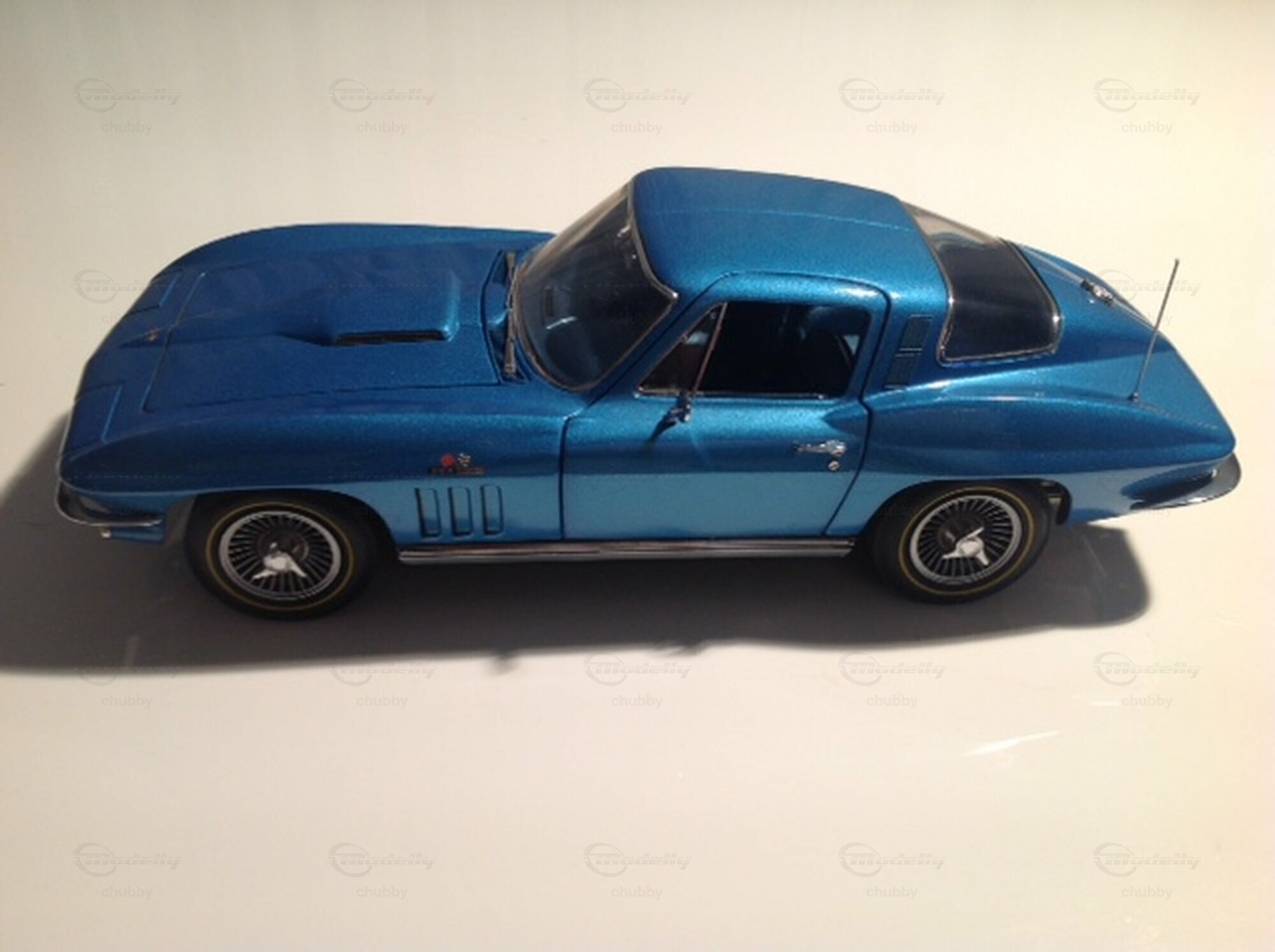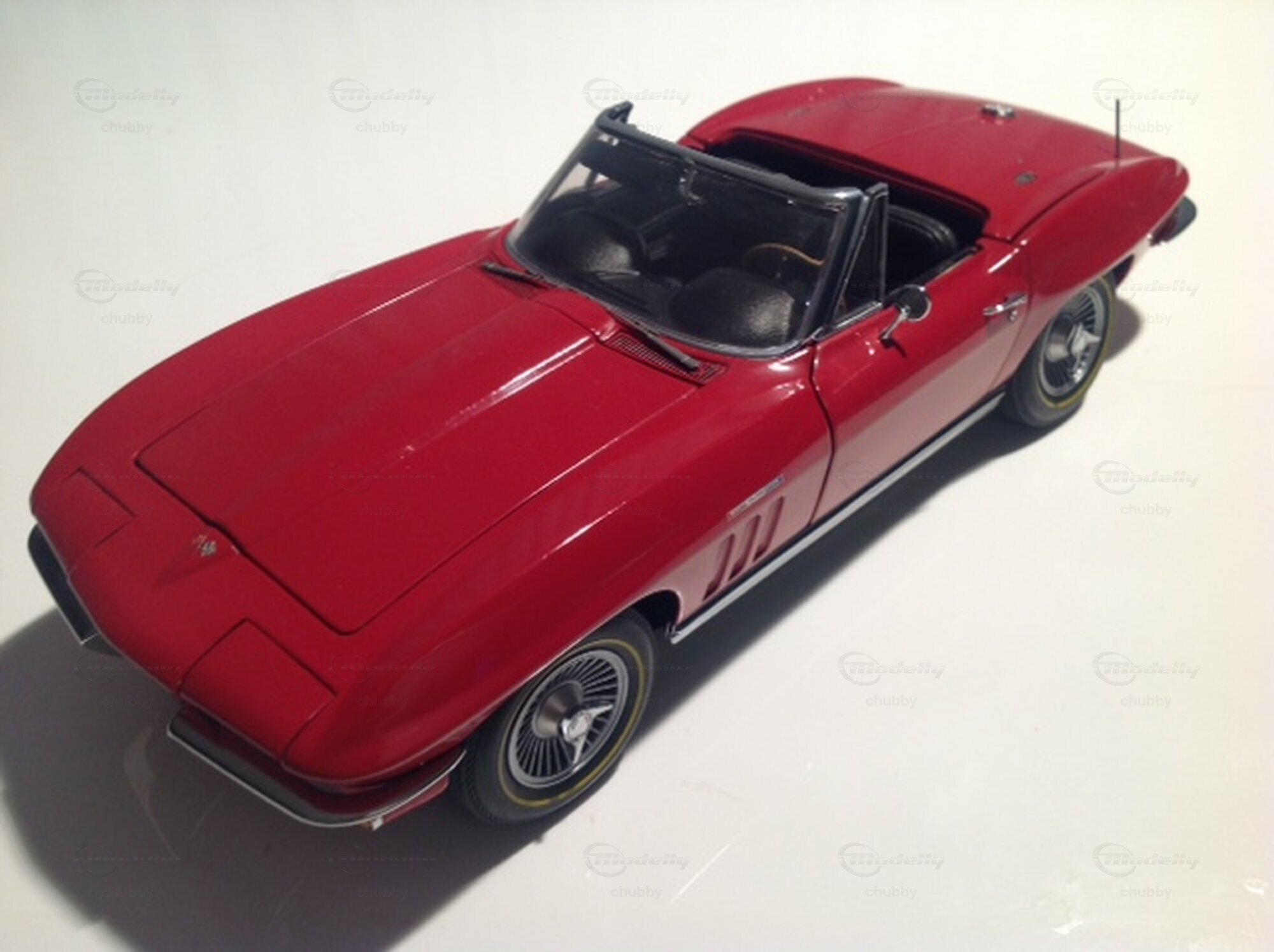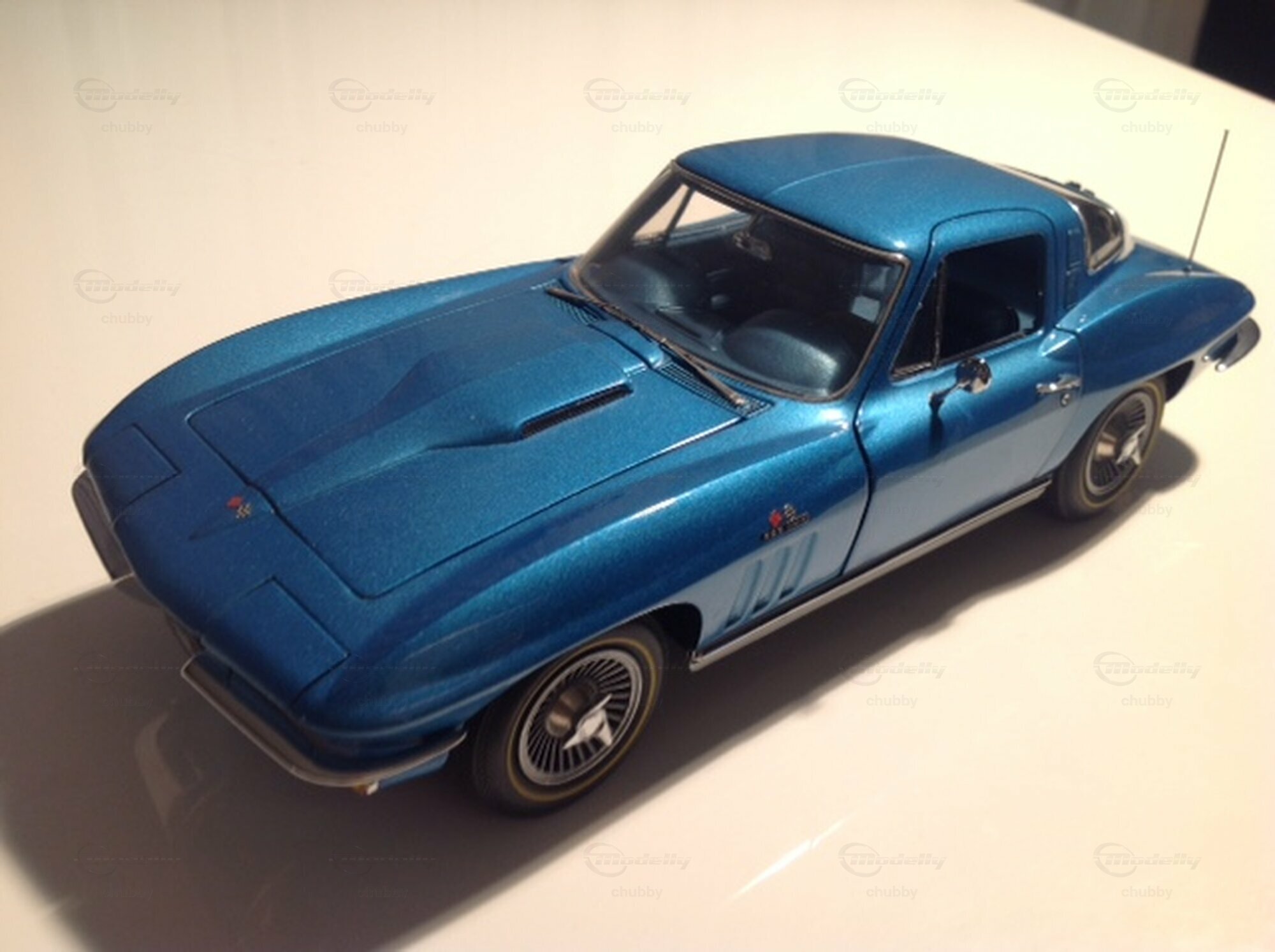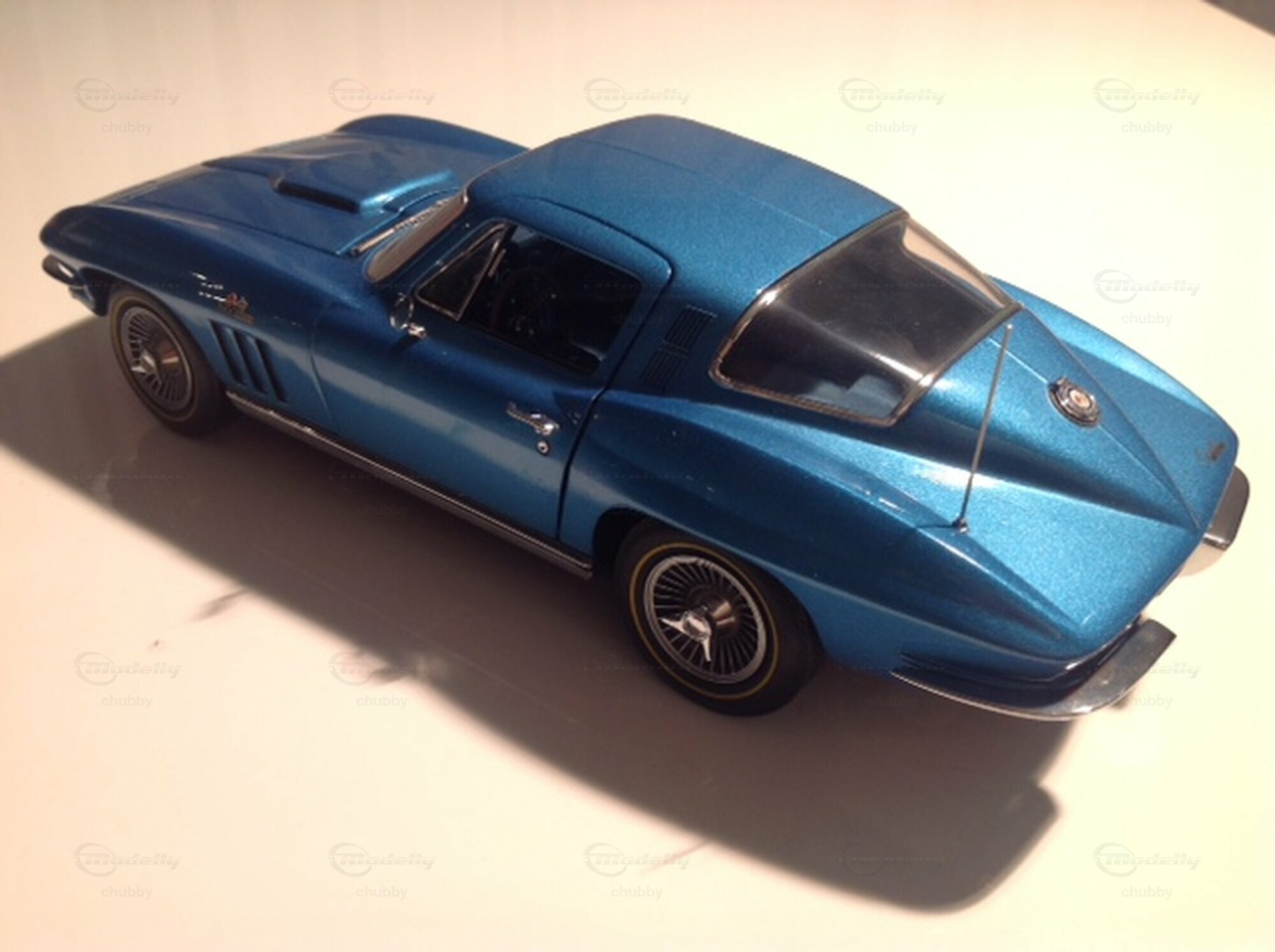 Wisst ihr, dass GMP "fremdging"? Sogar zweimal! Sie machten zwei  Corvetten, nämlich zwei Versionen der C2 des Jahres 1965: einmal ein rotes 1965 Small Block-Cabrio und einmal ein blau metallisiertes Big Block-Coupé desselben Jahrgangs. Bei beiden kann man alles Mögliche bewegen, abmontieren und wieder daran tun, was natürlich interessant tönt, aber eigentlich nicht nötig wäre. Es sind ja keine Spielzeuge für Kinder! Das Cabrio leidet meistens, wenn nicht immer unter "paint rash" (interkristalline Korrision, oft unschön "Zinkpest" oder "Zinkfrass" genannt). Mein Exemplar leider auch. Normalerweise dulde ich das nicht in meiner Sammlung, aber ein GMP Cabrio - wie auch ein GMP Coupé -  ist so selten geworden, dass man froh sein muss, eines zu besitzen. Beim Coupé hingegen ist der Lack tadellos. E s ist ein wahres Meisterstück!
