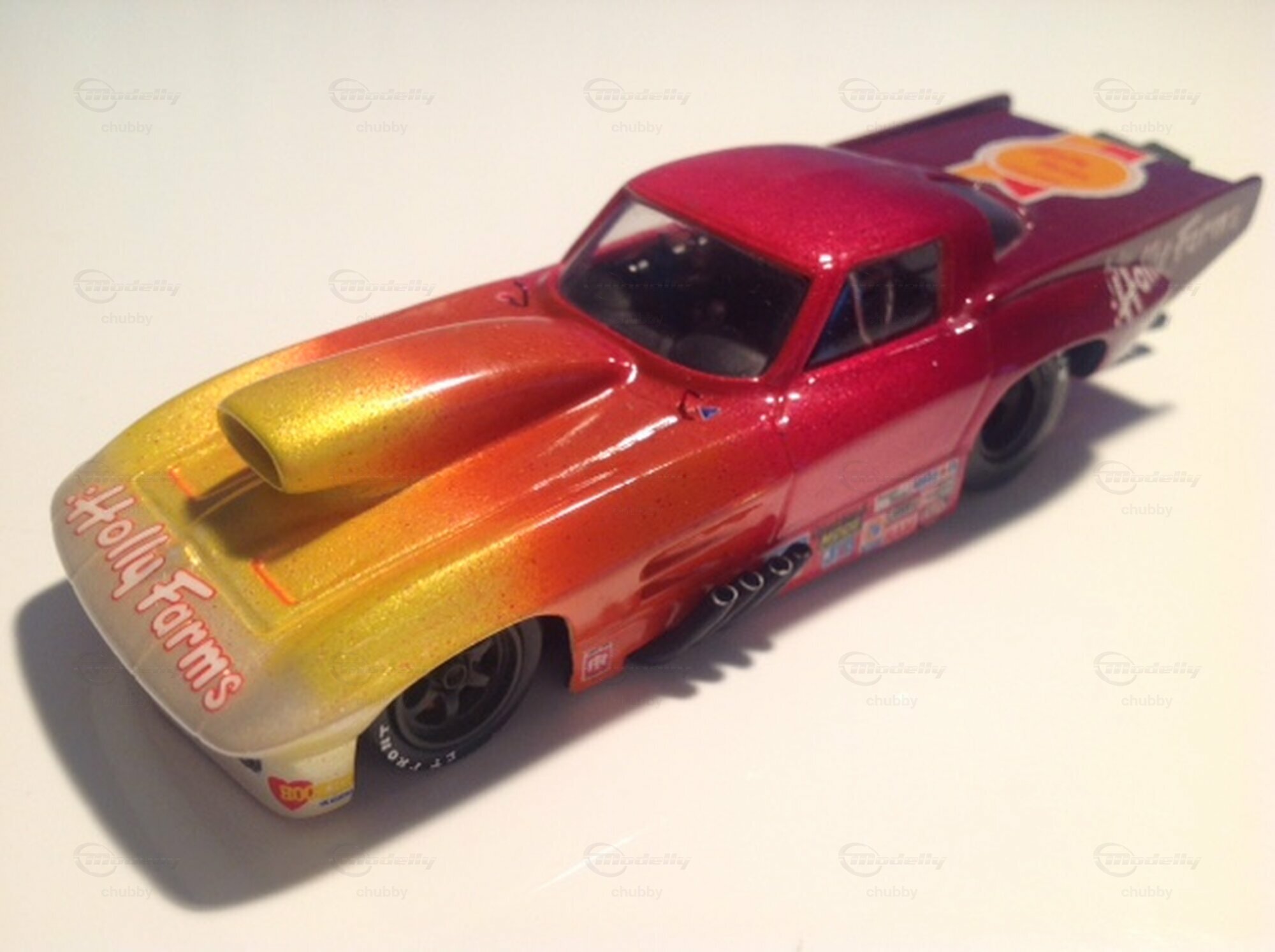Die Pro-Mod Dragster sehen insgesamt besonders abenteuerlich aus. So auch die C2 Corvetten. Hier die bunte "Holly Farms"-Variante.