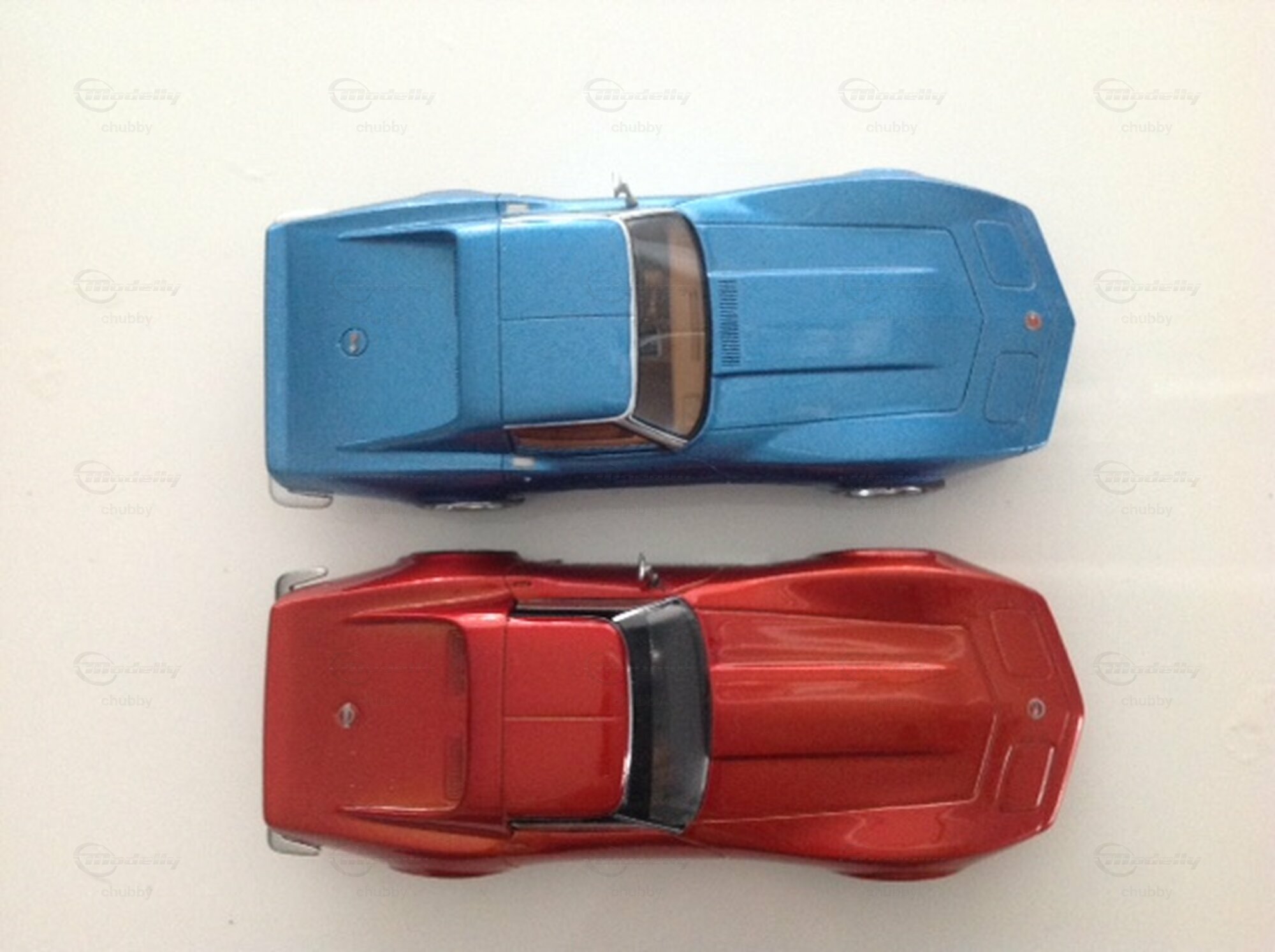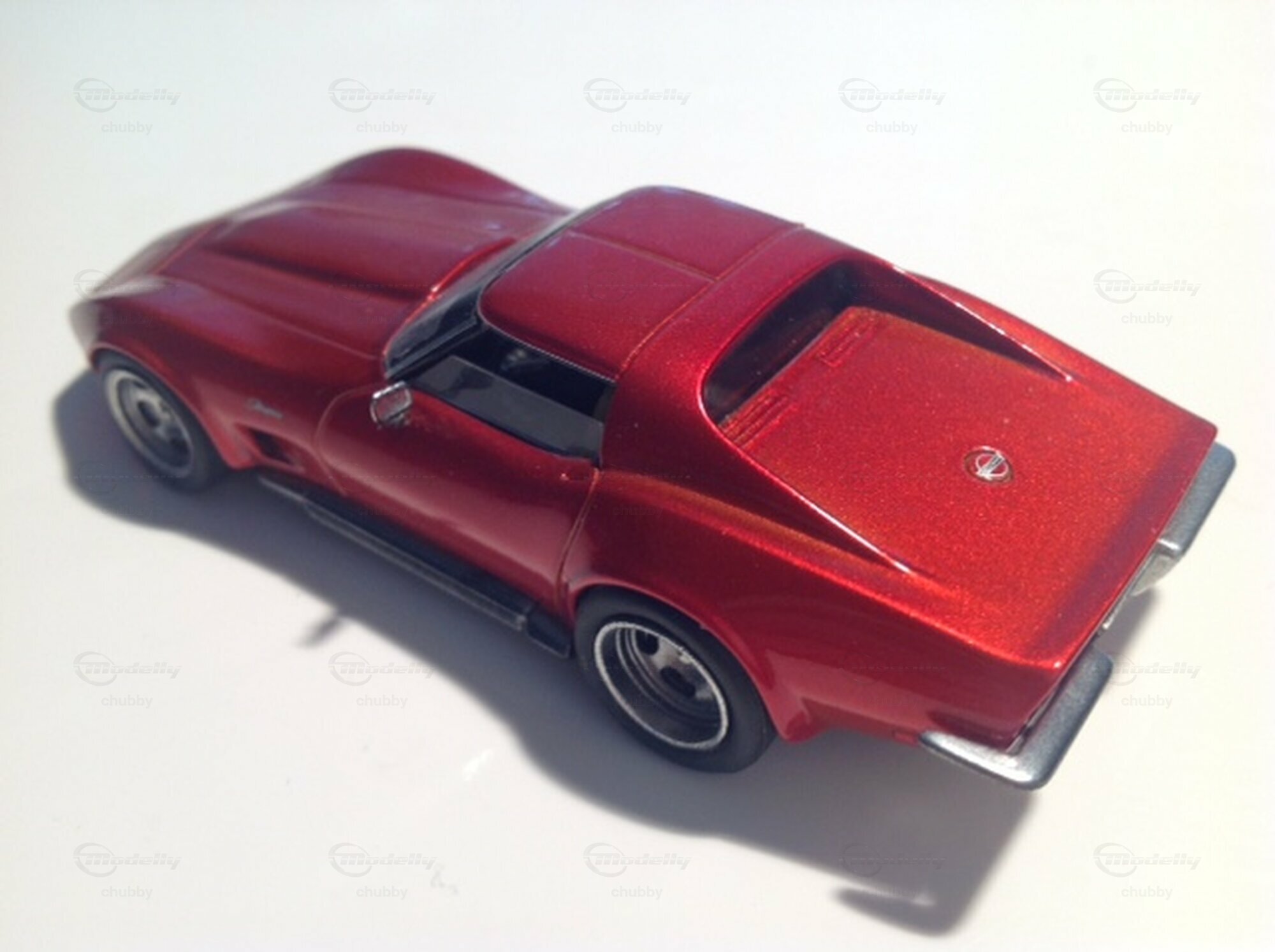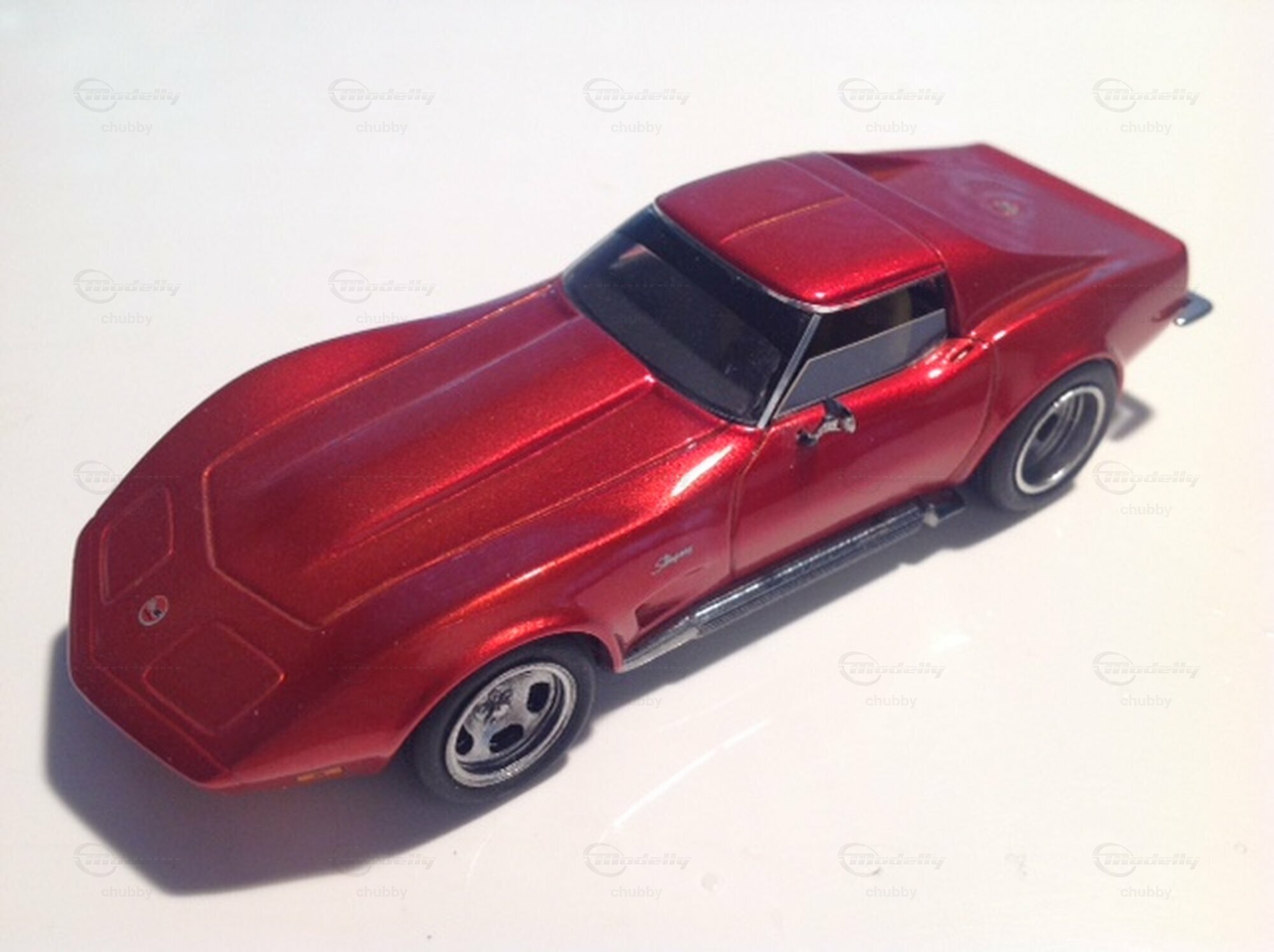 Es dauerte lange, bis ein vernünftiges 1:43-Modell der C3 1973 (Übergangsjahrgang: vorne neu, hinten alt) auf dem Markt erschien. Dann machte NEO ein oranges Cabriolet und BoS ein blaues Coupé, beide allerdings mit einem grossen Makel: Zuhinterst waren diese zwei Modelle viel zu breit und ohne den typischen "Hüftschwung" (s. die beiden letzten Fotos, wo sie neben je einem entsprechenden Modell von Kentucky Legend stehen). Beim BoS-Coupé kann man angesichts des günstigen Preises noch ein Auge zudrücken, beim recht teuren Cabriolet von NEO hingegen nicht. Rigo erkannte die Lücke und machte zahlreiche wunderschöne 1973er Vetten mit korrekter Linienführung: Coupés, Cabrios, Custom, Widebody, Landspeed, Dragster...) . Hier ein schönes Coupé in metallisiertem Candyrot.