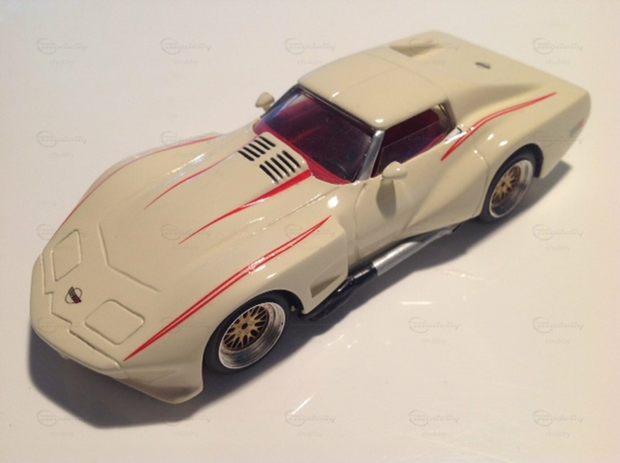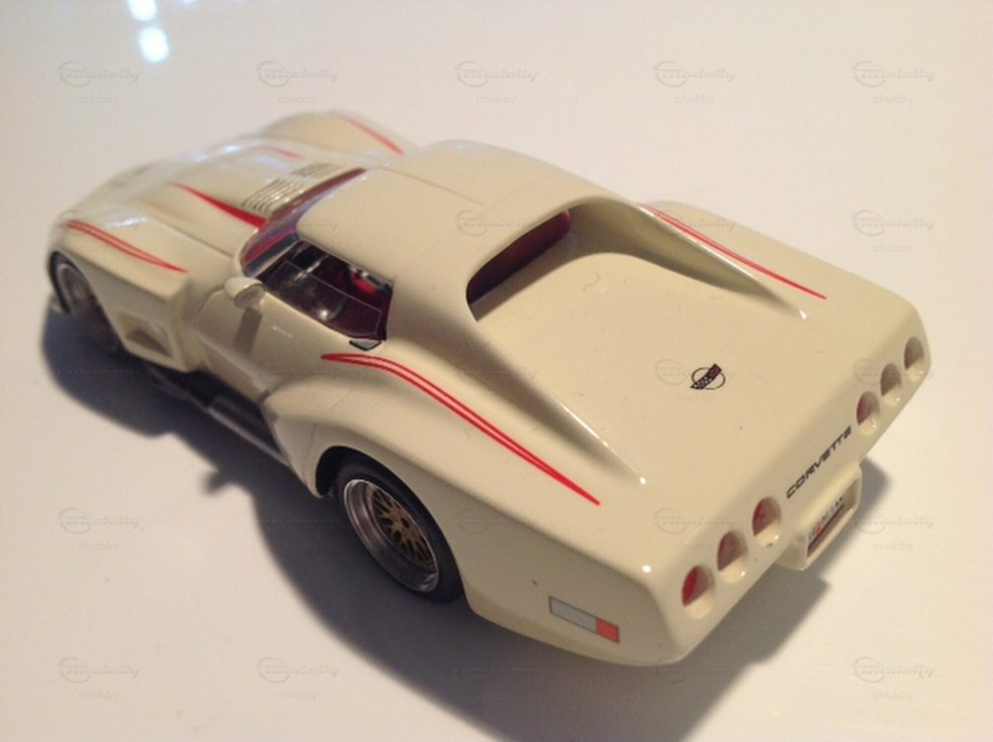 Es folgen jetzt 15 Kentucky Legend-Modelle der ultrabreiten C3 Greenwood-Serie Can-Am, nämlich 5 Coupés, 5 Cabriolets, 3 Wagons und 2 Speedsters. John Greenwoods Team machte nur wenige Autos dieser Art, Rigo hingegen viele unterschiedliche Modelle dav on. Das markante Kennzeichen eines Greenwood Can Am sind die sechs (statt vier) Heckleuchten. Hier haben wir als erstes Modell ein weisses Greenwood Can-Am Coupé.