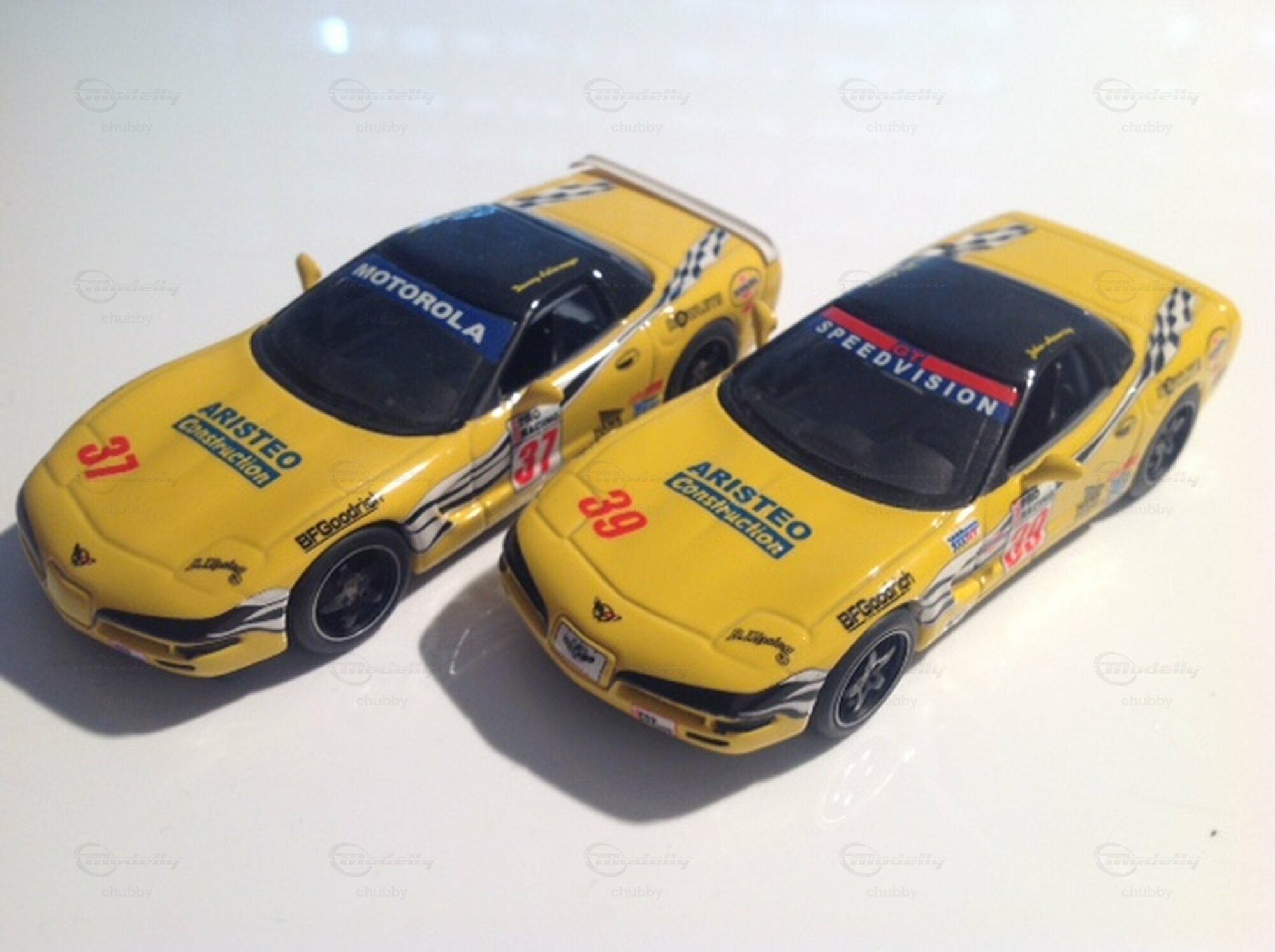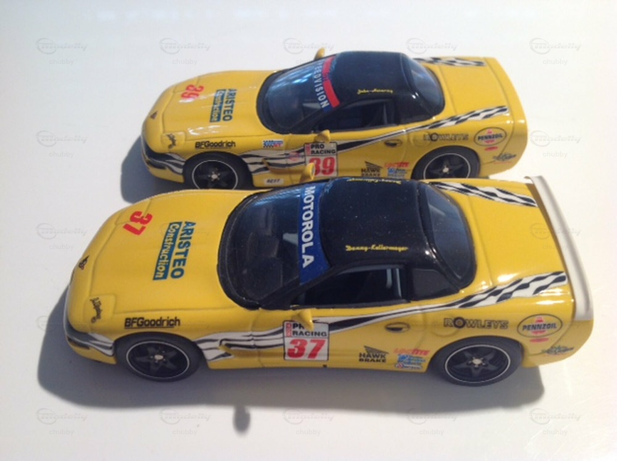 Wir kommen zu vier Kentucky Legend-Modellen von C5 Hardtop Renn-Corvetten, welche in einer US-Rennserie eingesetzt wurden. Motorola war der Sponsor der Serie und Speedvision übertrug die Rennen. Hier zwei gelbe Schwestermodelle: die #37 von Danny Kellermeyer und die #39 von John Heimrieg.