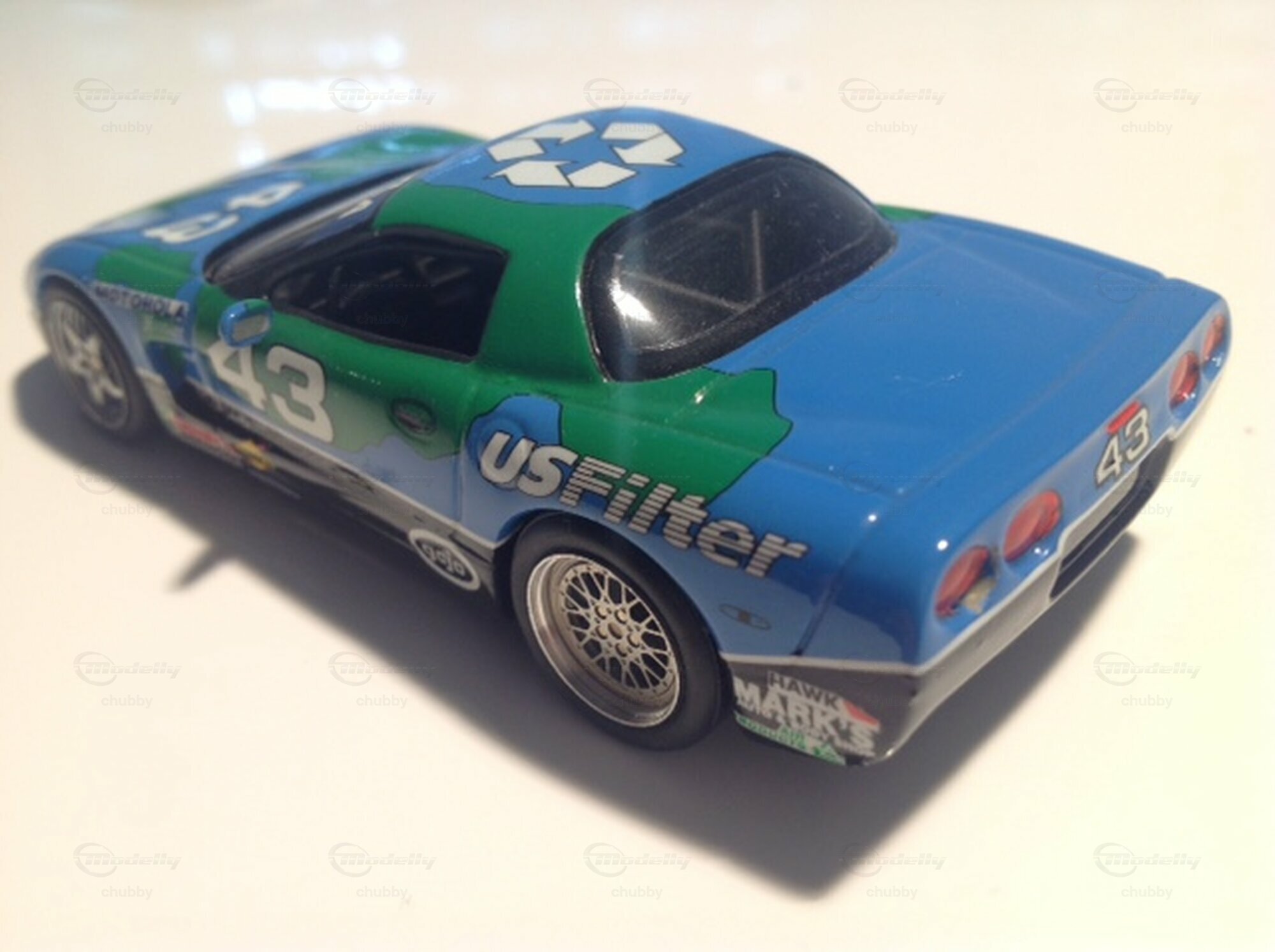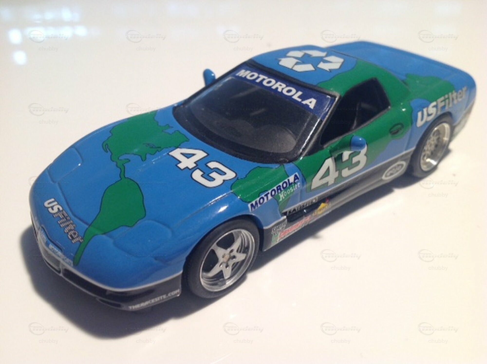 Die blau-grüne C5 "Planet Earth" mit der Nummer 43 fuhr auch am Motorola Cup. Es gibt das Modell in 1:18 von Apycars und in 1:43 von Kentucky Legend.