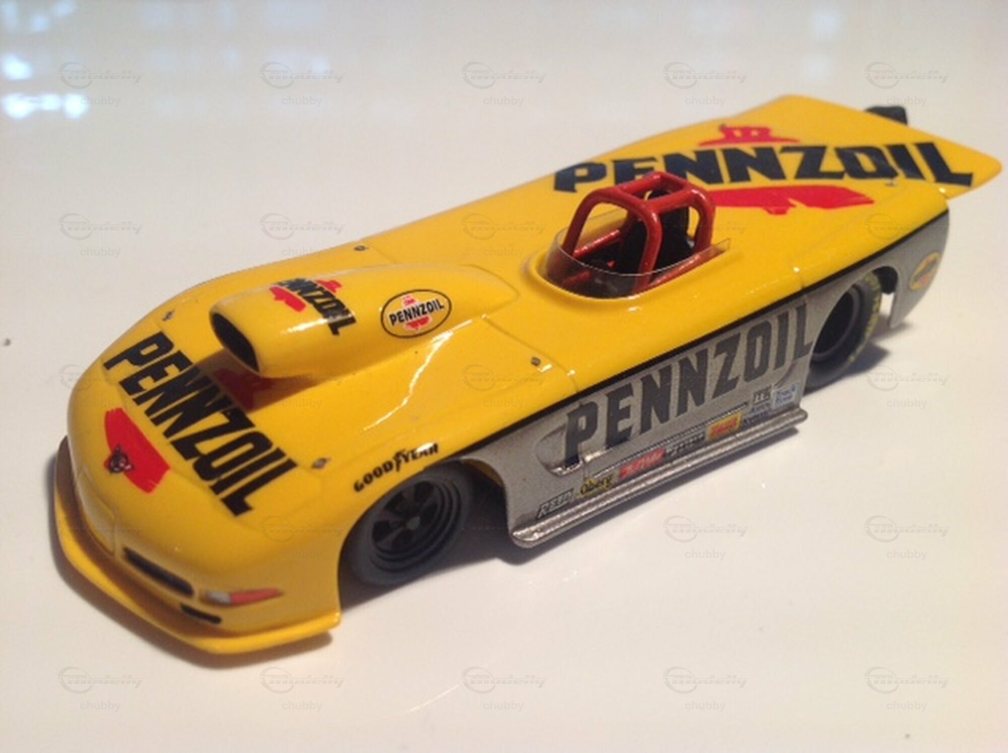 Auch als gelb-schwarze "Pennzoil"-Version hat Rigo den C5 Super Gas Dragster gemacht.