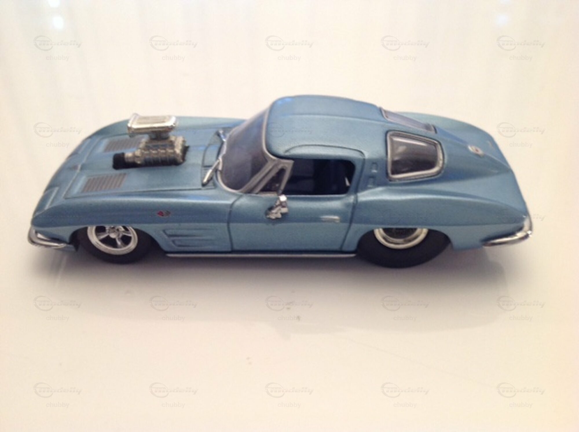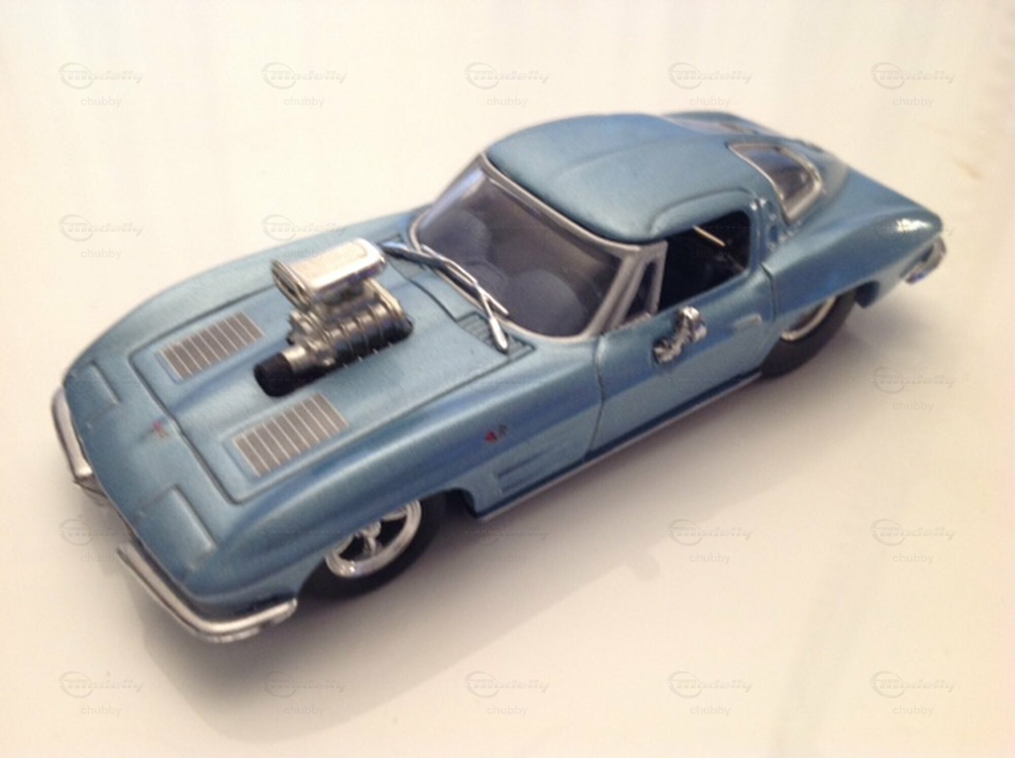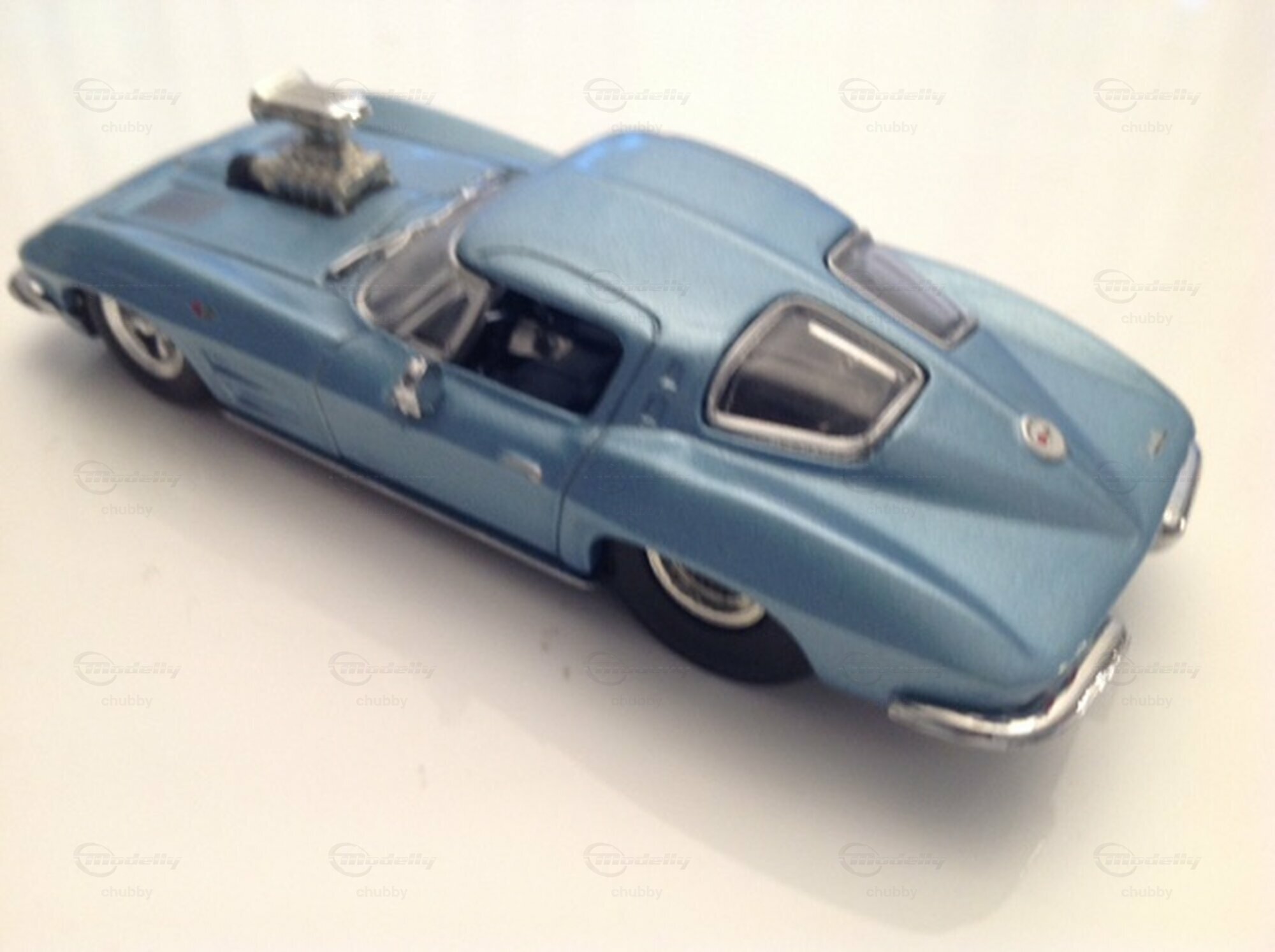 Auch dies ein getuntes C2 1963 Coupé, diesmal auf einem Modell von Matchbox basierend. Ein mir unbekannter Modelltuner (der gleiche wie beim türkisfarbenen C1 1957 Dragster) verwandelte das Basismodell mit passenden Rädern und einem Kompressor-Motor in einen Dragster. Beide hier genannten Modelle und auch das soeben gezeigte rot-weiss-blaue 1963er C2 Custom Coupé habe ich auf Ebay ersteigert.