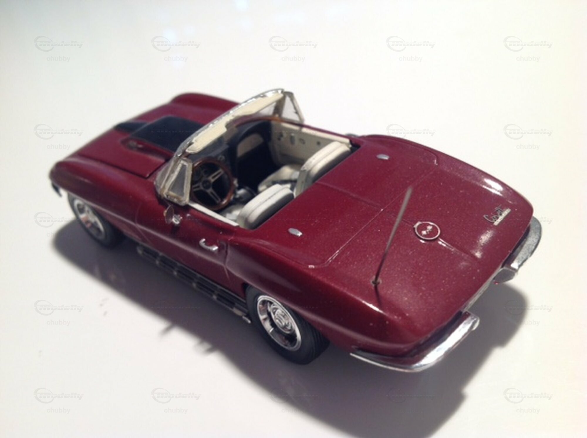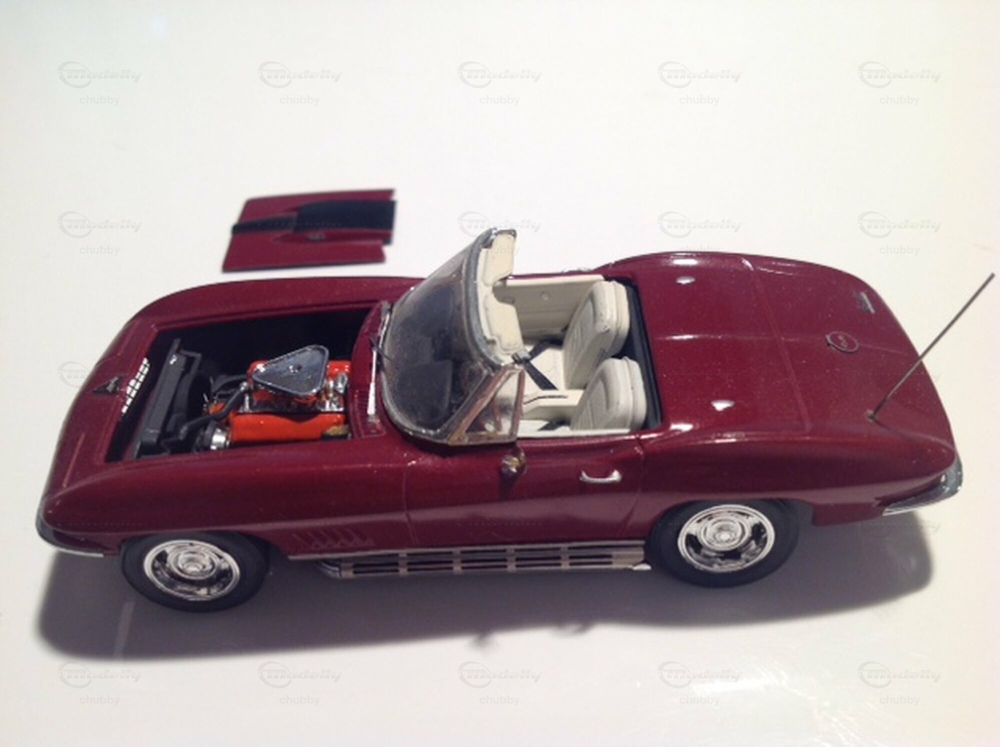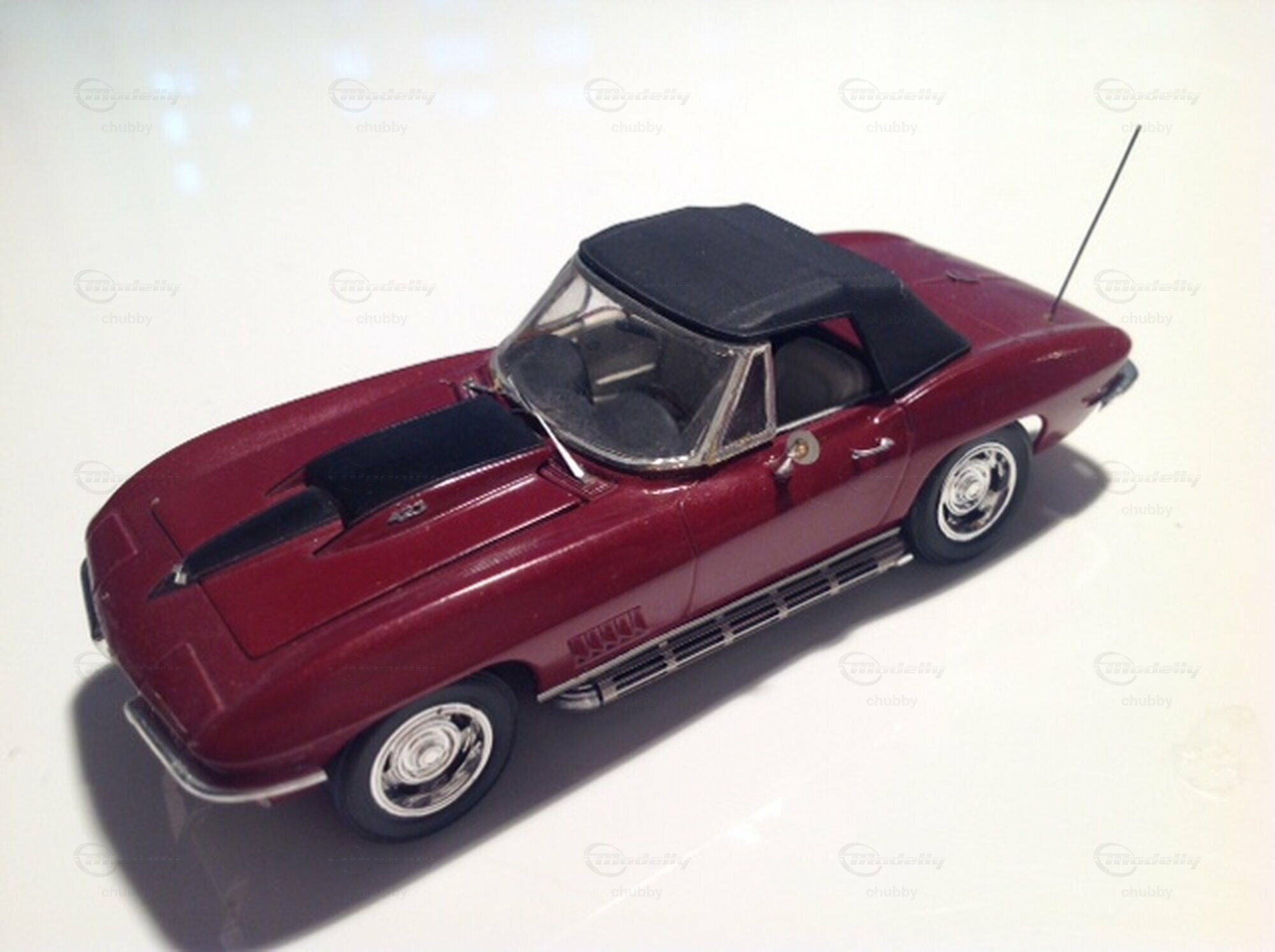 Monogram hat sehr detaillierte 1:43er Plastik-Kits gemacht, aus denen sich schöne Modellautos bauen lassen. So auch hier, bei den C2 1967 Big Block Cabrios mit aufsetzbarem geschlossenem Verdeck und mit abzunehmender Motorhaube. Ab und zu taucht ein solches schön gebautes Modell zu einem moderaten Preis in Ebay auf, und dann sollte man als Corvette-Sammler zugreifen.