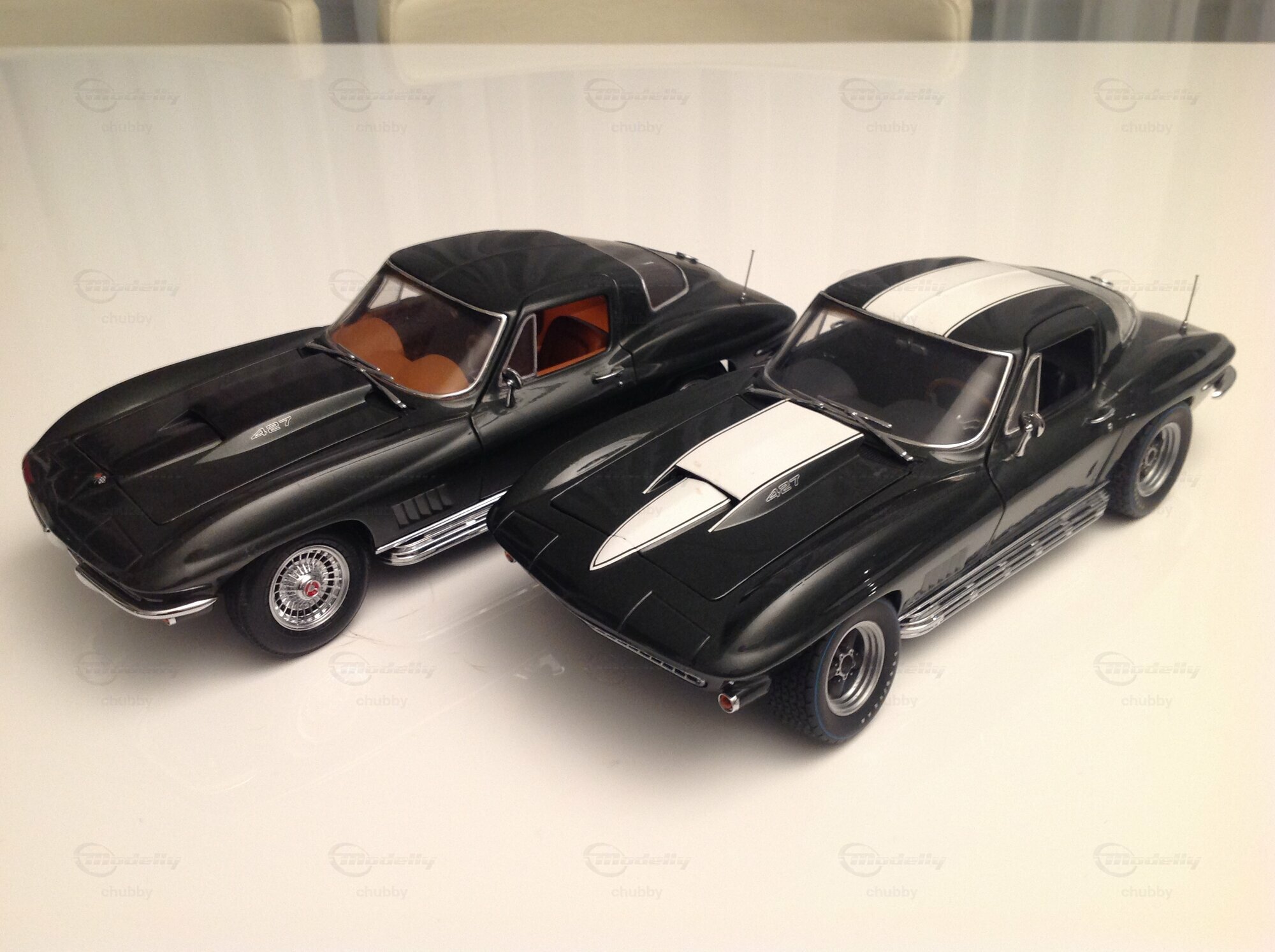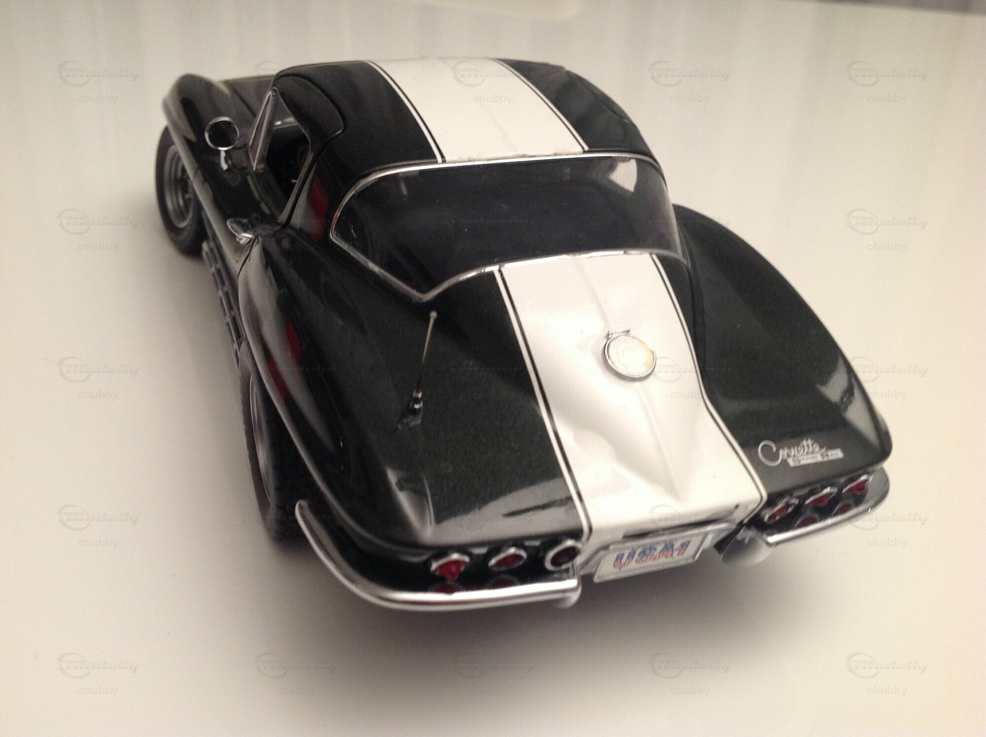 Dieses getunte C2-Auto gibt es als 1:24-Modell von Danbury Mint. Ein Schweizer Modellhändler machte in den 1990er Jahren drei Exemplare im Massstab 1:18. Als Basis diente ihm das 1967er Big Block-Modell von Motorbox (s. letztes Bild). Zum Auto: Der erfolgreiche Corvette-Verkäufer Bob Wingate erhielt 1967 das modifizierte Unikat als Anerkennung für seine Verdienste. Das auffälligste Merkmal sind die sechs Heckleuchten.