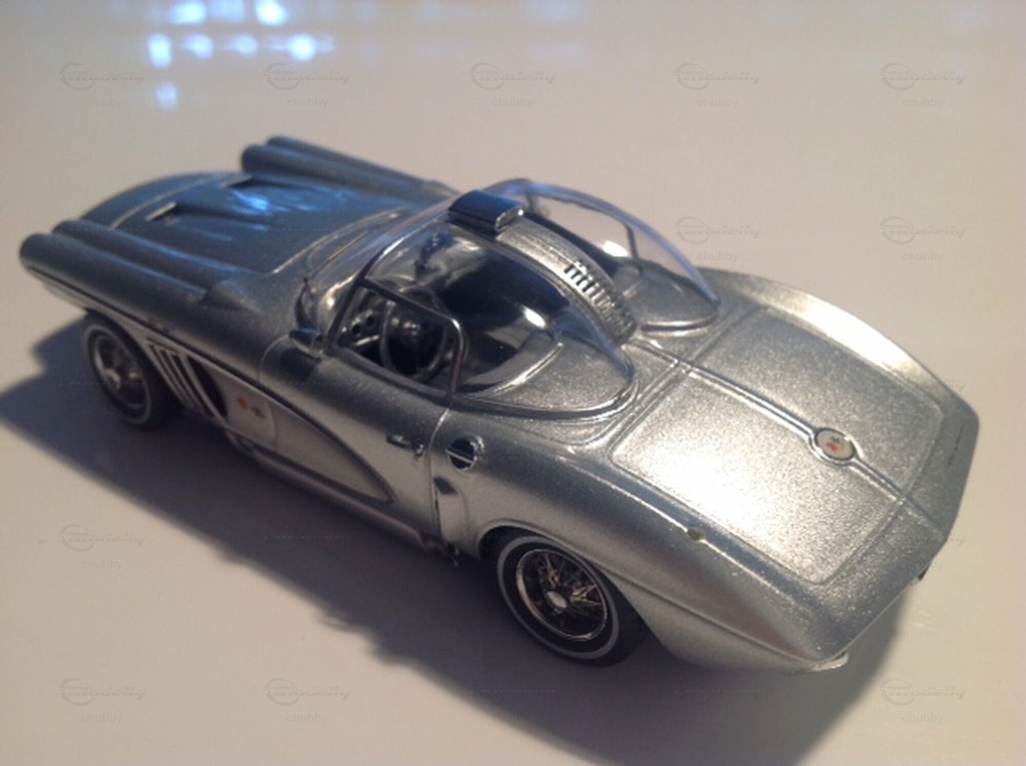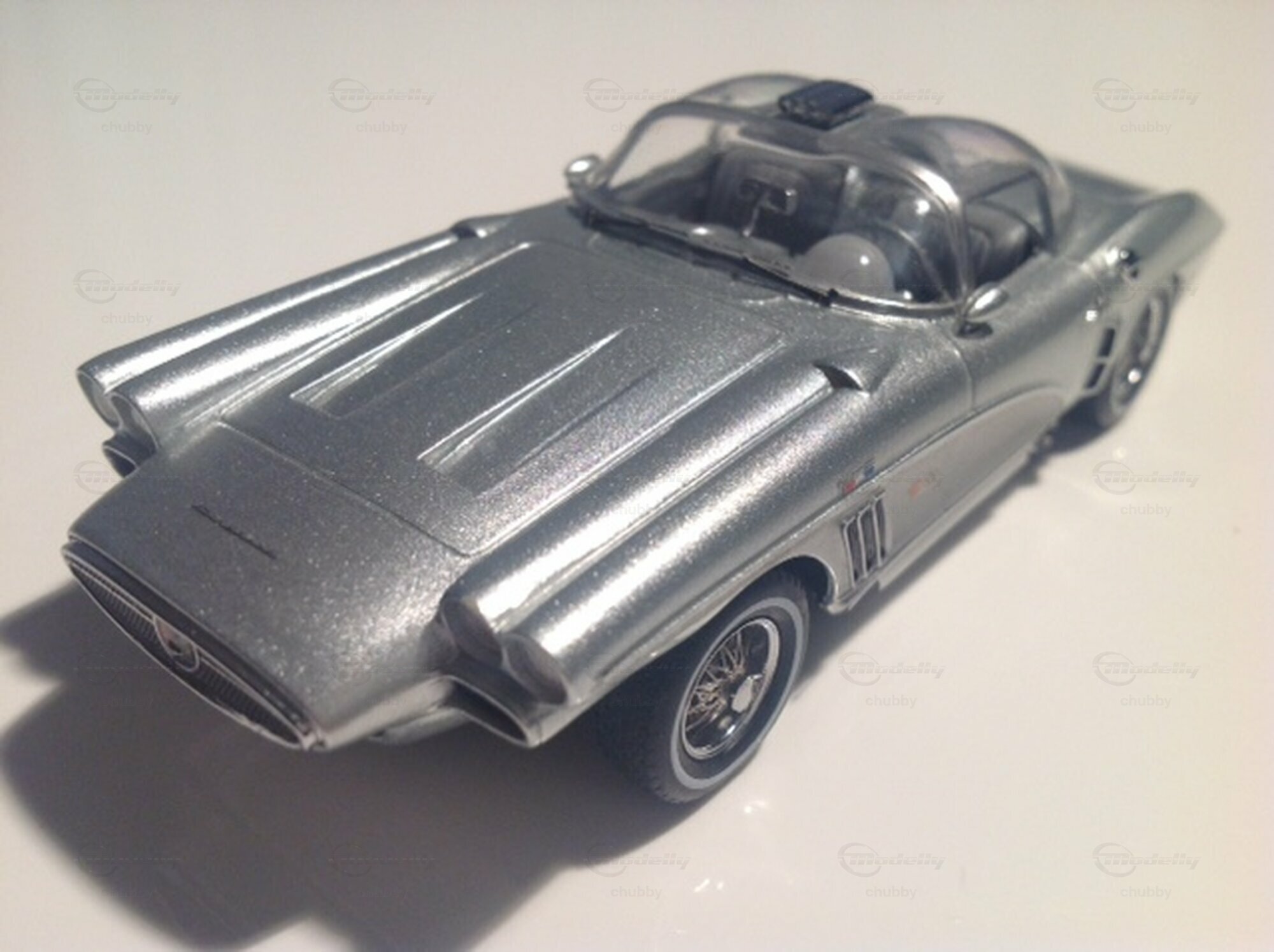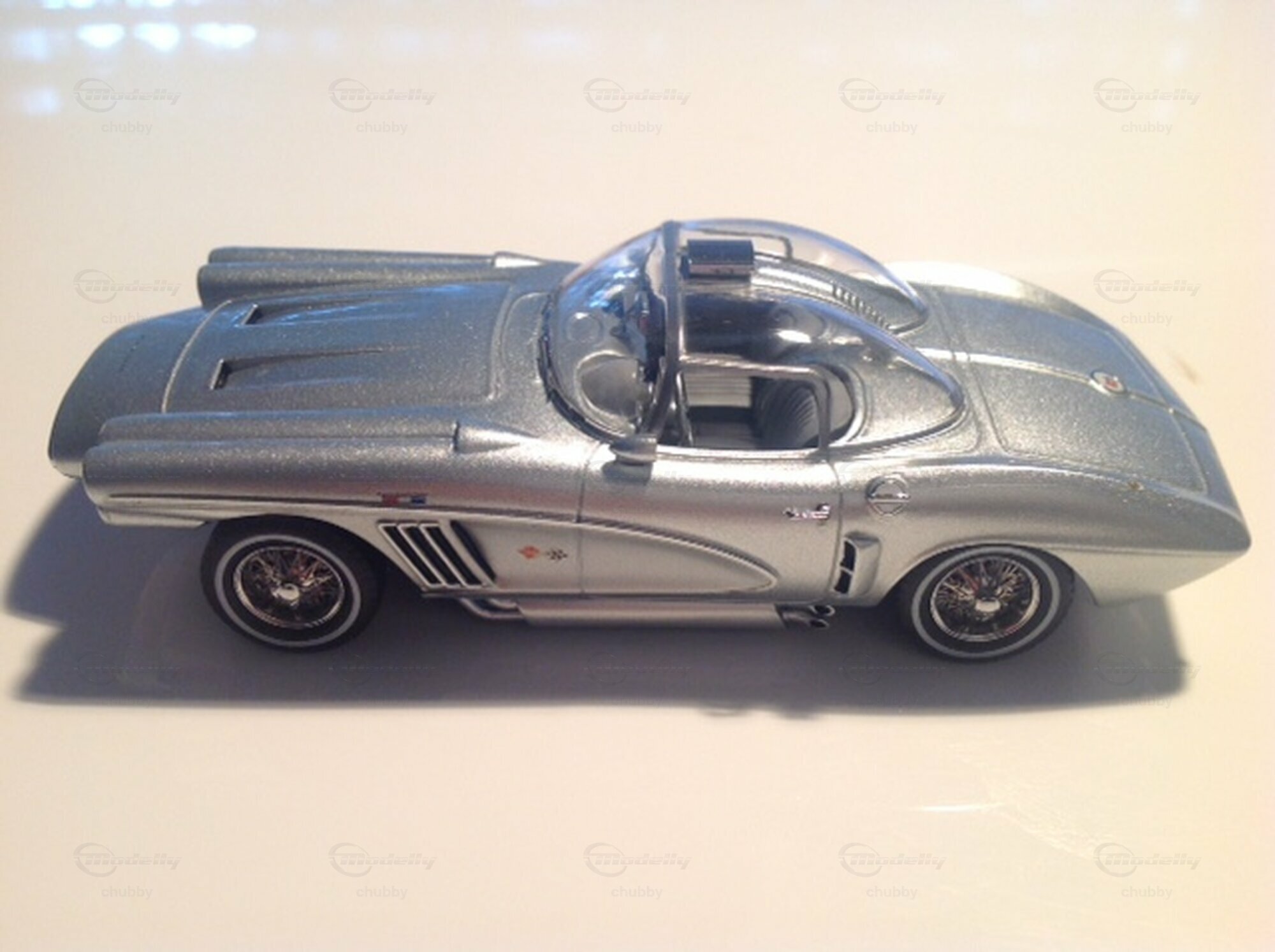 Hier das Coupé bzw. Hardtop des Corvette XP-700 Concept Cars von 1958. Die futuristischen, kapselförmigen Dachhälften sind ein typisches Space Age-Stilelement. Auch hier stammt das Modellauto von Neo.