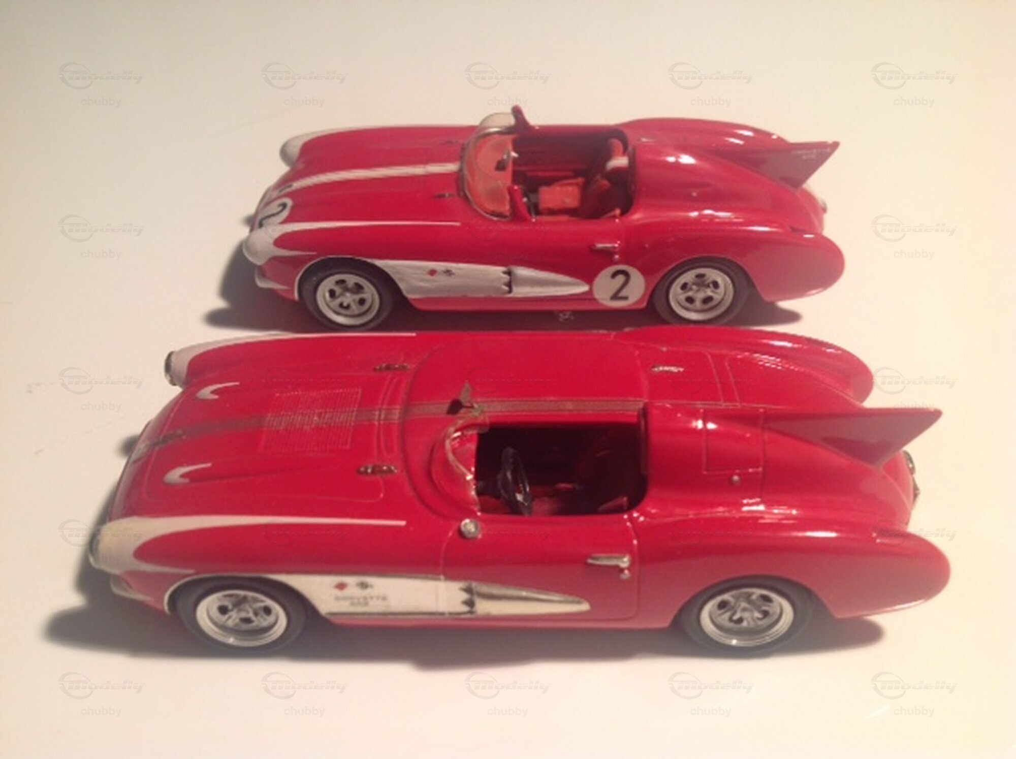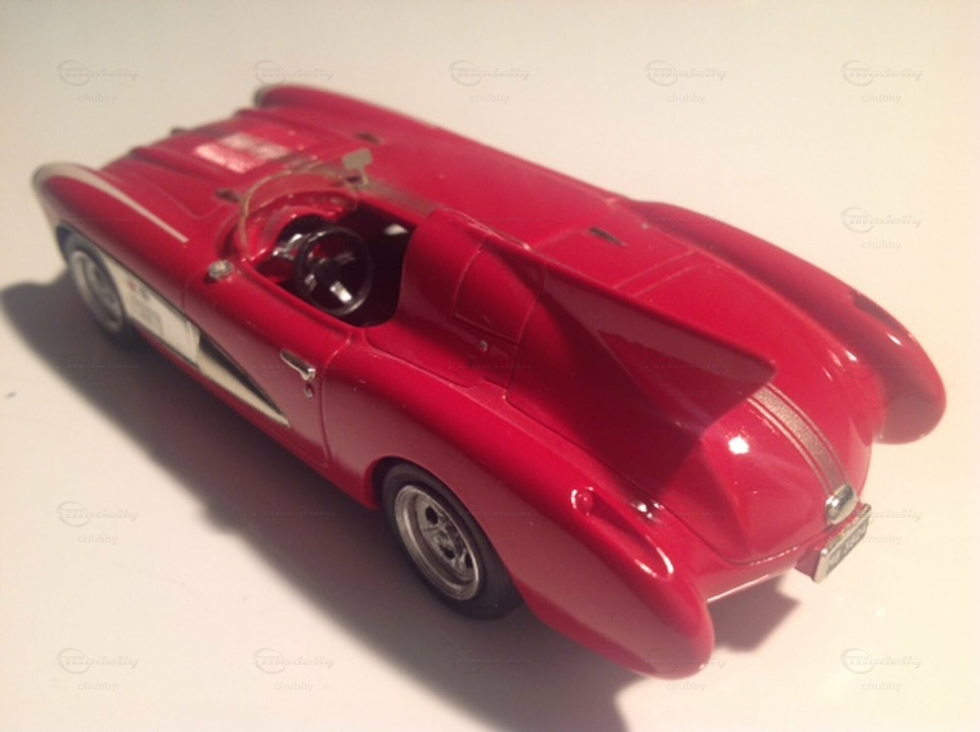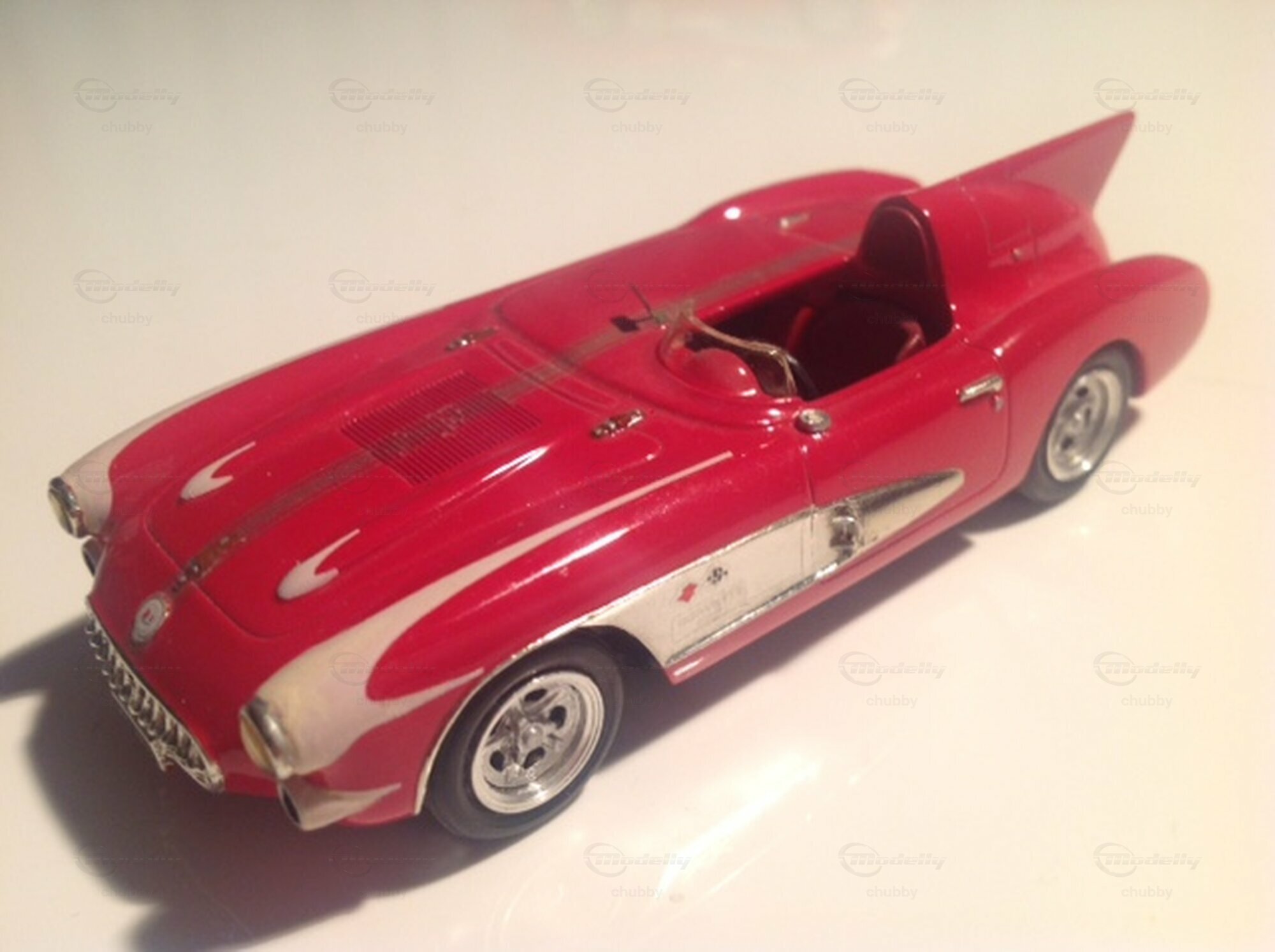 Dieses Auto war zugleich ein strassenzugelassenes Show Car als auch ein Rennauto. Gebaut wurde dieser schöne Flitzer mit der Heckflosse für die GM-Ikone Bill Mitchell. 1957 fuhr es bei 12 Stunden von Sebring und erreichte dem neunten Gesamtrang. Das "zivile" Modellauto wie auch das Rennmodell stammen von einem Kit des Herstellers Provence Moulage. Das Modell mit der Rennnummer 2 ist schon gut gebaut, aber die Miniatur der Show Car-Variante (ohne Rennnummer) steht für Modellbau-Perfektion. Top notch!