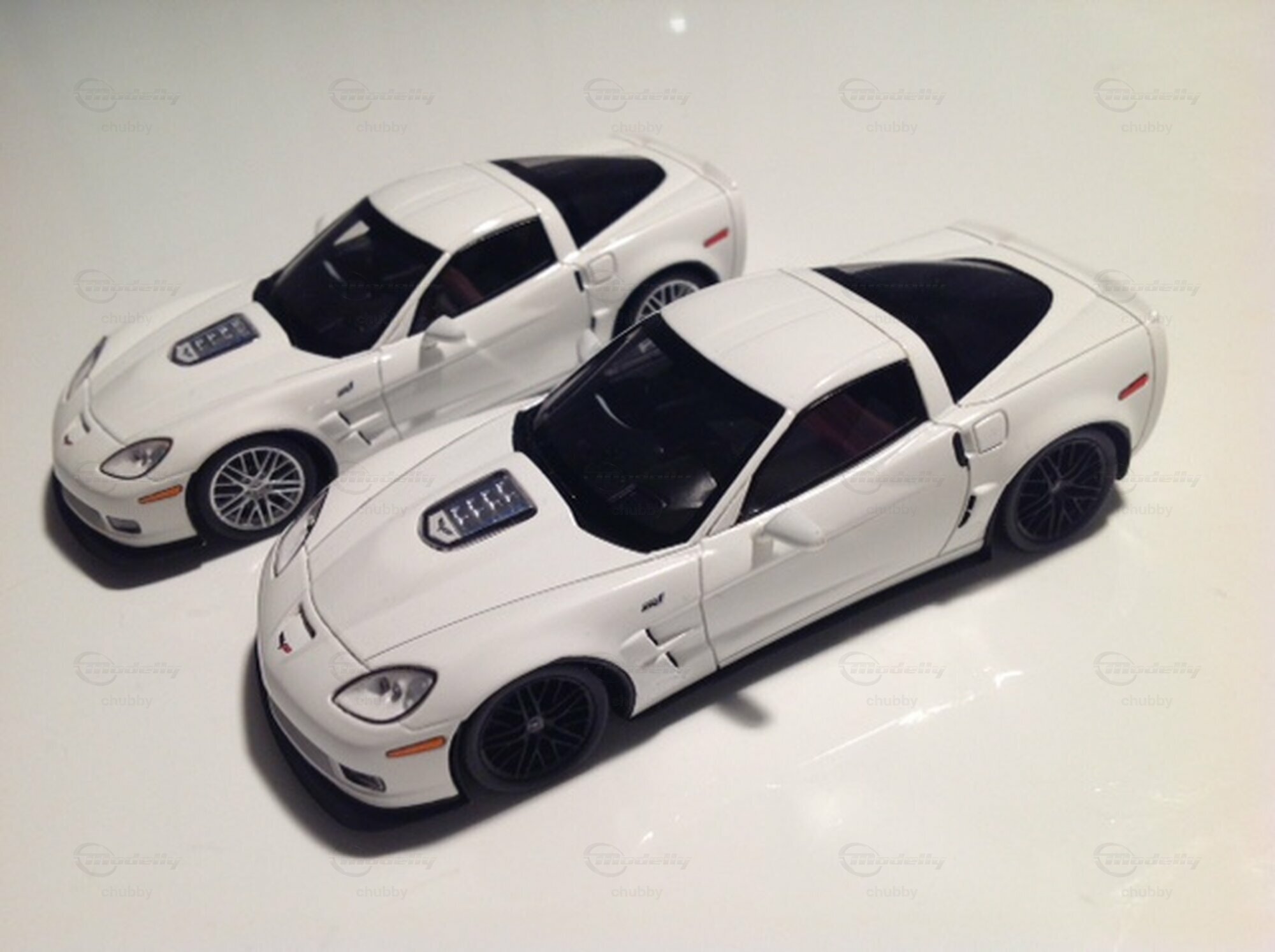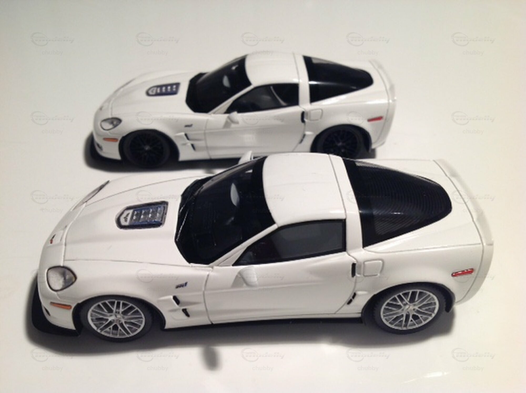 Die stärkste C6 Version ist die ZR1. Die weissen Modelle stammen von Spark Models. Sie unterscheiden sich nur durch die Farbe der Felgen (schwarz bzw. silber). Als Sammler musste man schnell handeln, um beide zu haben.