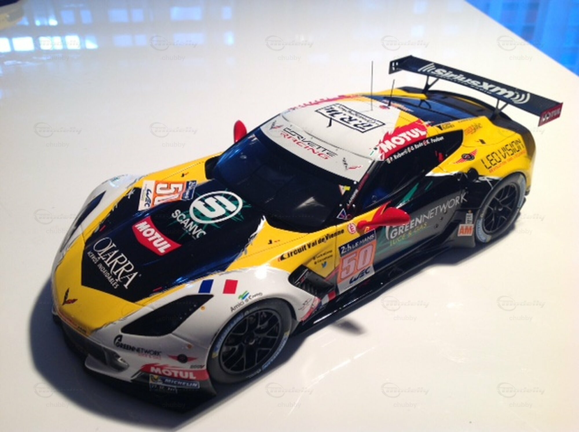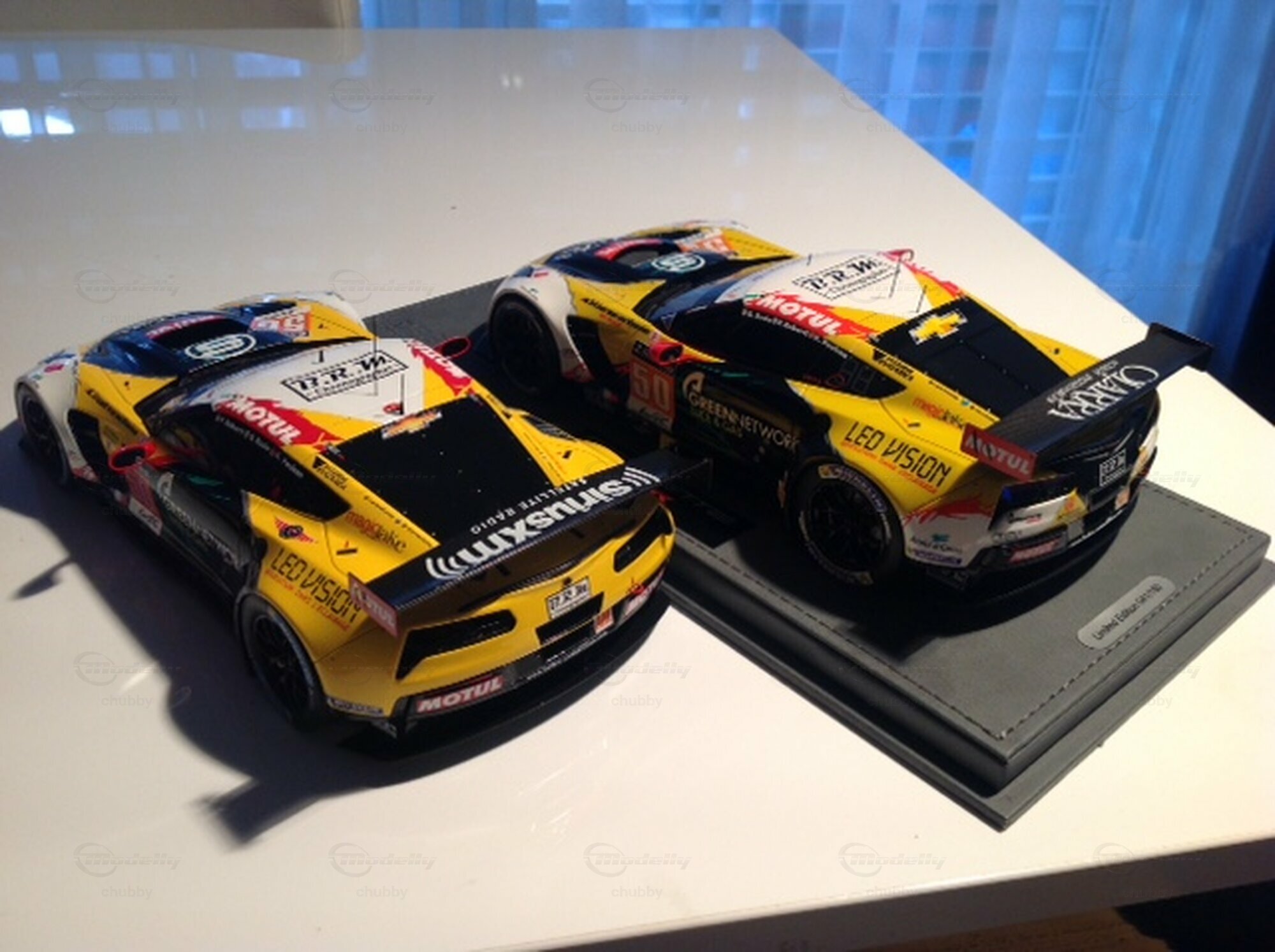 Wir haben hier nochmals die CR-7 von Larbre Competition #50 beim Le Mans-Rennen im Jahr 2015, diesmal von Spark Models gefertigt. Das Auto ist dasselbe wie das von BBR gefertigte, und doch besteht bei den beiden Modellen ein Unterschied. Bei einer Kollision wurde das Heck des Autos zerstört. Das Larbre-Team konnte es durch ein ausgeliehenes Heck von Corvette Racing ersetzen. Das Modell von BBR zeigt also das Auto so, wie es zu Beginn war, jenes von Spark hingegen so, wie es sich nach dem Unfall und dem Tausch des Hecks zeigte. Au dem zweiten Foto steht das abgeänderte Auto links neben dem ursprünglichen.