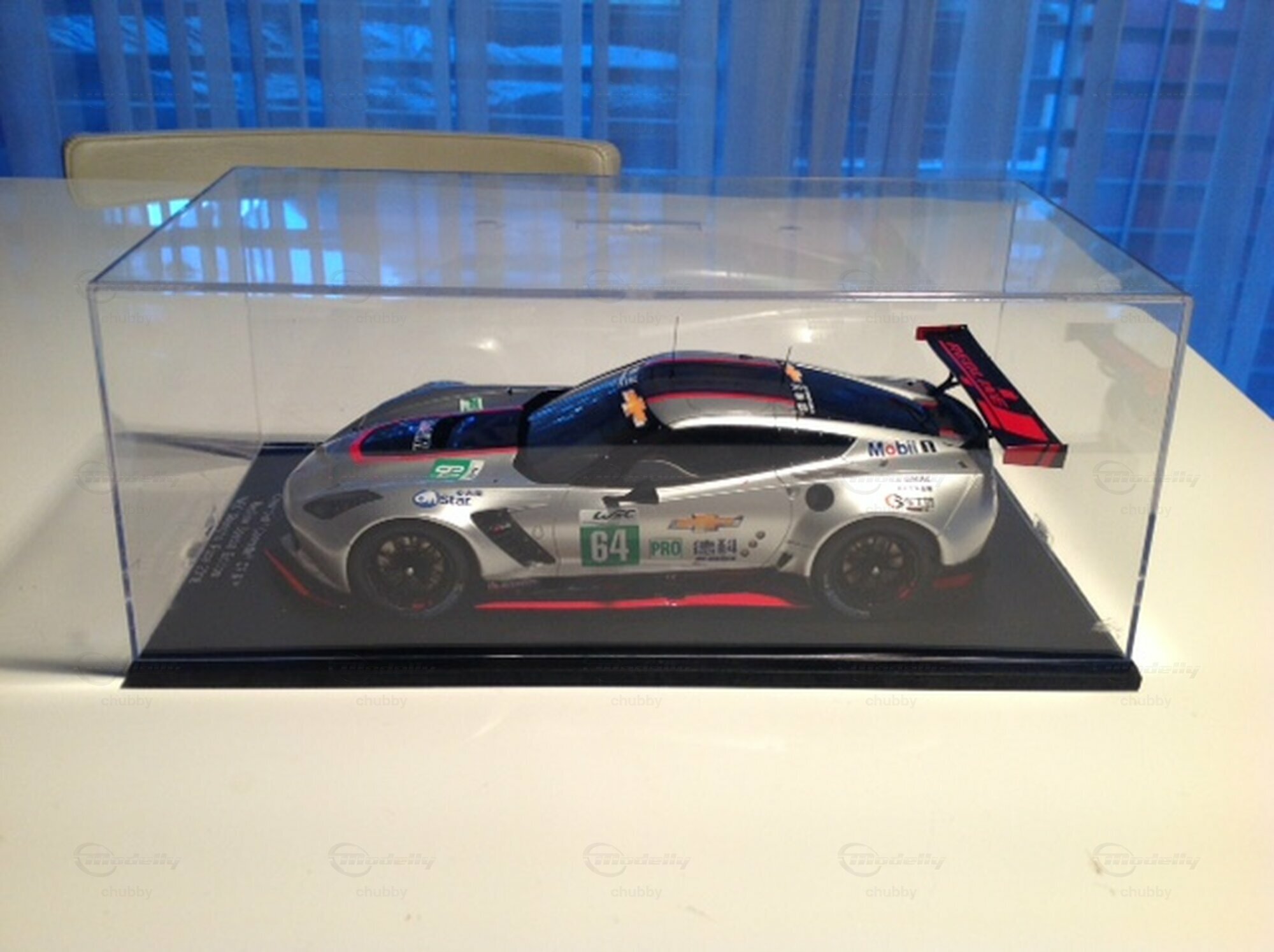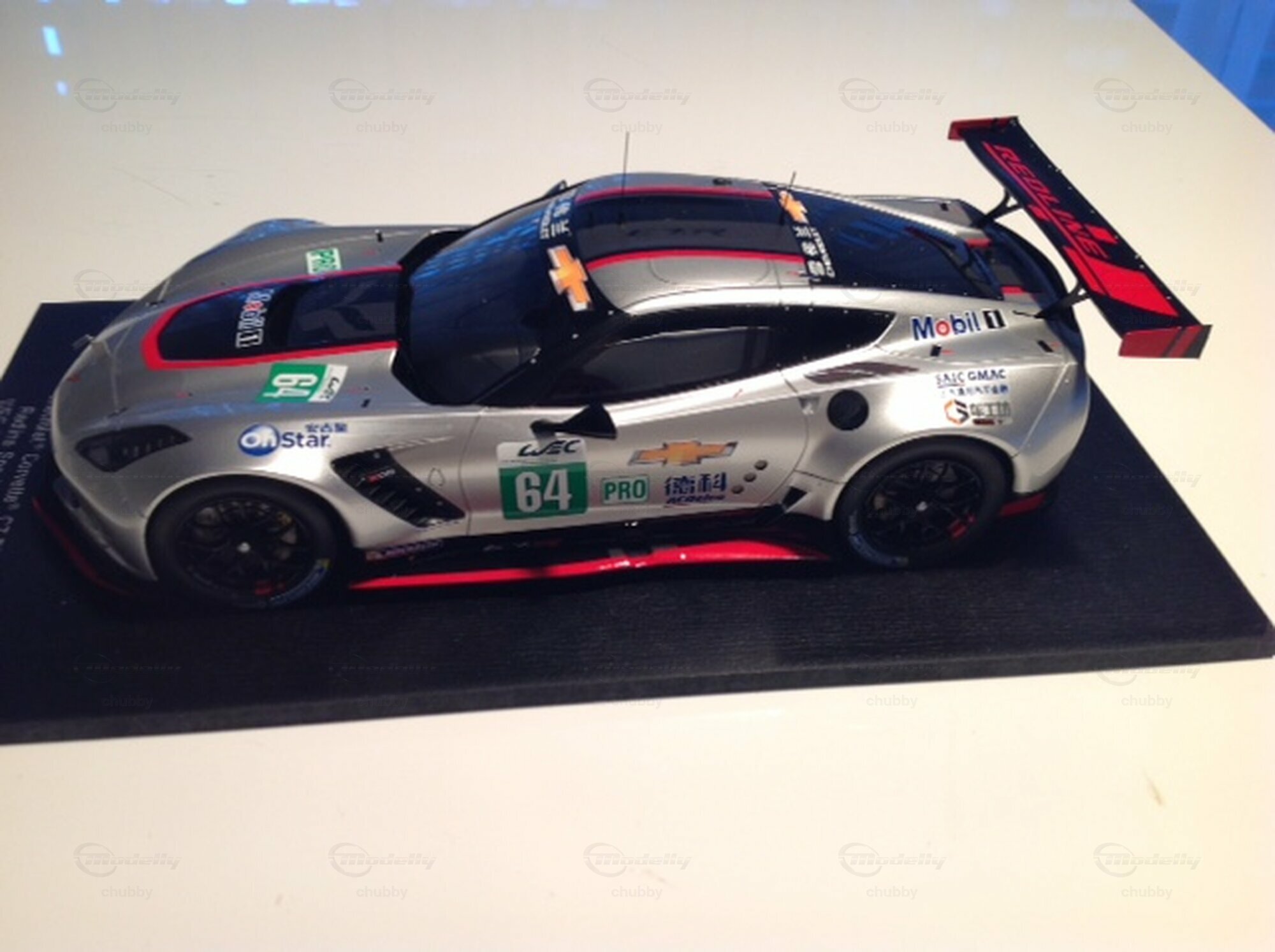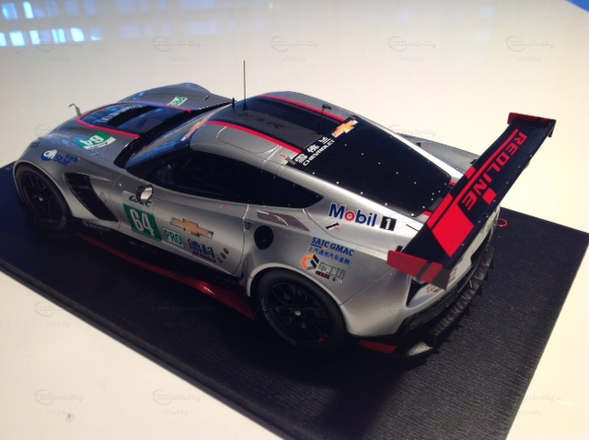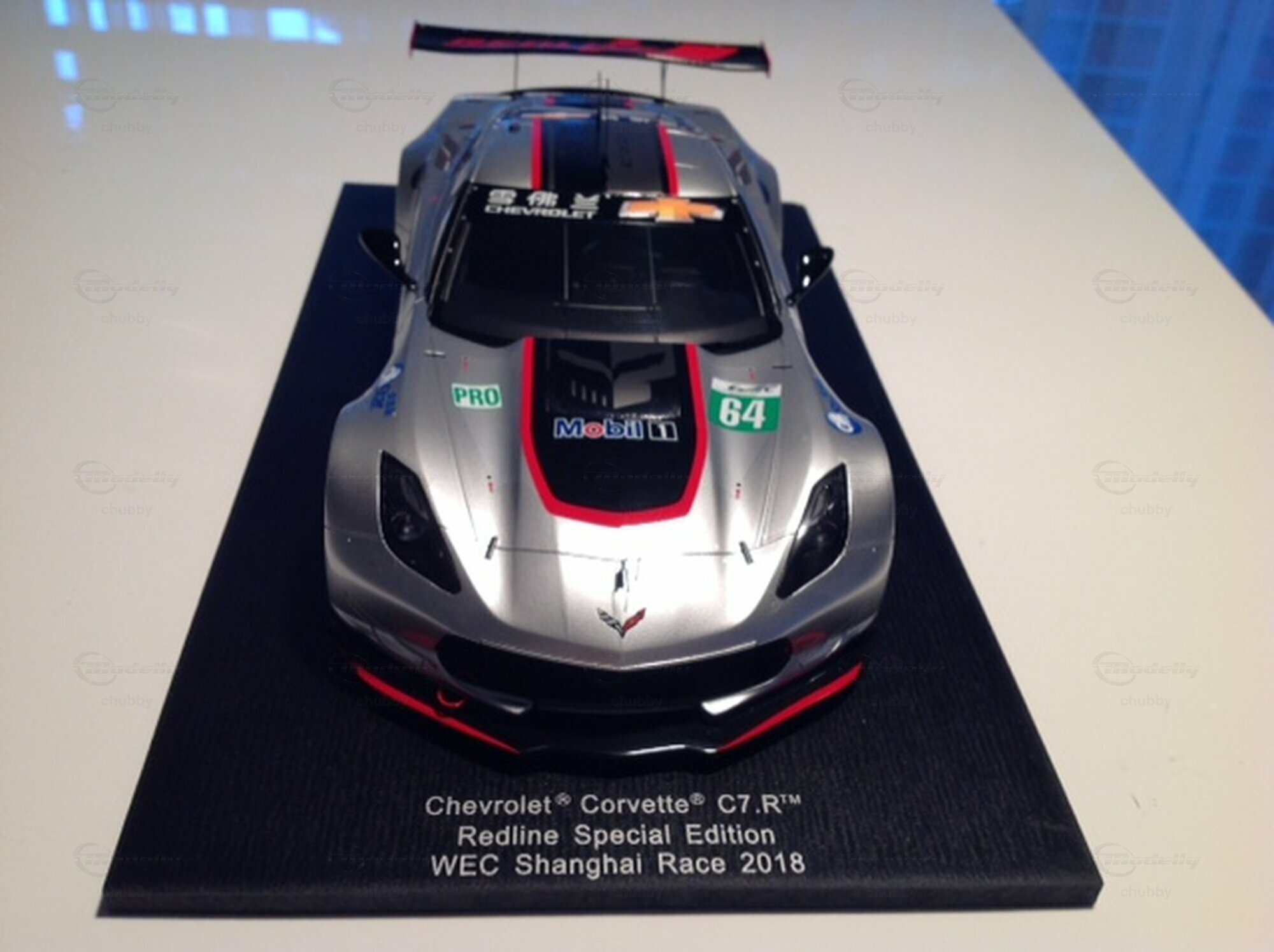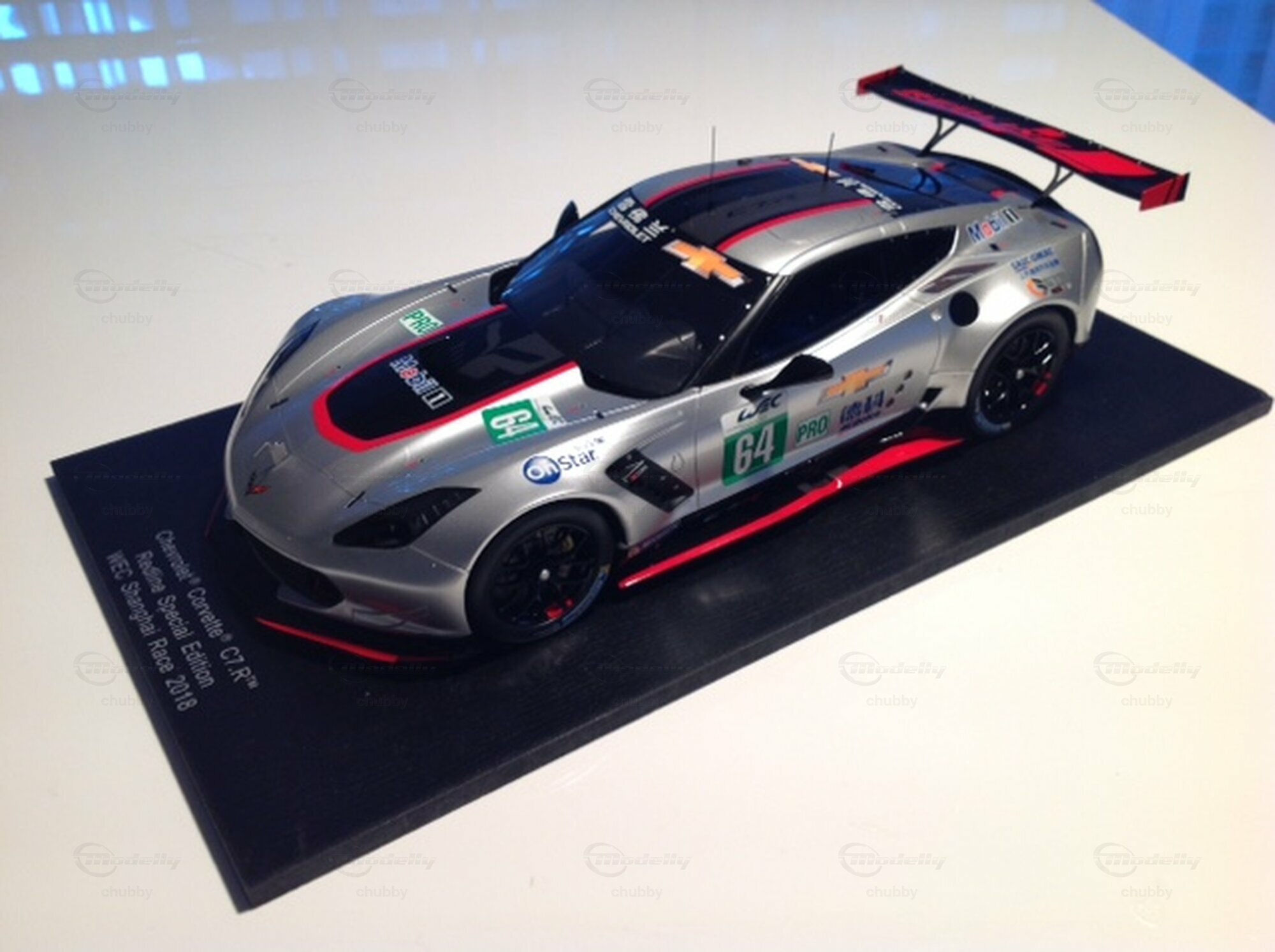 Jetzt ist es angekommen, dieses Traummodell ! 2018 liess Corvette Racing eines seiner  C7-R  Werksautos bei einem Rennen in Shanghai antreten, und zwar China-mässig in einem Redline-Outfit. Das 1:18-Modellauto ist nur via Ebay bei einem Händler  in China erhältlich. Spark hat übrigens dasselbe Auto bereits in 1:43 produziert.