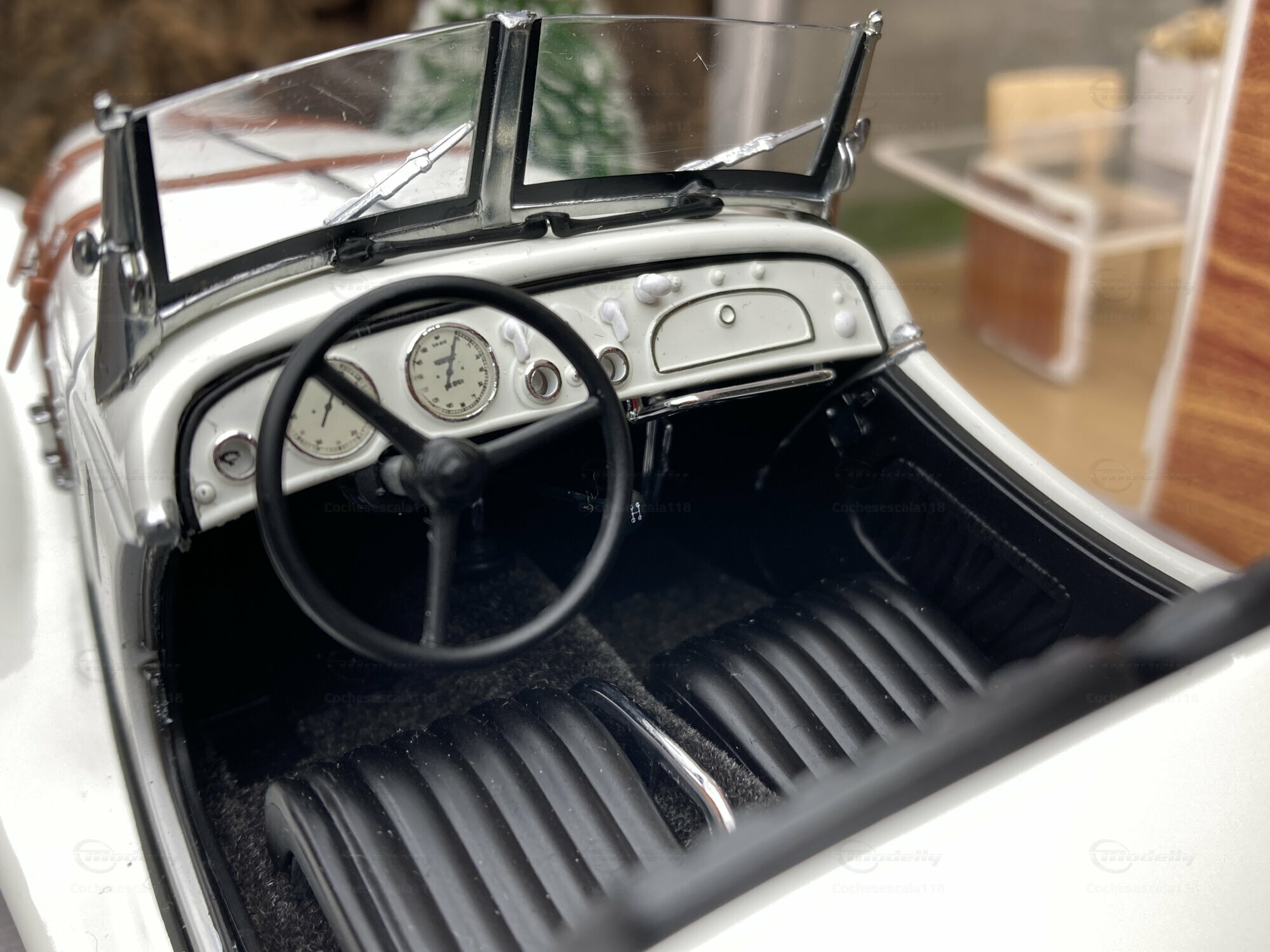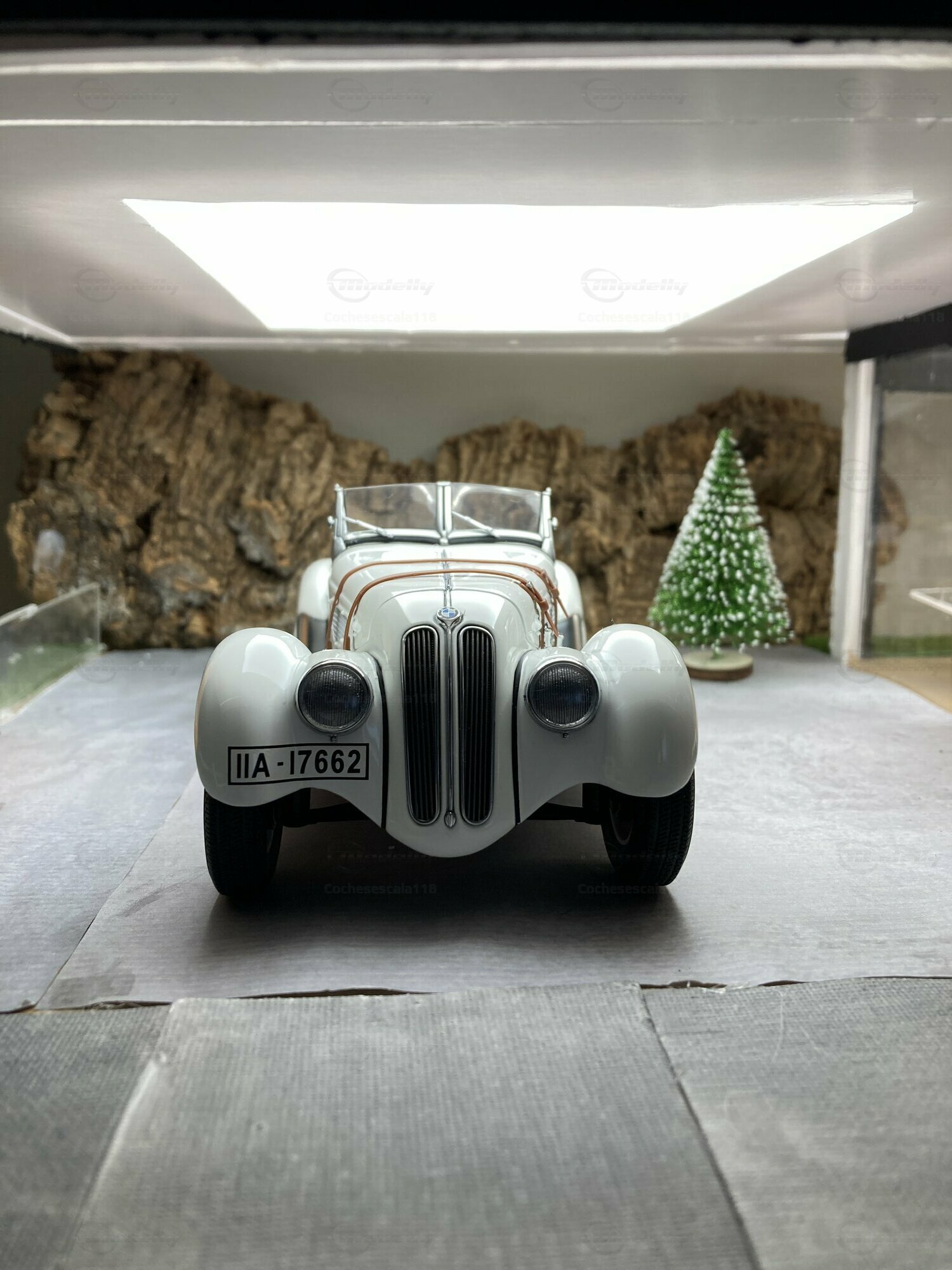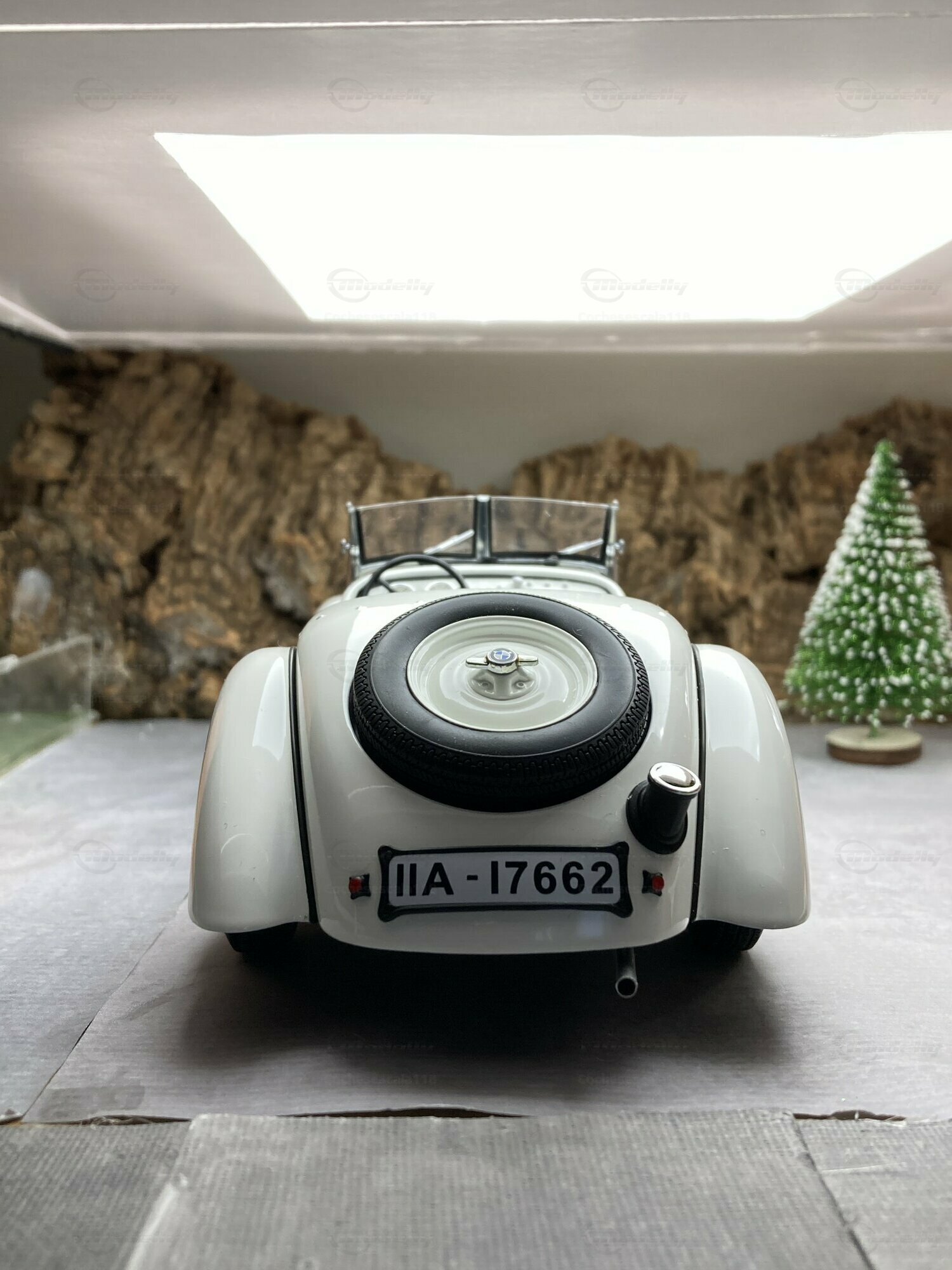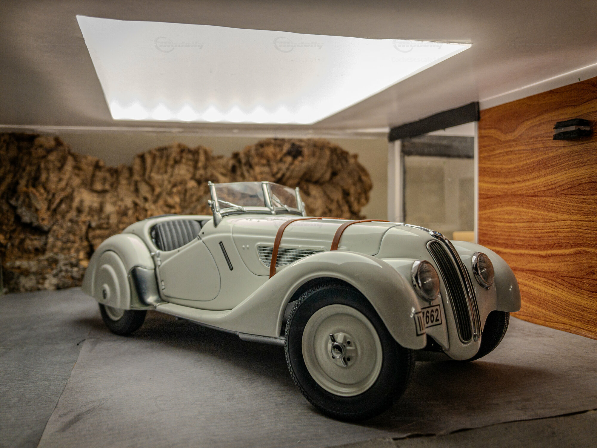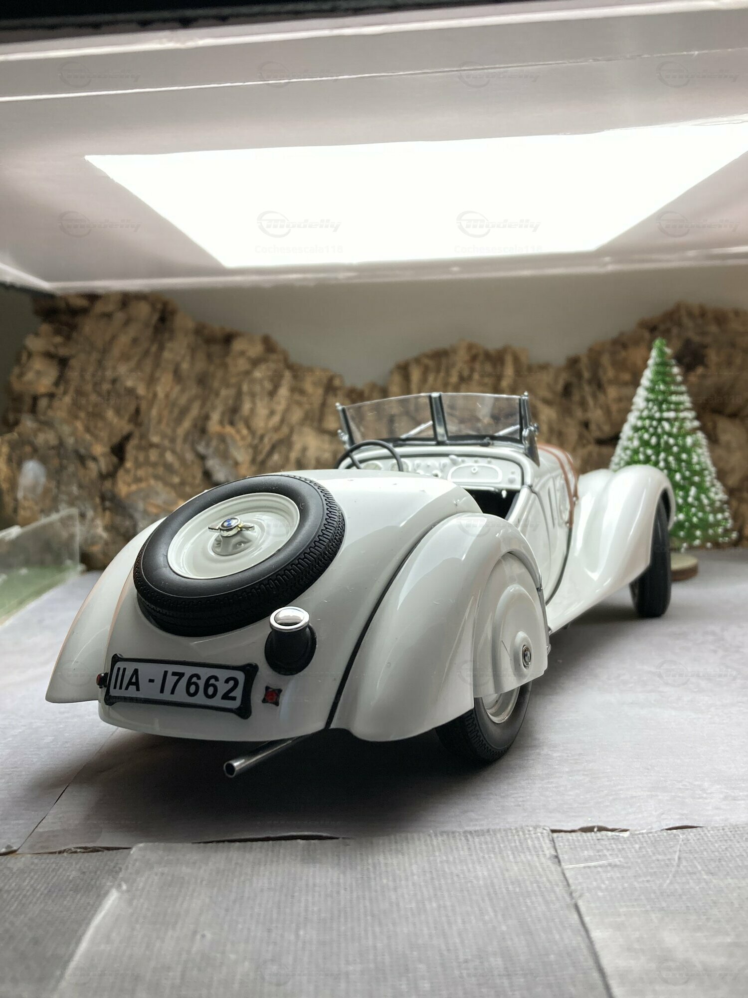 Die gezeigte Miniatur des BMW 328 Roadster, hergestellt von AUTOart im Maßstab 1:18, ist eine detailgetreue Replik des Originalfahrzeugs. Das Modell, das auf den Fotos aus der Sammlung von Modelly-Mitglied "Cochesescala118" zu sehen ist, besteht aus Diecast-Material, das für seine Robustheit und Detailtreue bekannt ist. Die Modellhersteller haben besonders auf die originalgetreuen Details geachtet, einschließlich der Speichenräder, der präzise nachgebildeten Innenausstattung und der akkurat eingefangenen Kurven und Linien der Karosserie. Das Modell ist eine limitierte Edition, was es zu einem begehrten Sammlerstück macht. Vom Kühlergrill über die charakteristischen Rundscheinwerfer bis hin zu den aerodynamisch geschwungenen Formen ist jedes Detail liebevoll und akkurat umgesetzt. Dieses Modell verkörpert nicht nur Oldtimer-Romantik, sondern auch die technologische Meisterleistung der 1930er-Jahre.