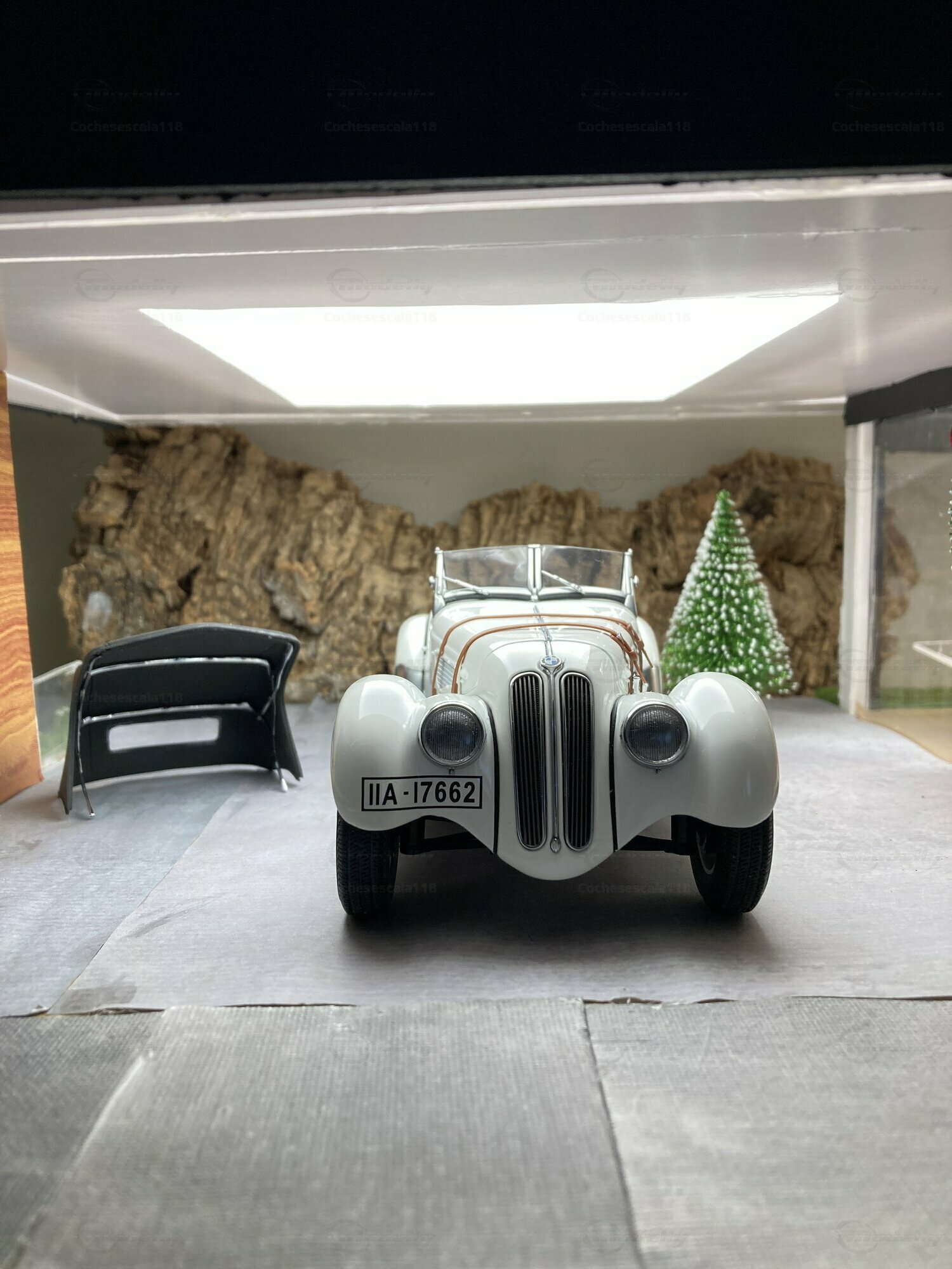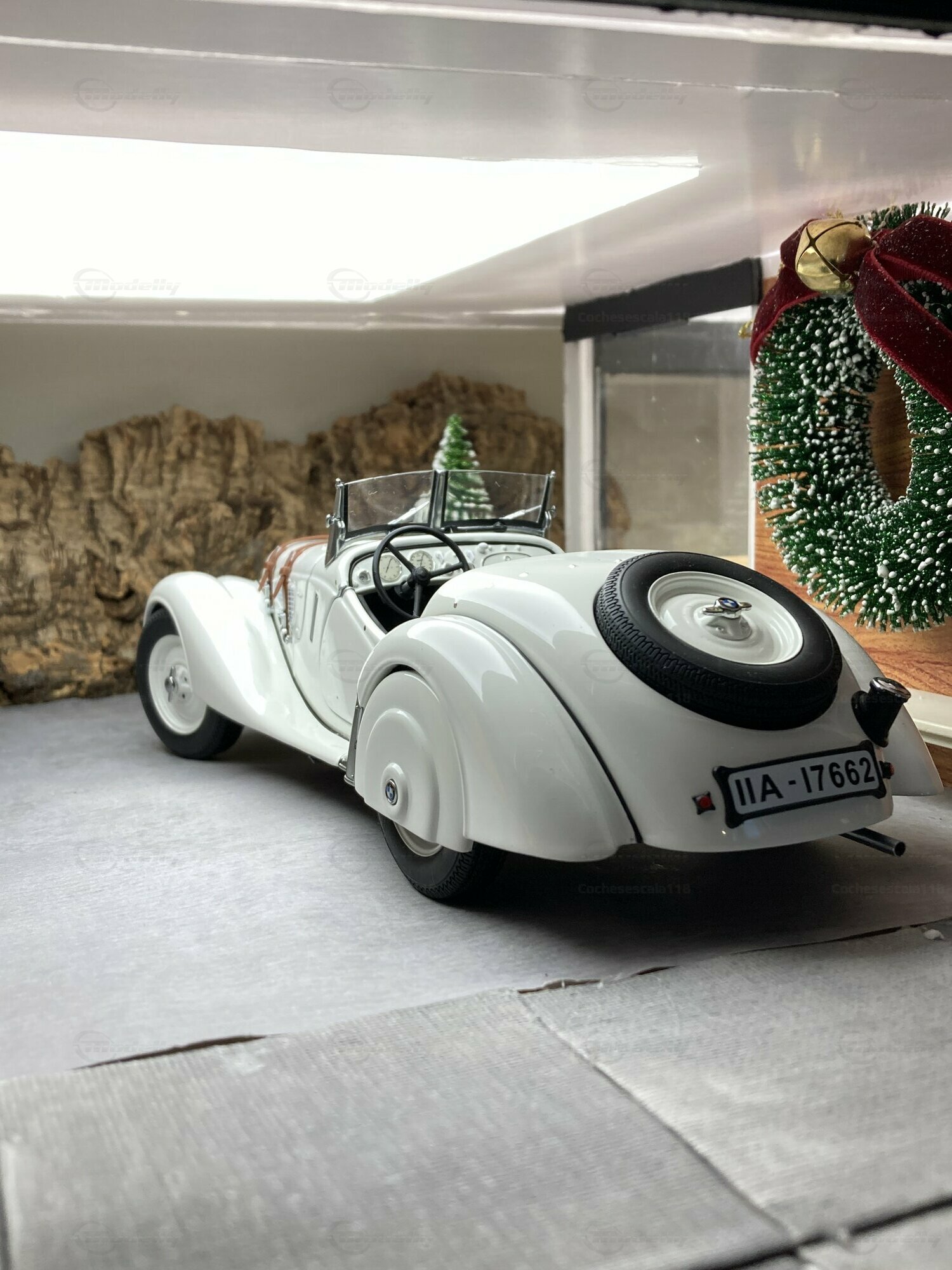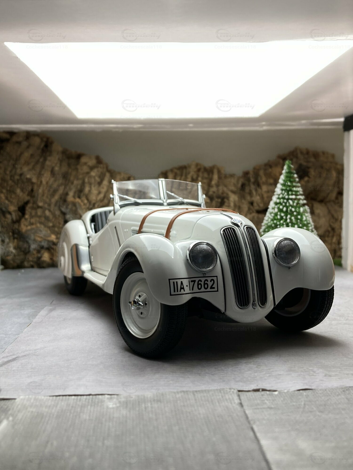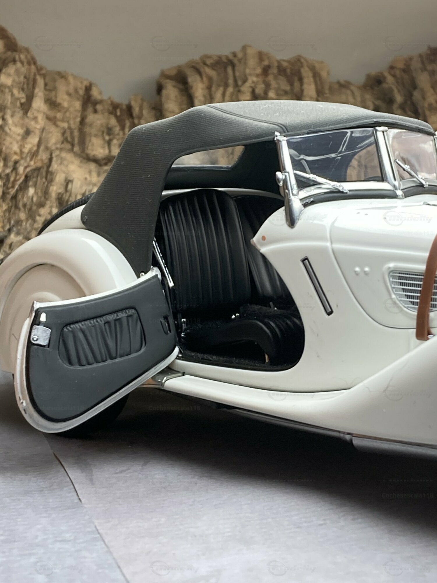 Die gezeigte Miniatur des BMW 328 Roadster, hergestellt von AUTOart im Maßstab 1:18, ist eine detailgetreue Replik des Originalfahrzeugs. Das Modell, das auf den Fotos aus der Sammlung von Modelly-Mitglied "Cochesescala118" zu sehen ist, besteht aus Diecast-Material, das für seine Robustheit und Detailtreue bekannt ist. Die Modellhersteller haben besonders auf die originalgetreuen Details geachtet, einschließlich der Speichenräder, der präzise nachgebildeten Innenausstattung und der akkurat eingefangenen Kurven und Linien der Karosserie. Das Modell ist eine limitierte Edition, was es zu einem begehrten Sammlerstück macht. Vom Kühlergrill über die charakteristischen Rundscheinwerfer bis hin zu den aerodynamisch geschwungenen Formen ist jedes Detail liebevoll und akkurat umgesetzt. Dieses Modell verkörpert nicht nur Oldtimer-Romantik, sondern auch die technologische Meisterleistung der 1930er-Jahre.