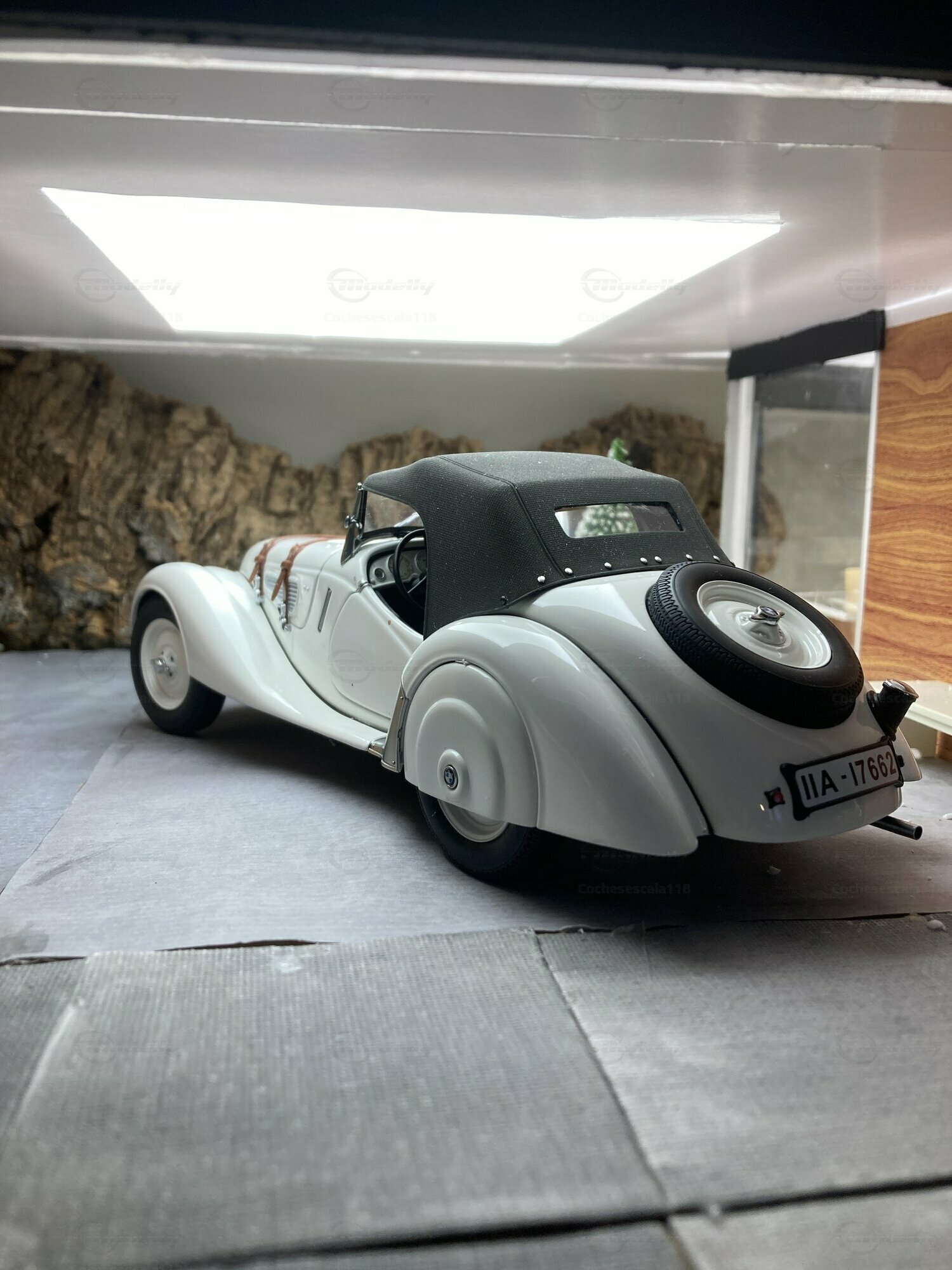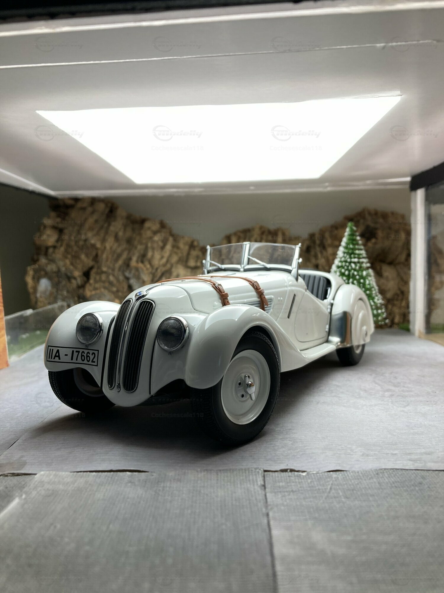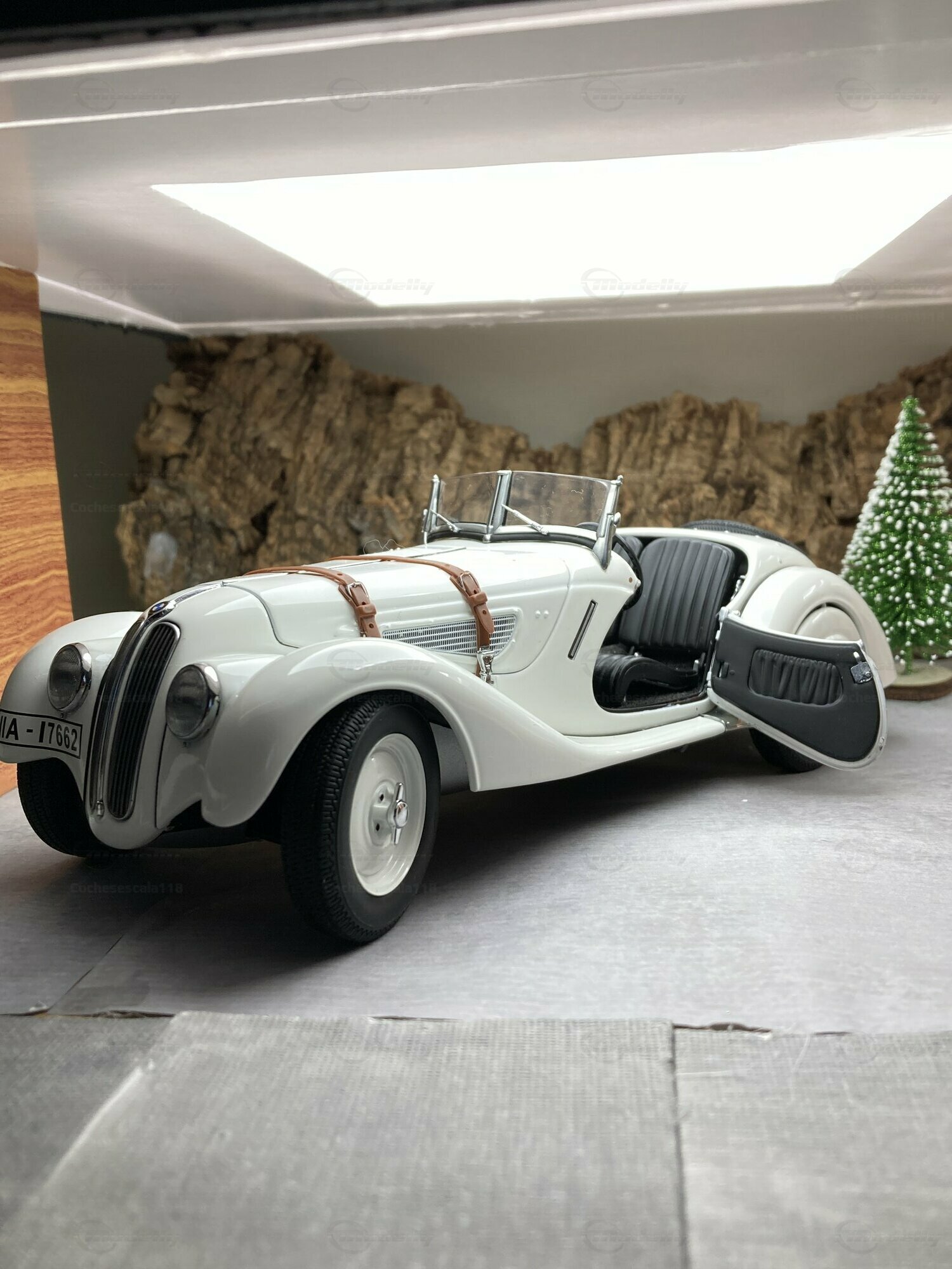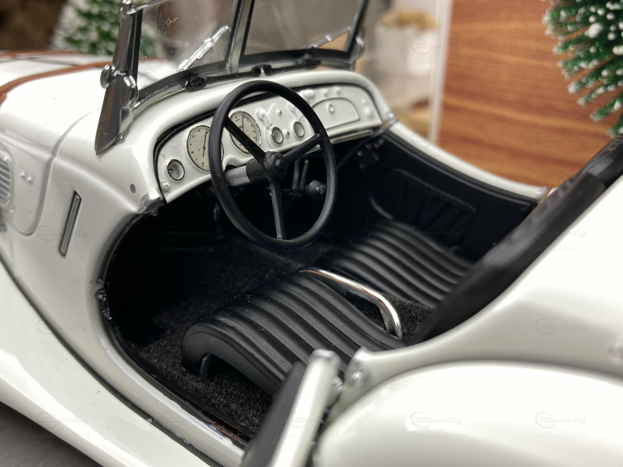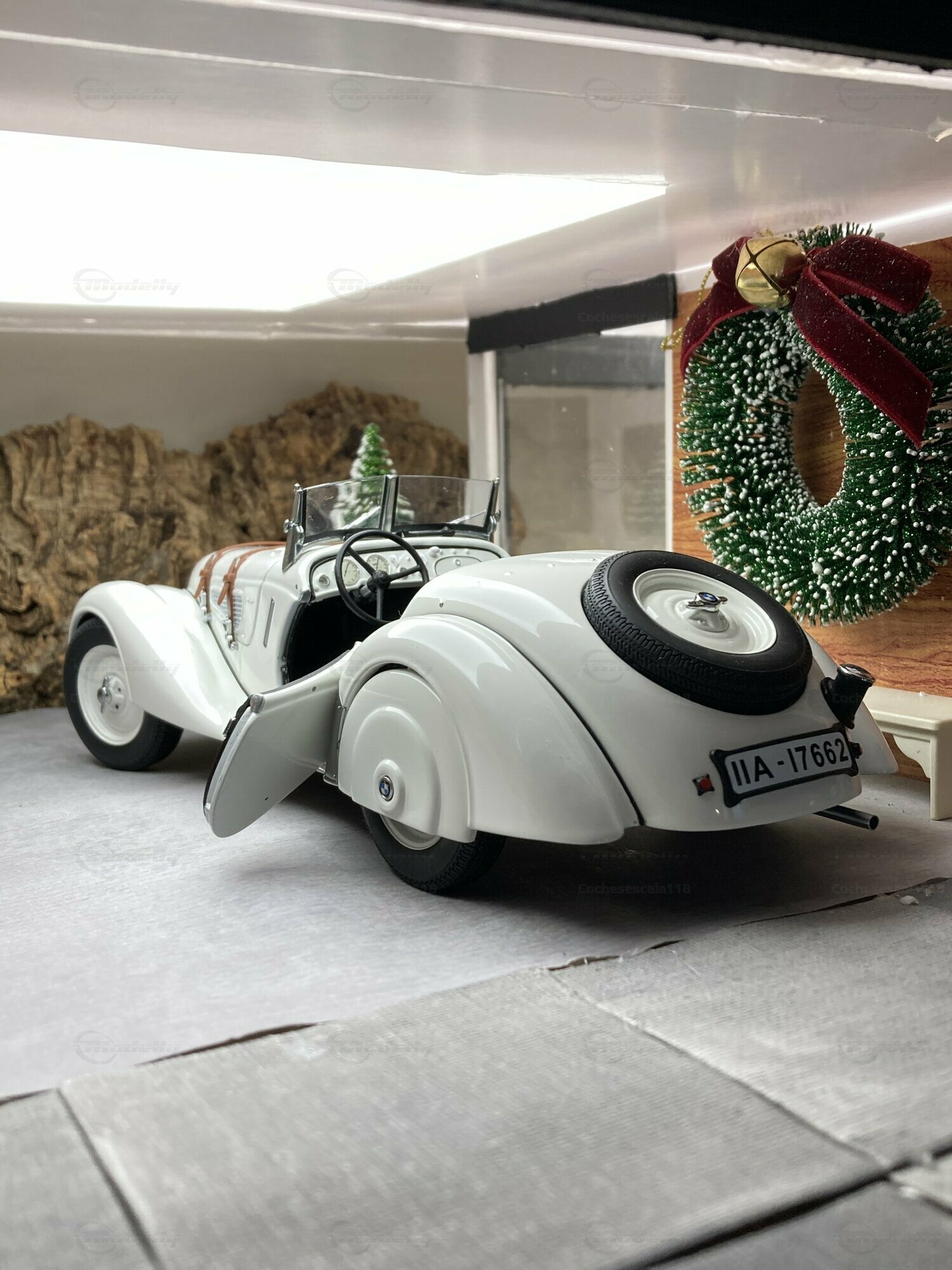Die gezeigte Miniatur des BMW 328 Roadster, hergestellt von AUTOart im Maßstab 1:18, ist eine detailgetreue Replik des Originalfahrzeugs. Das Modell, das auf den Fotos aus der Sammlung von Modelly-Mitglied "Cochesescala118" zu sehen ist, besteht aus Diecast-Material, das für seine Robustheit und Detailtreue bekannt ist. Die Modellhersteller haben besonders auf die originalgetreuen Details geachtet, einschließlich der Speichenräder, der präzise nachgebildeten Innenausstattung und der akkurat eingefangenen Kurven und Linien der Karosserie. Das Modell ist eine limitierte Edition, was es zu einem begehrten Sammlerstück macht. Vom Kühlergrill über die charakteristischen Rundscheinwerfer bis hin zu den aerodynamisch geschwungenen Formen ist jedes Detail liebevoll und akkurat umgesetzt. Dieses Modell verkörpert nicht nur Oldtimer-Romantik, sondern auch die technologische Meisterleistung der 1930er-Jahre.