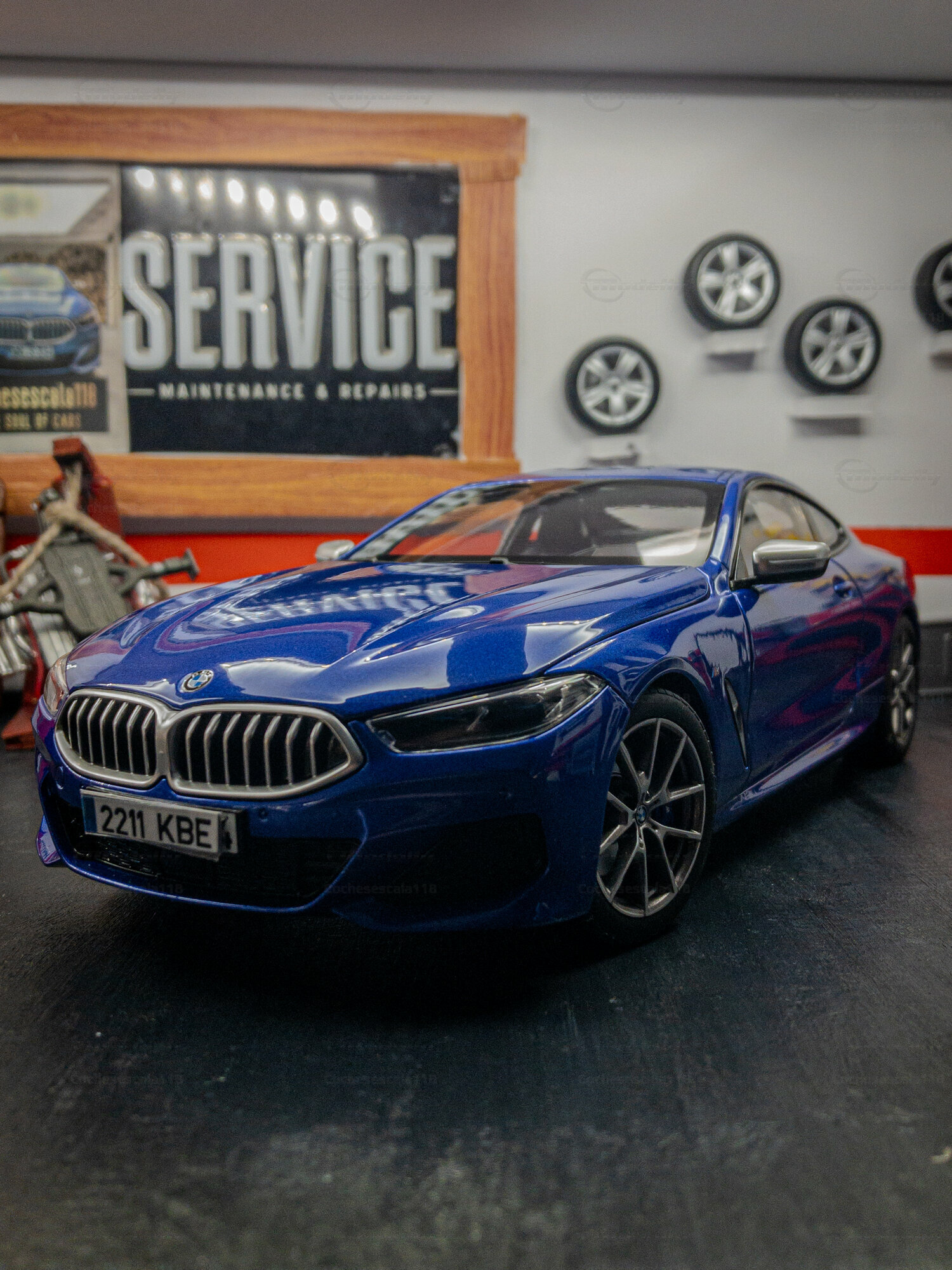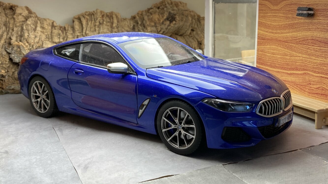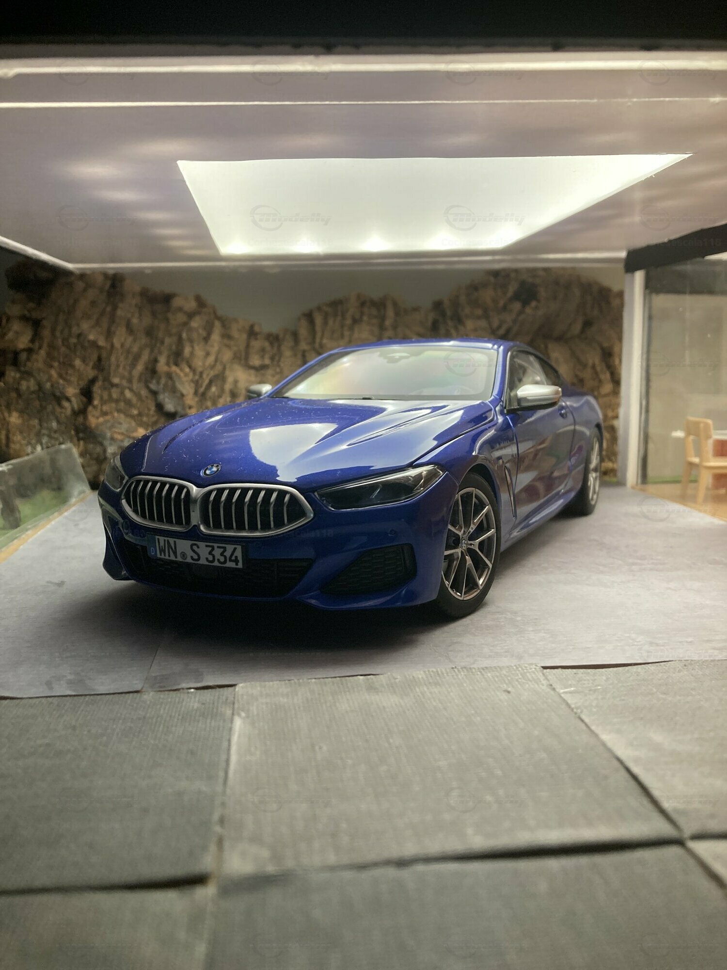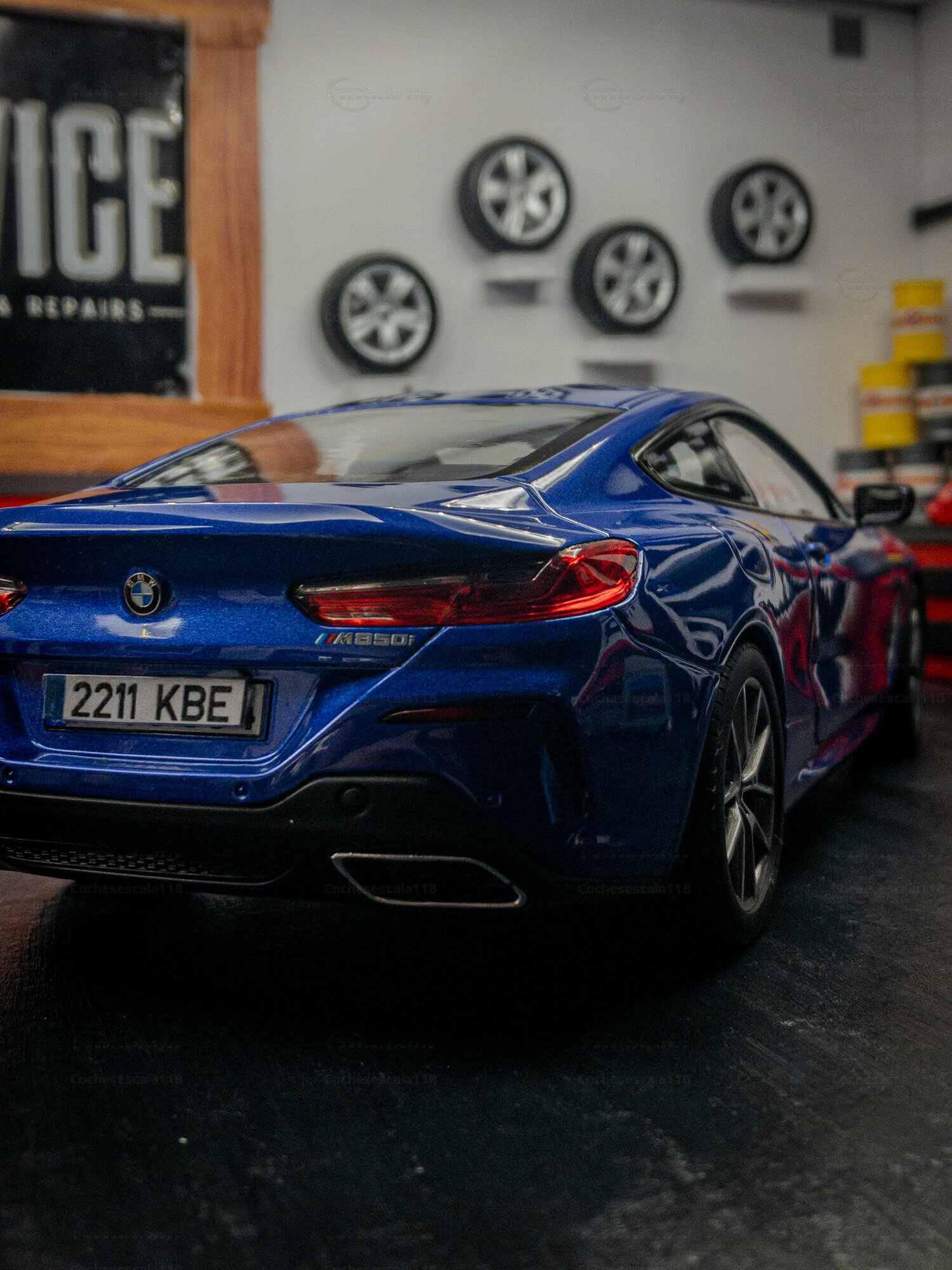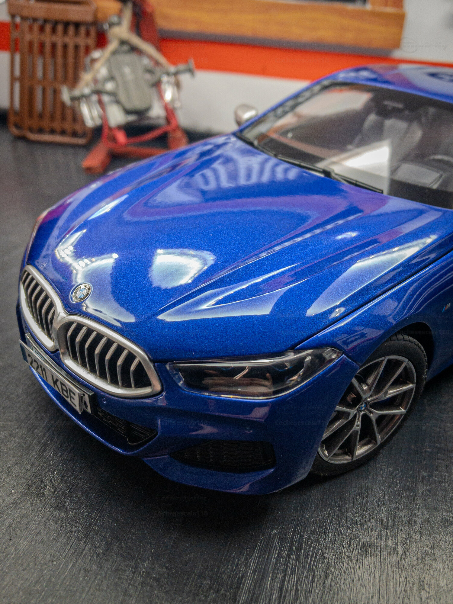 Das Modellauto, das in einer limitieren Auflage von 2500 Stück weltweit verfügbar ist, zeigt eine bemerkenswerte Lackierung in einem kräftigen Blau. Diese Farbe, oft als "Phytonic Blue" bezeichnet, betont die dynamische Form und das sportliche Aussehen des BMW M850i. Zu den sichtbaren Badges und Markierungen gehören das klassische BMW-Emblem und die M-Performance-Kennzeichnungen an den Seiten. Die Felgen im Modell sind akkurate Nachbildungen der original BMW Leichtmetallräder, die das sportliche und luxuriöse Erscheinungsbild des Fahrzeugs unterstreichen.
