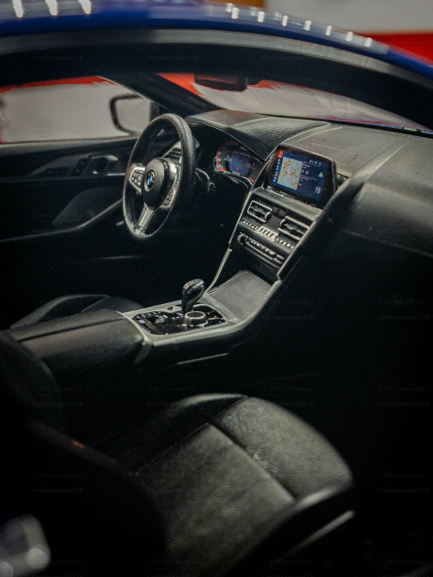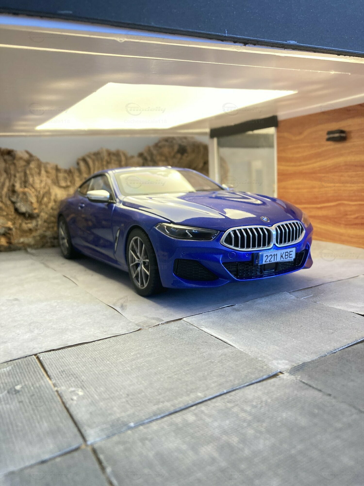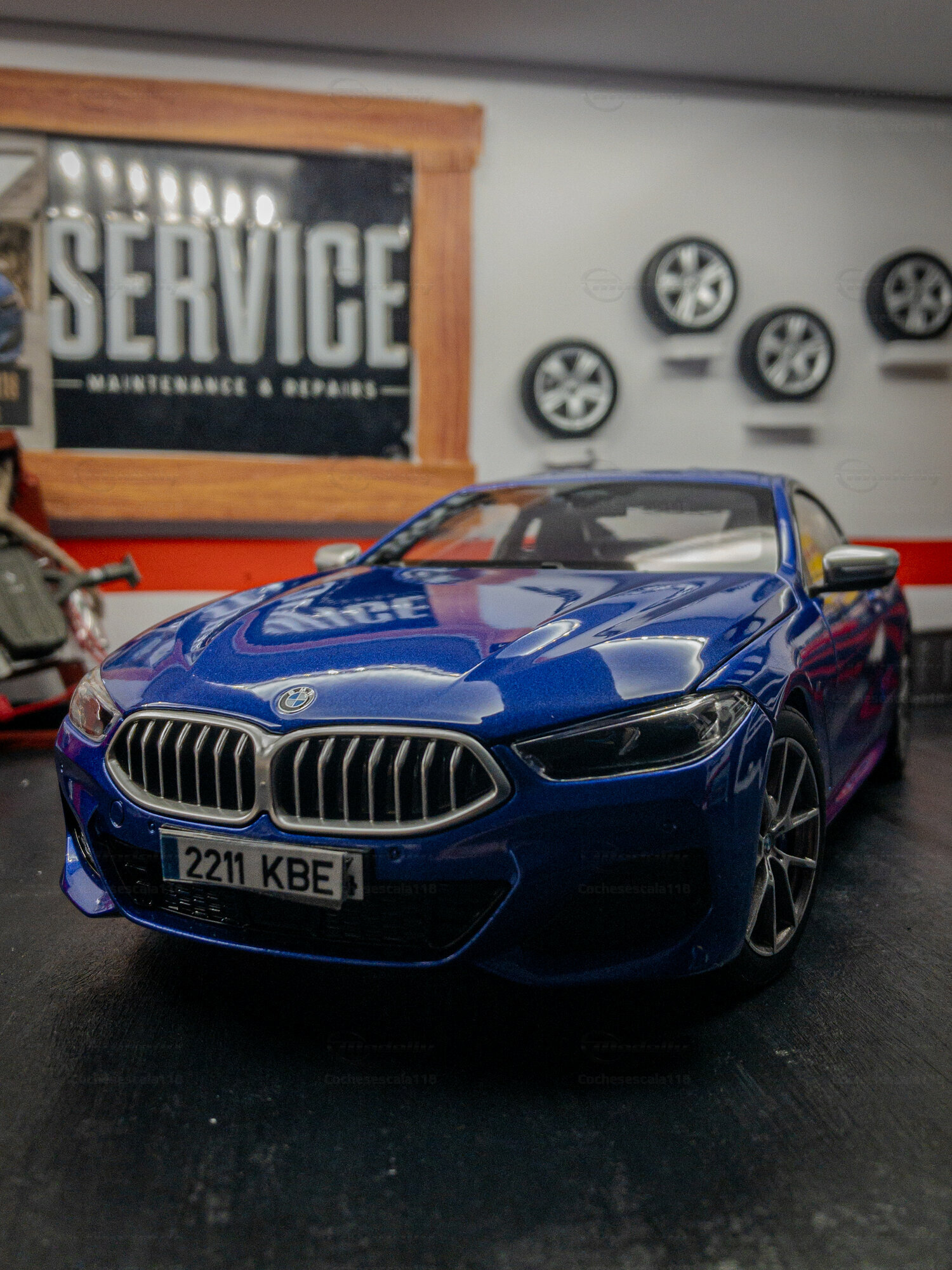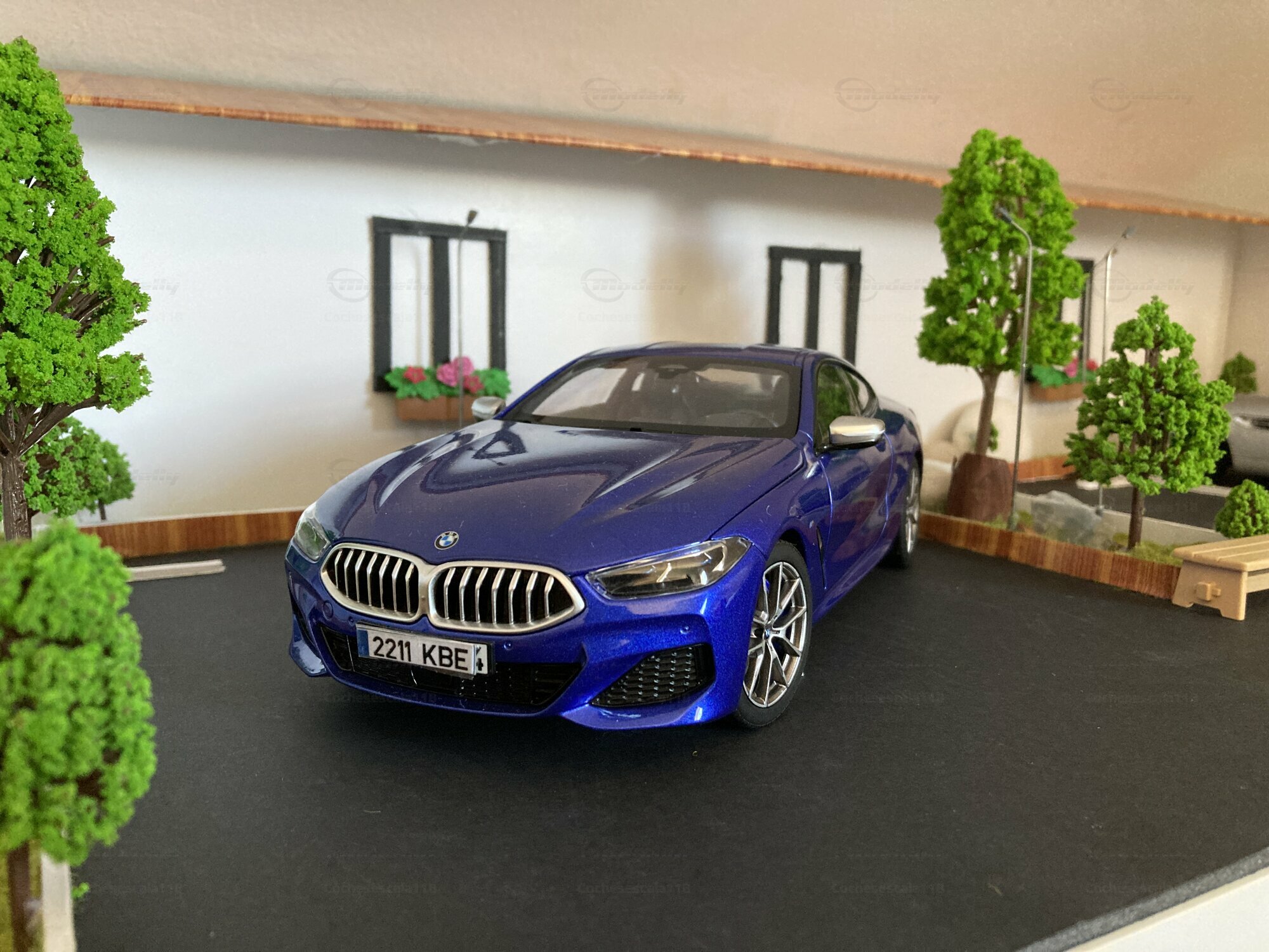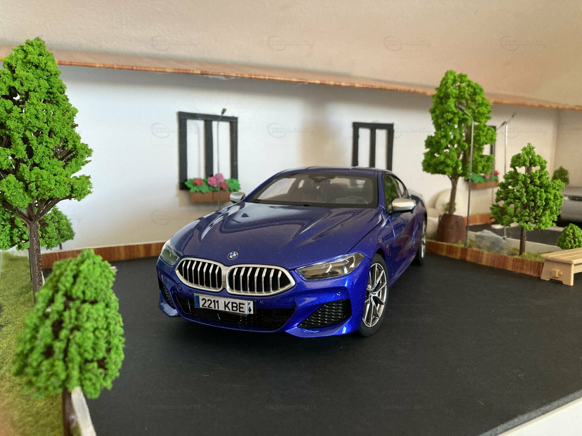 Das Modellauto, das in einer limitieren Auflage von 2500 Stück weltweit verfügbar ist, zeigt eine bemerkenswerte Lackierung in einem kräftigen Blau. Diese Farbe, oft als "Phytonic Blue" bezeichnet, betont die dynamische Form und das sportliche Aussehen des BMW M850i. Zu den sichtbaren Badges und Markierungen gehören das klassische BMW-Emblem und die M-Performance-Kennzeichnungen an den Seiten. Die Felgen im Modell sind akkurate Nachbildungen der original BMW Leichtmetallräder, die das sportliche und luxuriöse Erscheinungsbild des Fahrzeugs unterstreichen.