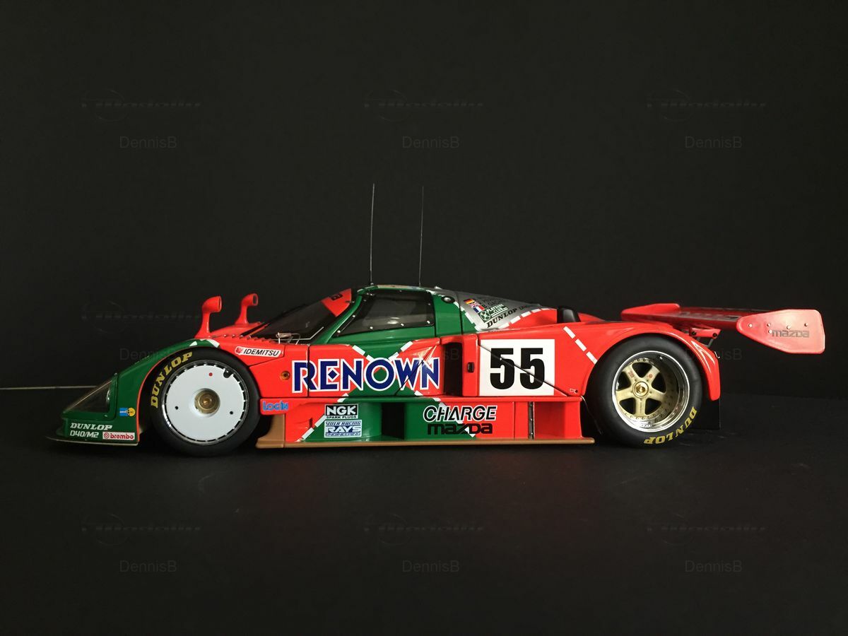 Dieser Miniaturnachbau im Maßstab 1:18 wurde von AUTOart Signature gefertigt und basiert auf dem berühmten Mazda 787B. Der Detailreichtum der Miniatur ist beeindruckend und für Sammler äußerst wertvoll. Der Miniaturwagen besteht aus einer Materialmischung und zeigt präzise Details, die dem Original nachempfunden sind. Zu den sichtbaren Details gehören Sponsorenaufkleber und die charakteristische grün-orange Farbgebung des Wagens. Auf den Fotos des Modelle von Modelly-Mitglied "DennisB" wird die hochwertige Fertigung und die hohe Detailgenauigkeit deutlich. Der Wagen trägt die Sponsoring-Logos von Renown und Charge, was seine Authentizität weiter unterstreicht.