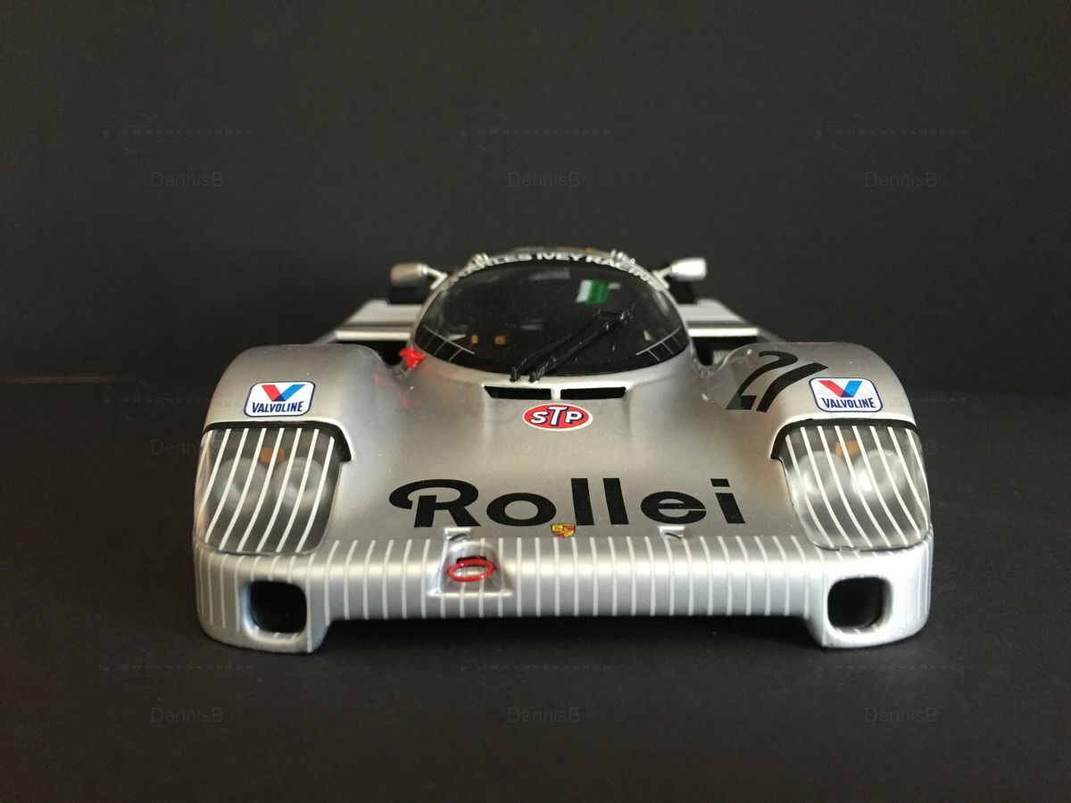 Das hier beschriebene Miniaturmodell des Porsche 956 Langheck Gruppe C in 1:18 Maßstab, hergestellt von Minichamps, zeigt eine bemerkenswerte Liebe zum Detail. Dieses Modell basiert auf Plastik und ist ein wesentlicher Bestandteil der Sammlung des Modelly-Mitglieds 'DennisB'. Auffällig sind die exakten Sponsorendekorationen wie die Rollei Logos auf der Motorhaube und den Seitentüren, sowie anderen Sponsoraufklebern wie Valvoline und STP. Die authentische Lackierung in Silber betont die geschwungene Form des Wagens und verleiht ihm ein schlankes und aerodynamisches Aussehen.