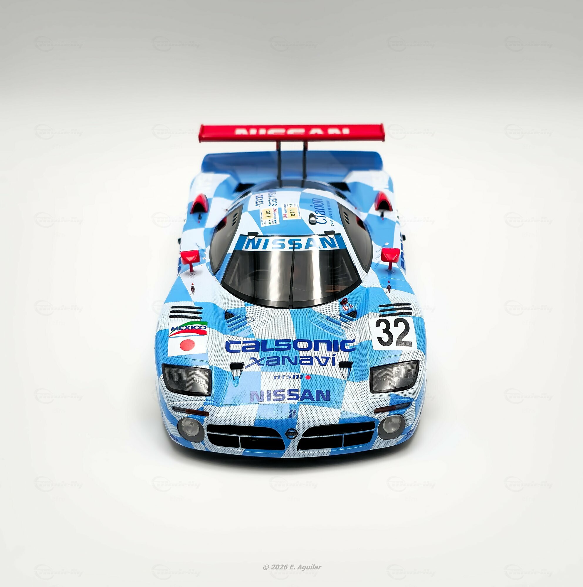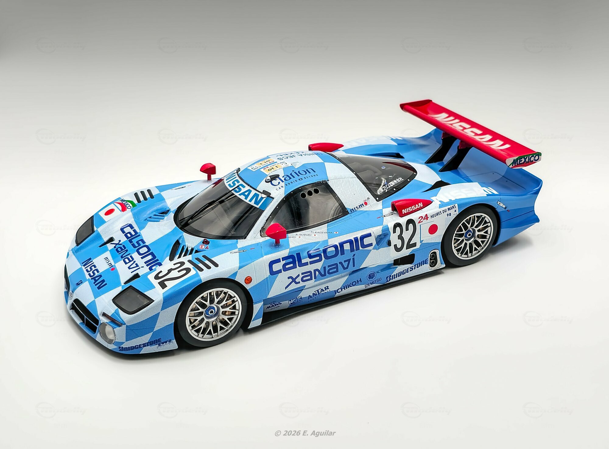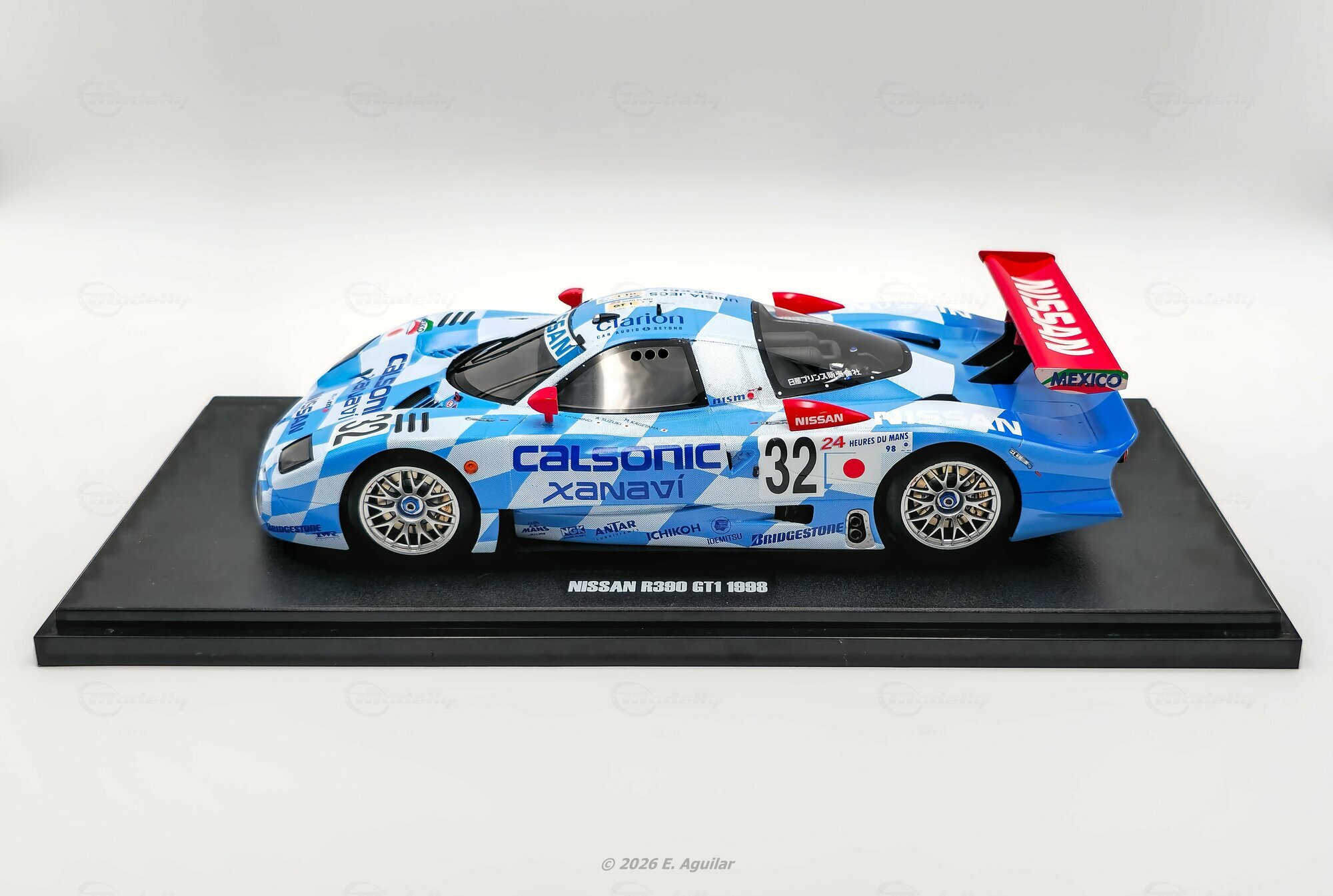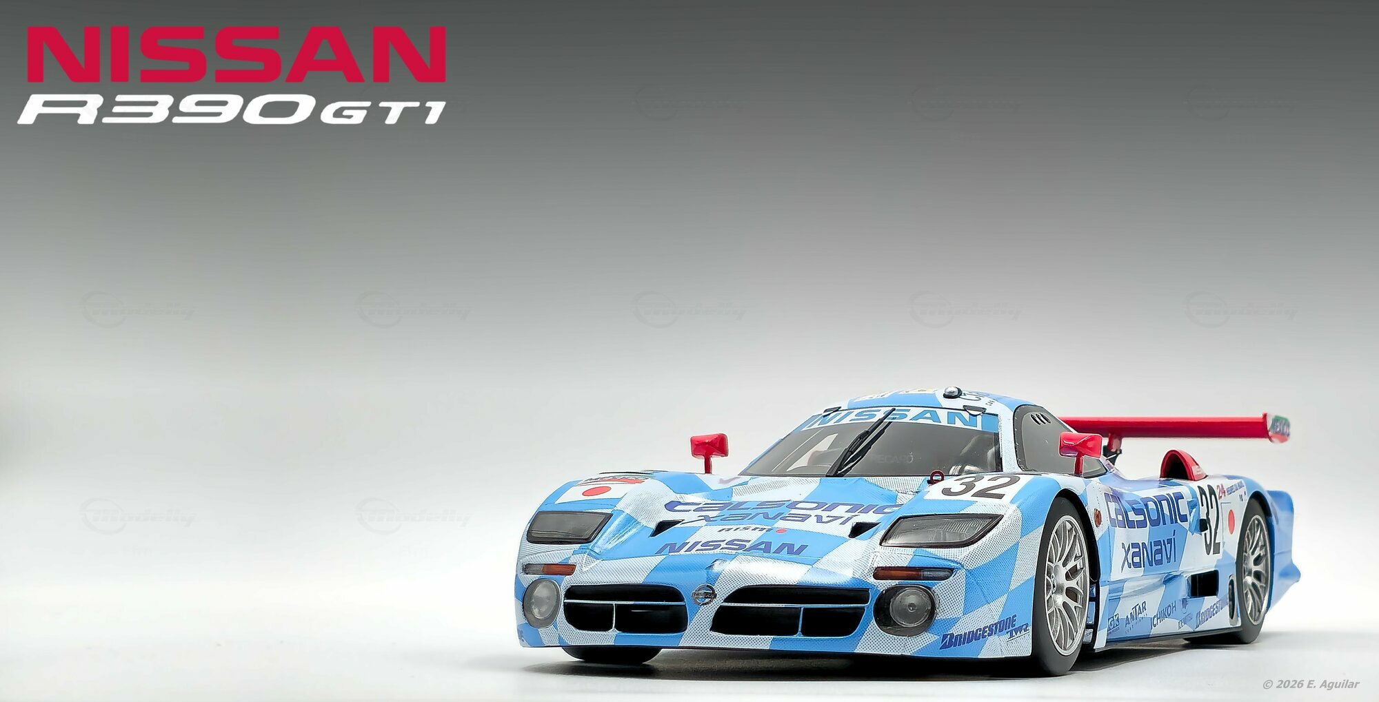 Das hier gezeigte Modell basiert auf dem Rennwagen Nissan R390 GT1, der für den Einsatz in der damaligen GT1-Klasse der 24 Stunden von Le Mans entwickelt wurde. Er entstand aus einer Kooperation von Nismo und Tom Walkinshaw Racing (TWR). Die technische Leitung und Aerodynamik lagen bei Tony Southgate, das Exterieur-Design stammt von Ian Callum. Der Wagen ordnet sich in die kurze Ära der straßenhomologierten GT1-Prototypen ein, die Mitte/Ende der 1990er die Szene prägten. Für die Homologation wurde ein einzelnes straßenzulassungsfähiges Exemplar aufgebaut. Der unmittelbare motorsportliche Vorgänger war der Nissan Skyline GT-R LM, der 1995/1996 in Le Mans startete, jedoch mit seinem turbogeladenen Reihensechszylinder und dem schwereren GT-R-Layout die Performance-Grenzen dieser Basis erreichte. Der Schritt zum reinen Mittelmotor-Carbonchassis des Nissan R390 GT1 war daher konsequent. Offiziell gehört dieses Fahrzeug zur Generation: R390 GT1 und wurde ab 1997 entwickelt und eingesetzt; die Evolutionsstufe für 1998 erhielt weitreichende aerodynamische Änderungen. Die Fotos zeigen das Modell aus der Sammlung des Modelly-Mitglieds „Efrn“.