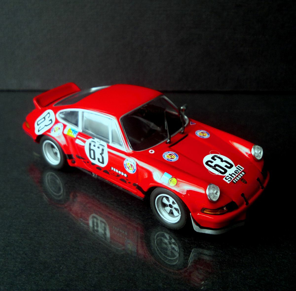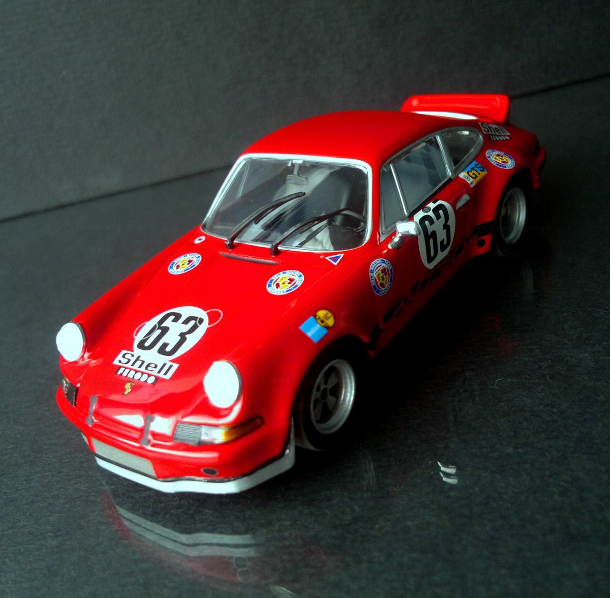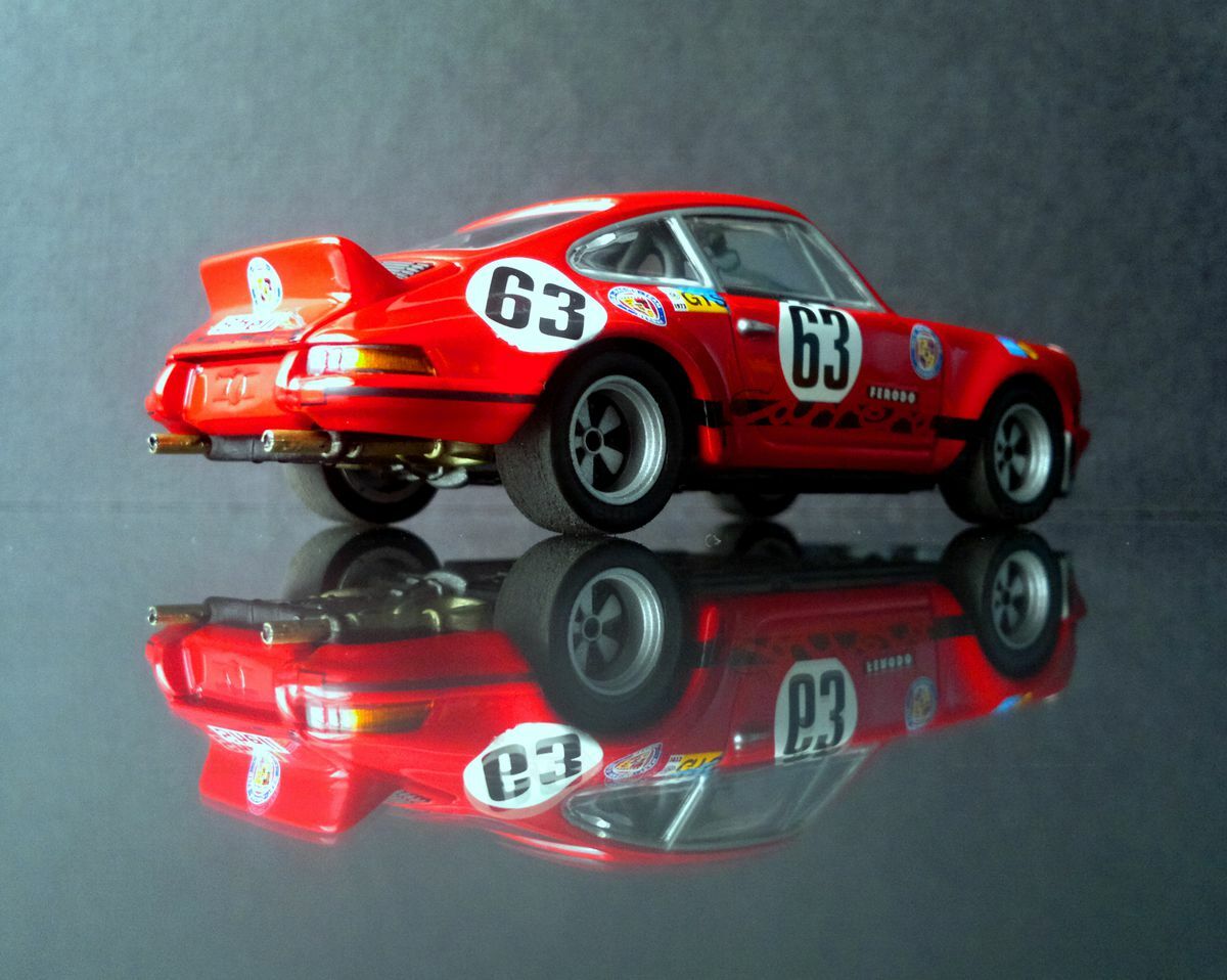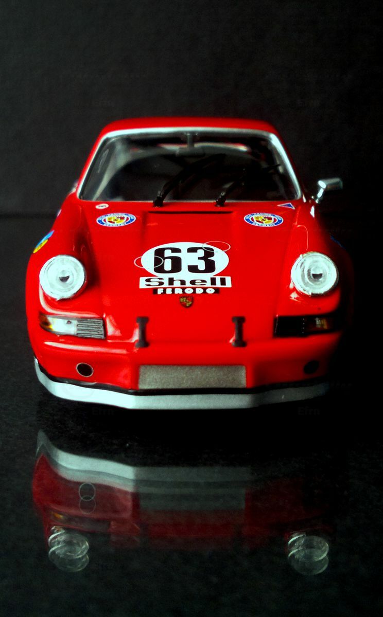 Minichamps hat den Porsche 911 Carrera RSR 2.8 im 1:43-Maßstab mit außerordentlicher Präzision und Detailtreue nachgebildet. Das Modell besteht aus hochwertigem diecast-Material und liefert einen realistischen Eindruck des Originals. Auffällig ist die rote Lackierung mit der Startnummer "63", die das Modellauto unverwechselbar macht. Diese Miniatur ist eine exakte Reproduktion des Fahrzeugs, das beim 24-Stunden-Rennen von Le Mans 1973 von Reinhold Jöst und Jürgen Barth gefahren wurde. Das Modell enthält detaillierte Aufkleber und Sponsorenlogos, darunter das auffällige Shell-Logo. Die präzise Gestaltung der Scheinwerfer, der scharfen Konturen und der unterschiedlichen Rennaufkleber verleihen dem Modell eine bemerkenswerte Authentizität. Auf den Fotos der Sammlung von "Efrn" sind diese Details deutlich zu erkennen und unterstreichen die Qualität des Modells.