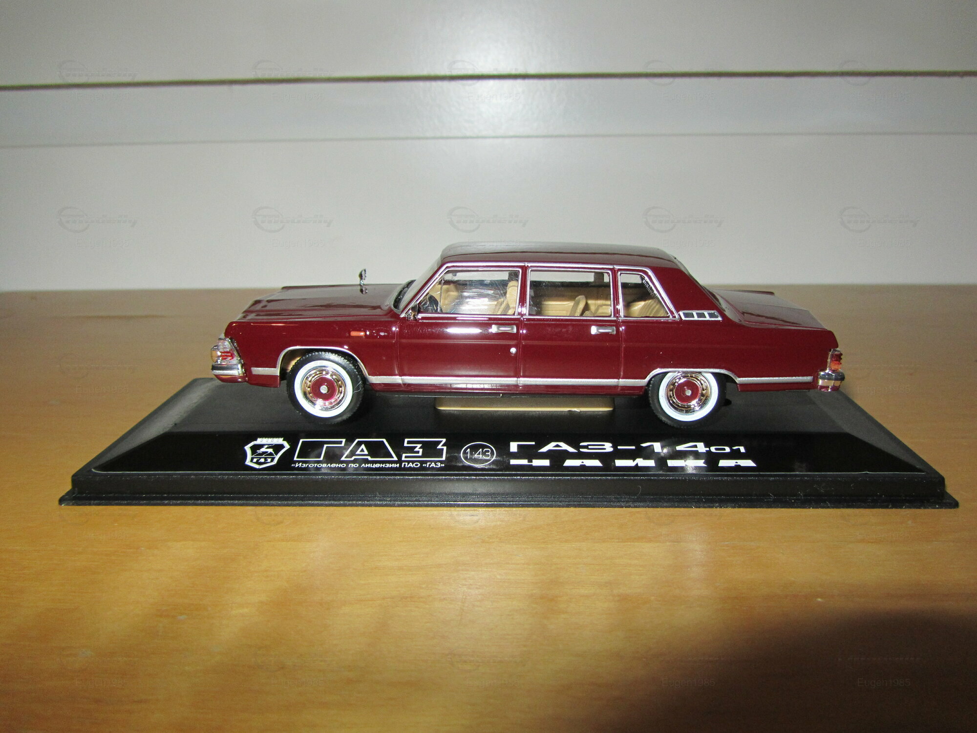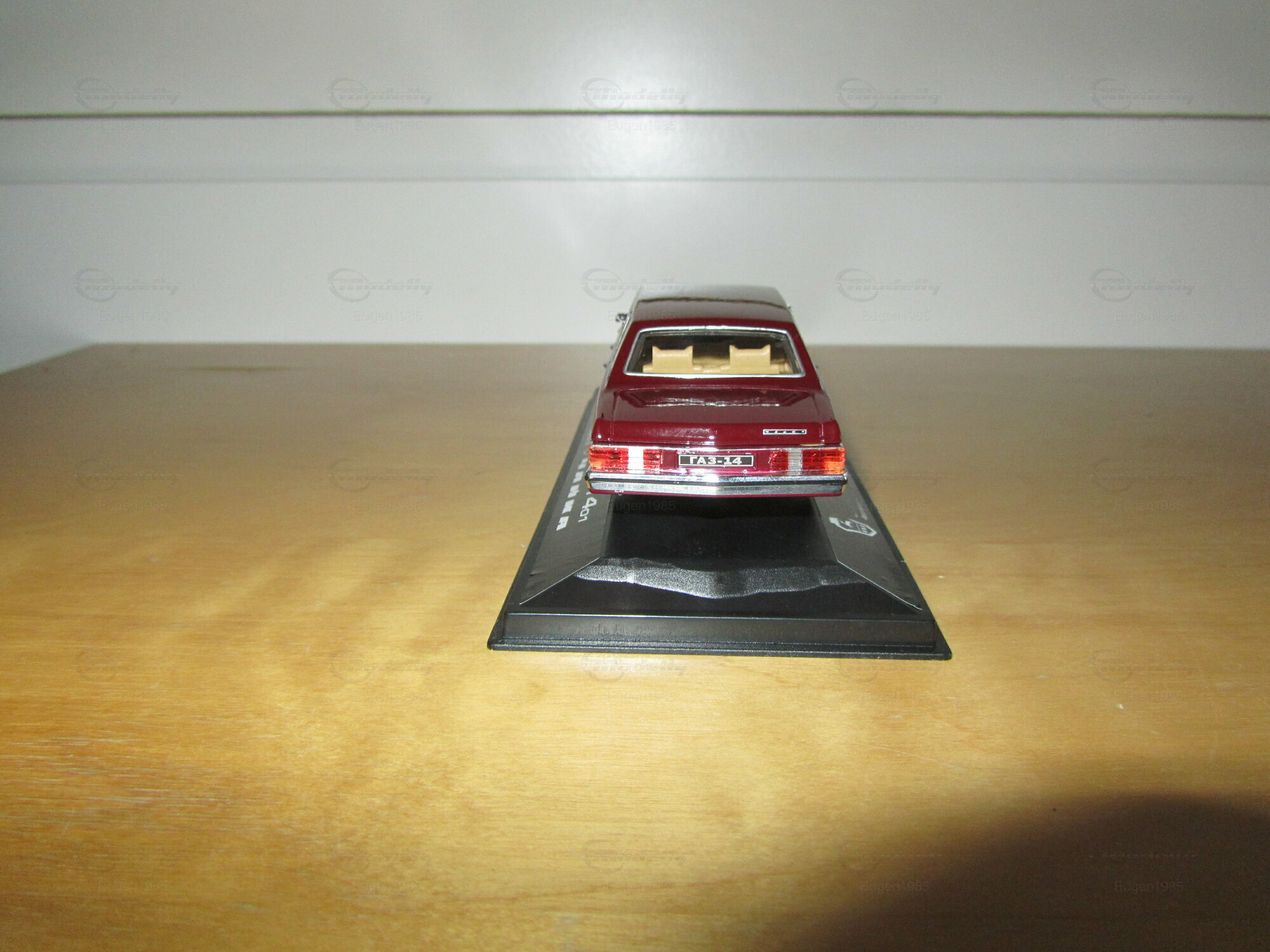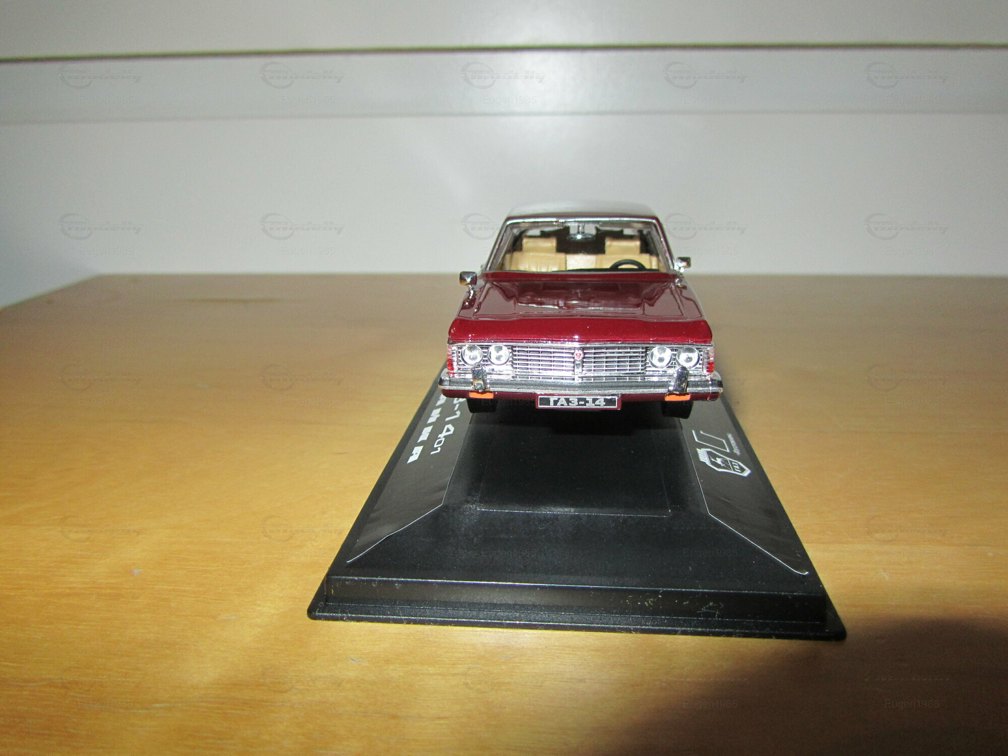 Das hier im Besitz des Modelly-Mitglieds "Eugen1985" befindliche Modellauto von Nash Avtoprom im Maßstab 1:43 spiegelt die Details des Originals akkurat wider. Bemerkenswert ist die dunkelrote Lackierung, die mit silberfarbenen Chromlinien flankiert wird. Der Innenraum im Beige-Ton sticht durch präzise gefertigte Sitze und Armaturenbrettdetails hervor. Die Felgen des Modells sind originalgetreu nachgebildet – wenn auch der Hersteller der Felgen nicht sofort ersichtlich ist. Auffällig sind ebenfalls die plastisch modellierten Rückscheinwerfer und der große Kühlergrill, die dem Modell einen authentischen Look verleihen. Die Präsentation auf einer stabilen schwarzen Basis mit dem Schriftzug „GAZ-14“ macht die Ausstellung in einer Sammlervitrine besonders ansprechend.