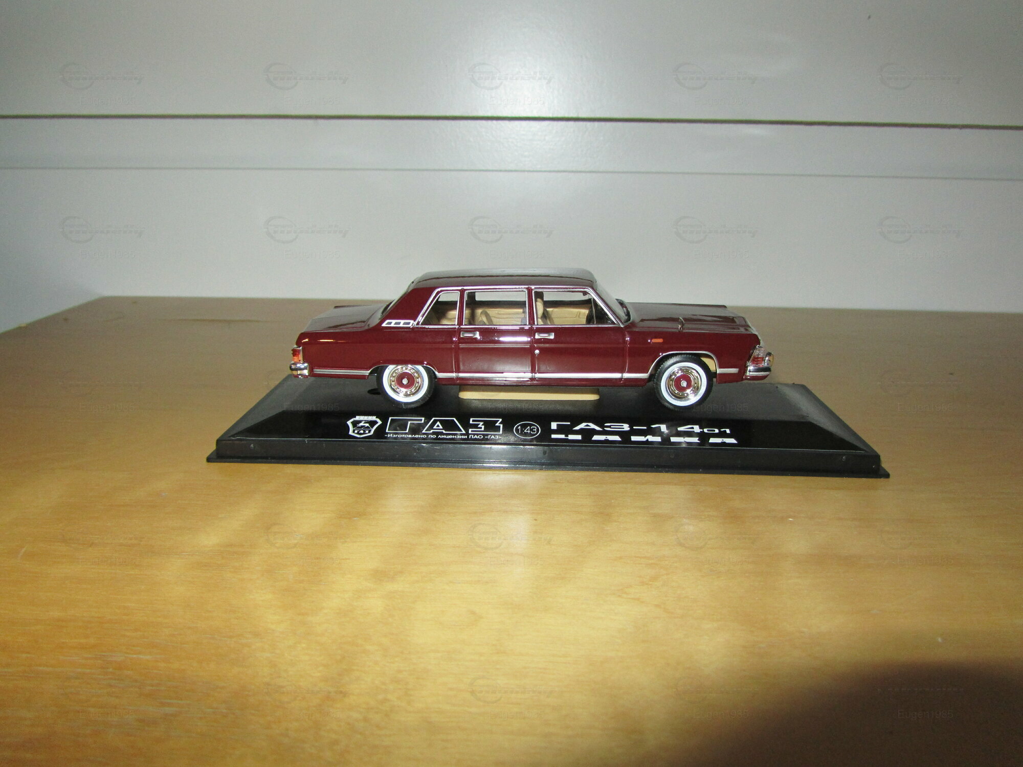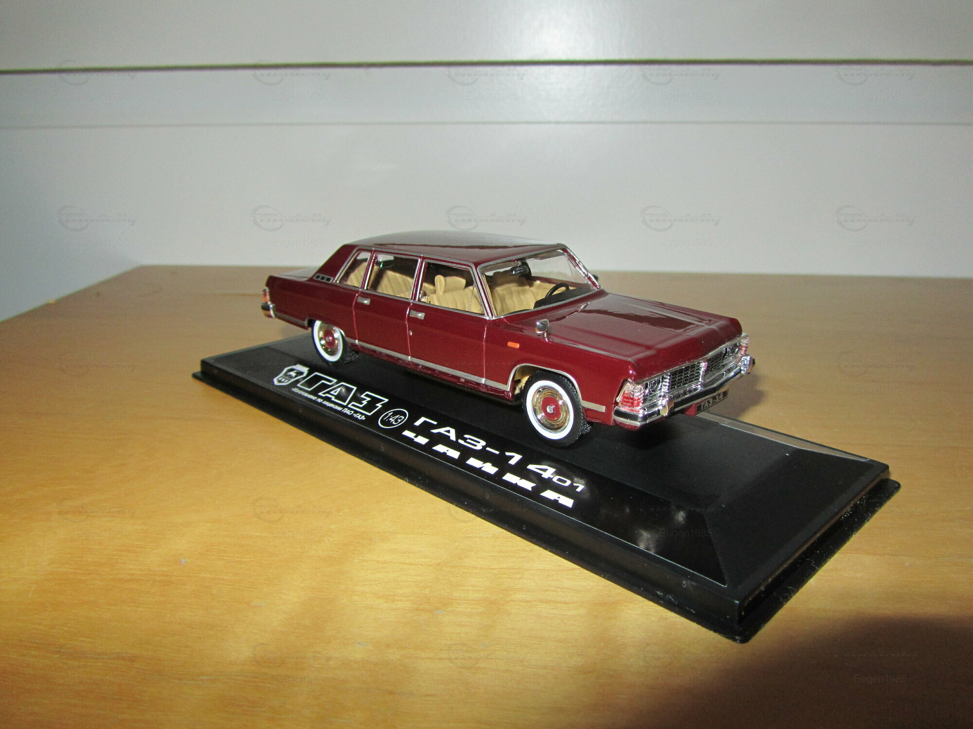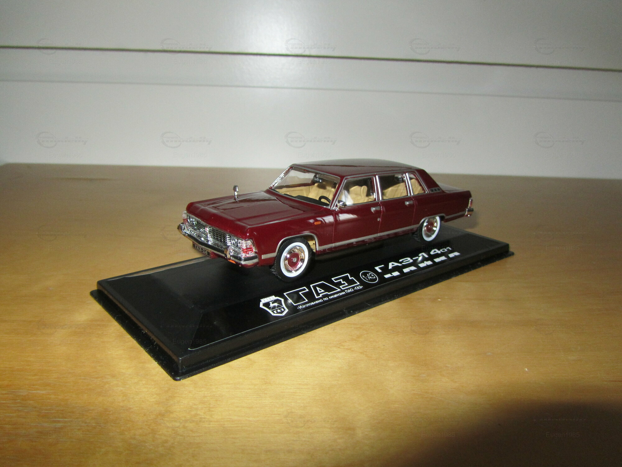 Das hier im Besitz des Modelly-Mitglieds "Eugen1985" befindliche Modellauto von Nash Avtoprom im Maßstab 1:43 spiegelt die Details des Originals akkurat wider. Bemerkenswert ist die dunkelrote Lackierung, die mit silberfarbenen Chromlinien flankiert wird. Der Innenraum im Beige-Ton sticht durch präzise gefertigte Sitze und Armaturenbrettdetails hervor. Die Felgen des Modells sind originalgetreu nachgebildet – wenn auch der Hersteller der Felgen nicht sofort ersichtlich ist. Auffällig sind ebenfalls die plastisch modellierten Rückscheinwerfer und der große Kühlergrill, die dem Modell einen authentischen Look verleihen. Die Präsentation auf einer stabilen schwarzen Basis mit dem Schriftzug „GAZ-14“ macht die Ausstellung in einer Sammlervitrine besonders ansprechend.