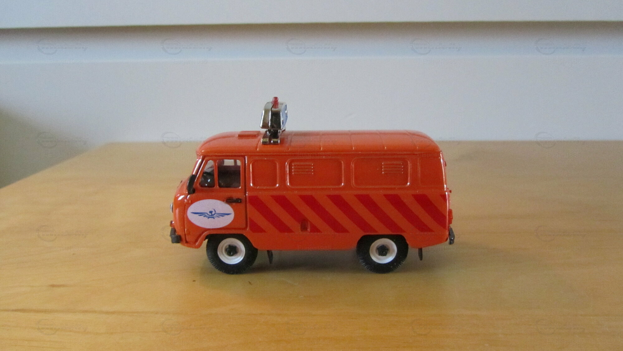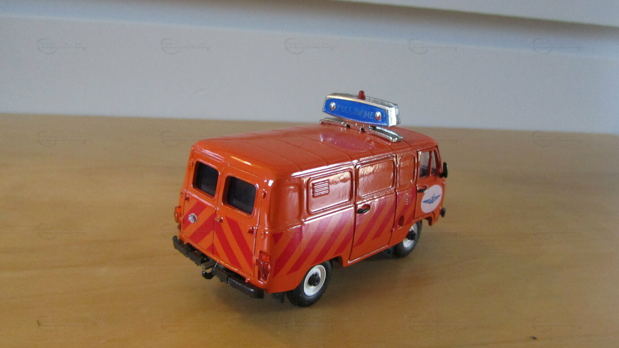 Das 1:43 Modell des UAZ 452, hergestellt von Saratov/ Agat, ist ein detailgetreues Abbild des Originals. Dieser Modellwagen, der aus dem Material Diecast gefertigt ist, fängt die charakteristischen Merkmale des echten Fahrzeugs präzise ein. Die auffällige orangene Lackierung mit den diagonalen roten Streifen sowie das Aeroflot-Logo auf den Seiten geben dem Modell die typische Erscheinung eines Follow Me-Fahrzeugs auf Flughäfen. Das Modell verfügt zudem über detaillierte Nachbildungen der Scheinwerfer, Radkappen und anderen charakteristischen Formen des UAZ 452. Diese Genauigkeit und die Wahl der Farben machen diesen Miniaturtransporter zu einem Highlight in jeder Modellsammlung.
