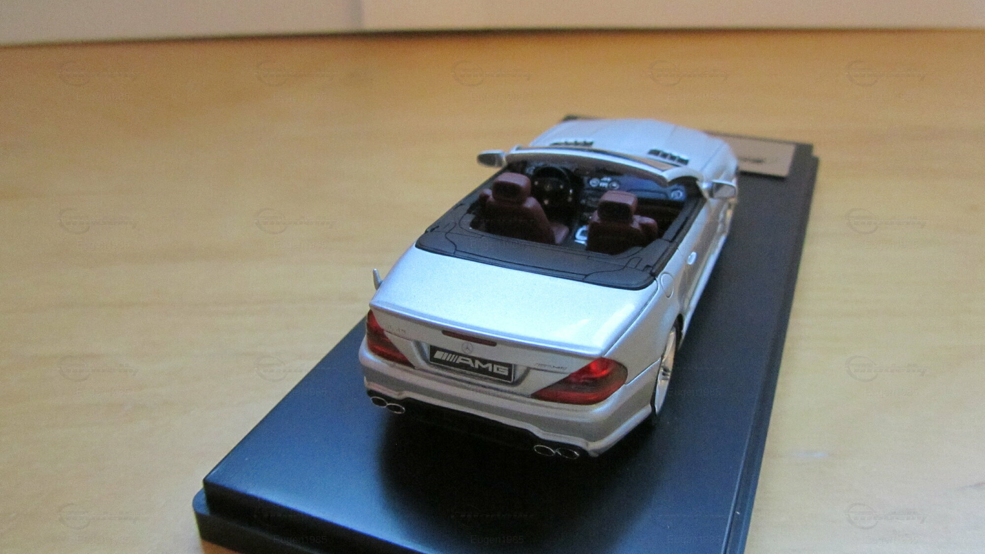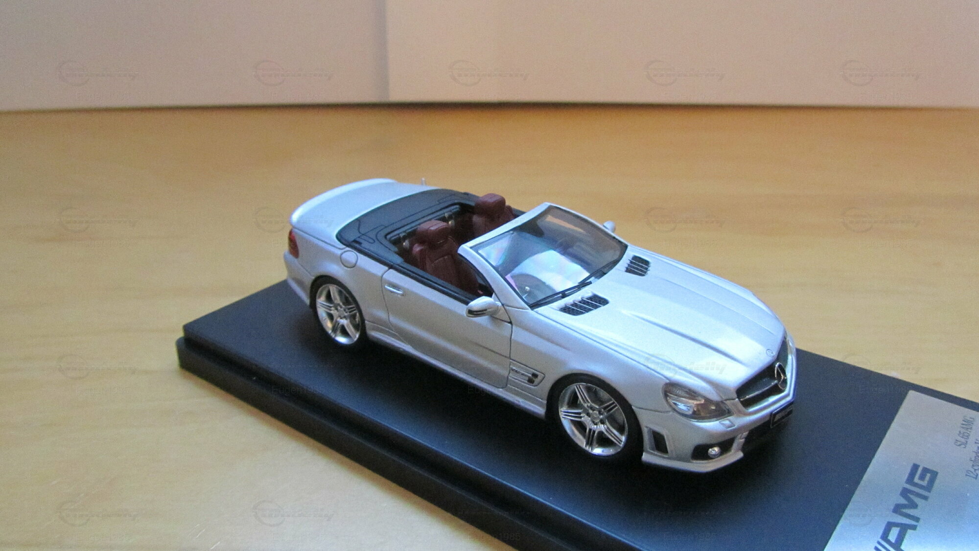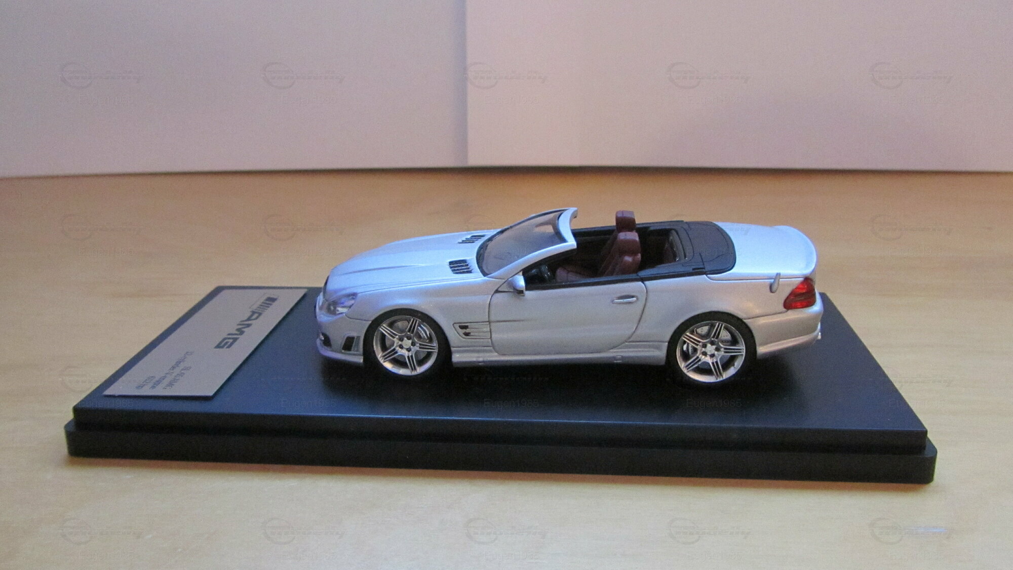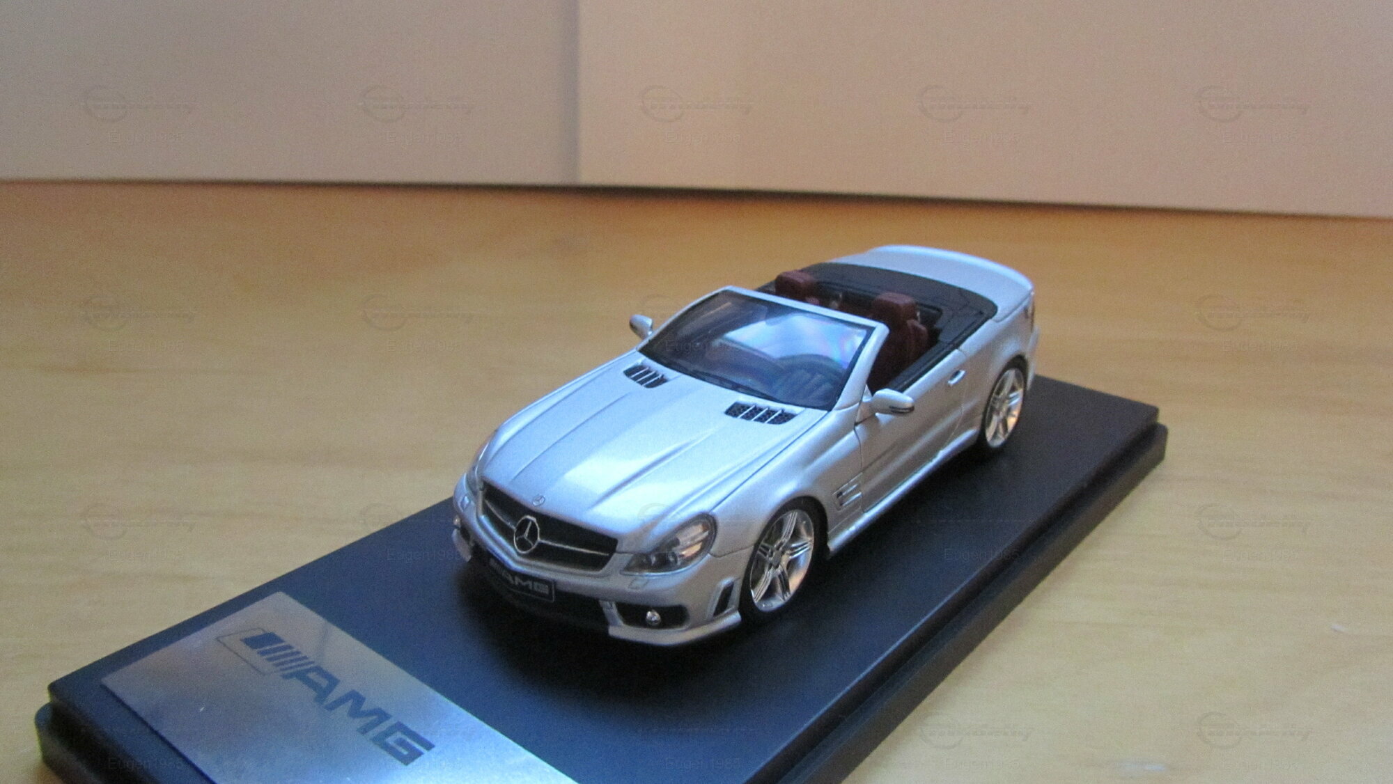 Die im Maßstab 1:43 gefertigte Miniatur des Mercedes Benz SL65 AMG Cabrio von Schuco ist ein Sammlerstück, das höchste Detailgenauigkeit aufweist. Gefertigt aus hochwertigem Zinkdruckguss (diecast), zeigt das Modell in der Sammlung von Modelly-Mitglied "Eugen1985" den SL65 in einer präzisen Miniaturversion. Auf den Fotos ist ersichtlich, dass die Miniatur die charakteristischen Designelemente des Originals, wie die verchromten Lufteinlässe und den ikonischen Mercedes-Stern auf dem Kühlergrill, exakt nachbildet. Auch die markanten AMG-Logos auf der Vorderseite und den Seiten des Fahrzeugs fehlen nicht. Die silberfarbene Lackierung ist dem Original nachempfunden und verleiht der Miniatur ein ebenso elegantes Erscheinungsbild wie dem Originalfahrzeug.