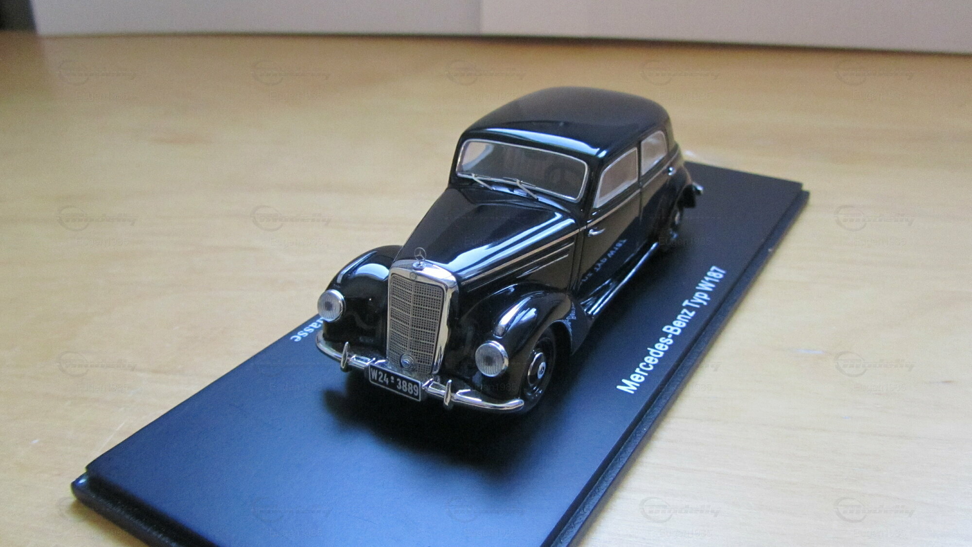 Für Sammler und Liebhaber von Modelly ist die Miniatur des Mercedes-Benz 220S Limousine Typ W187 im Maßstab 1:43 von Spark Model ein beeindruckendes Beispiel detailgetreuer Nachbildung. Gefertigt aus Diecast, glänzt die Miniatur durch eine exakte Replik aller äußeren Merkmale des Originals. Die Modell wird von dem Mitglied "Eugen1985" in seiner Sammlung ausgestellt. Auffällig an diesem Modell ist die sorgfältige Verarbeitung der Chromelemente, besonders der Kühlergrill im V-Design und die stilistisch passenden, runden Scheinwerfer. Die Lackierung der Miniatur ist in einem tiefen Schwarztön gehalten, was dem Modell eine vornehme und gleichzeitig zeitlose Ausstrahlung verleiht. Die exakte Nachbildung des Emblems und der Typenbezeichnung am Heck zeigt die Liebe zum Detail, die Spark Model in jede Miniatur steckt. Wie bei dem Originalmodell, sind auch die Rücklichter und die Zierleisten in realistischer Weise nachempfunden, wodurch dieses Modell für den Sammler einen hohen Wert in optischer und historischer Hinsicht darstellt.