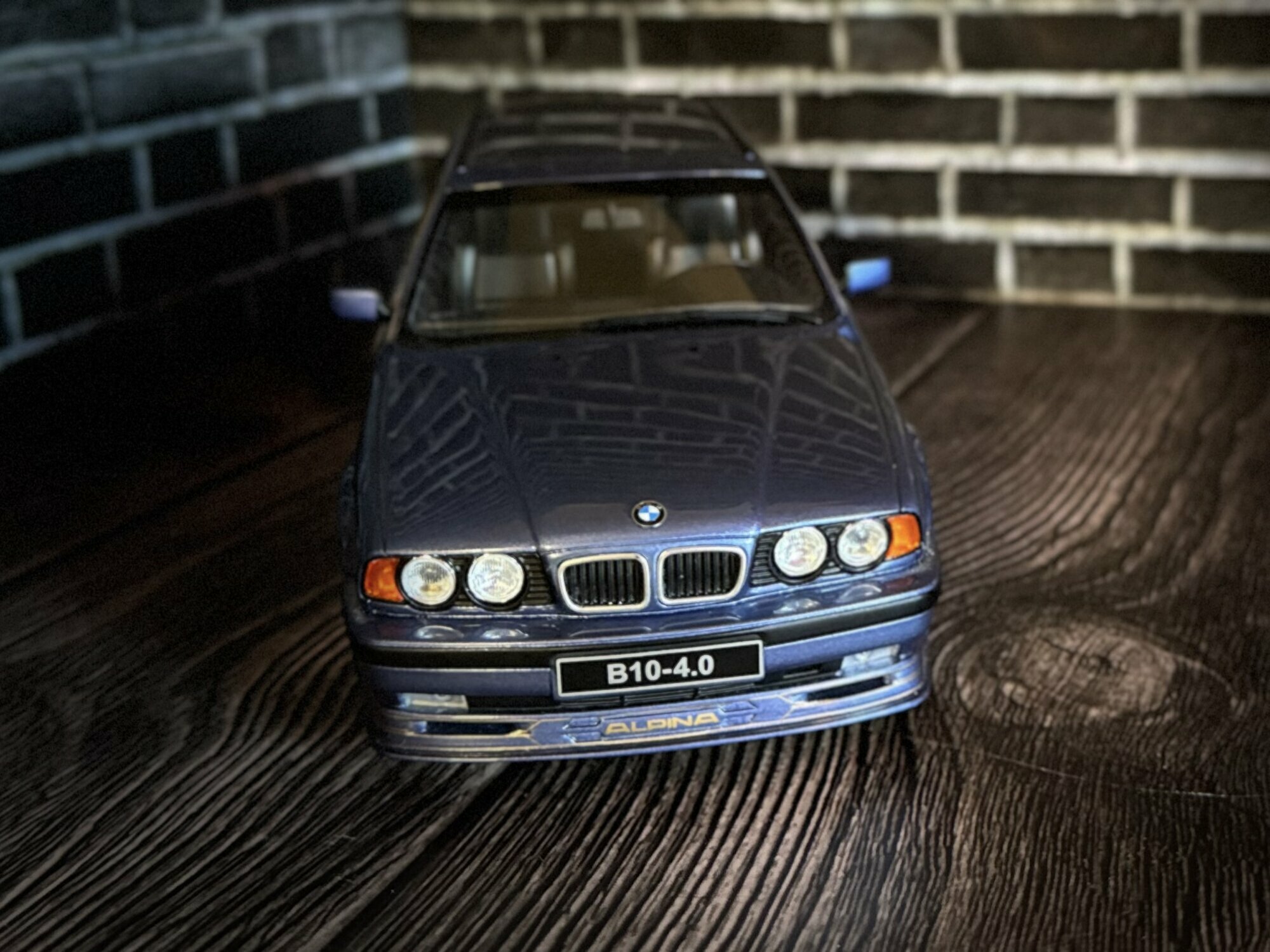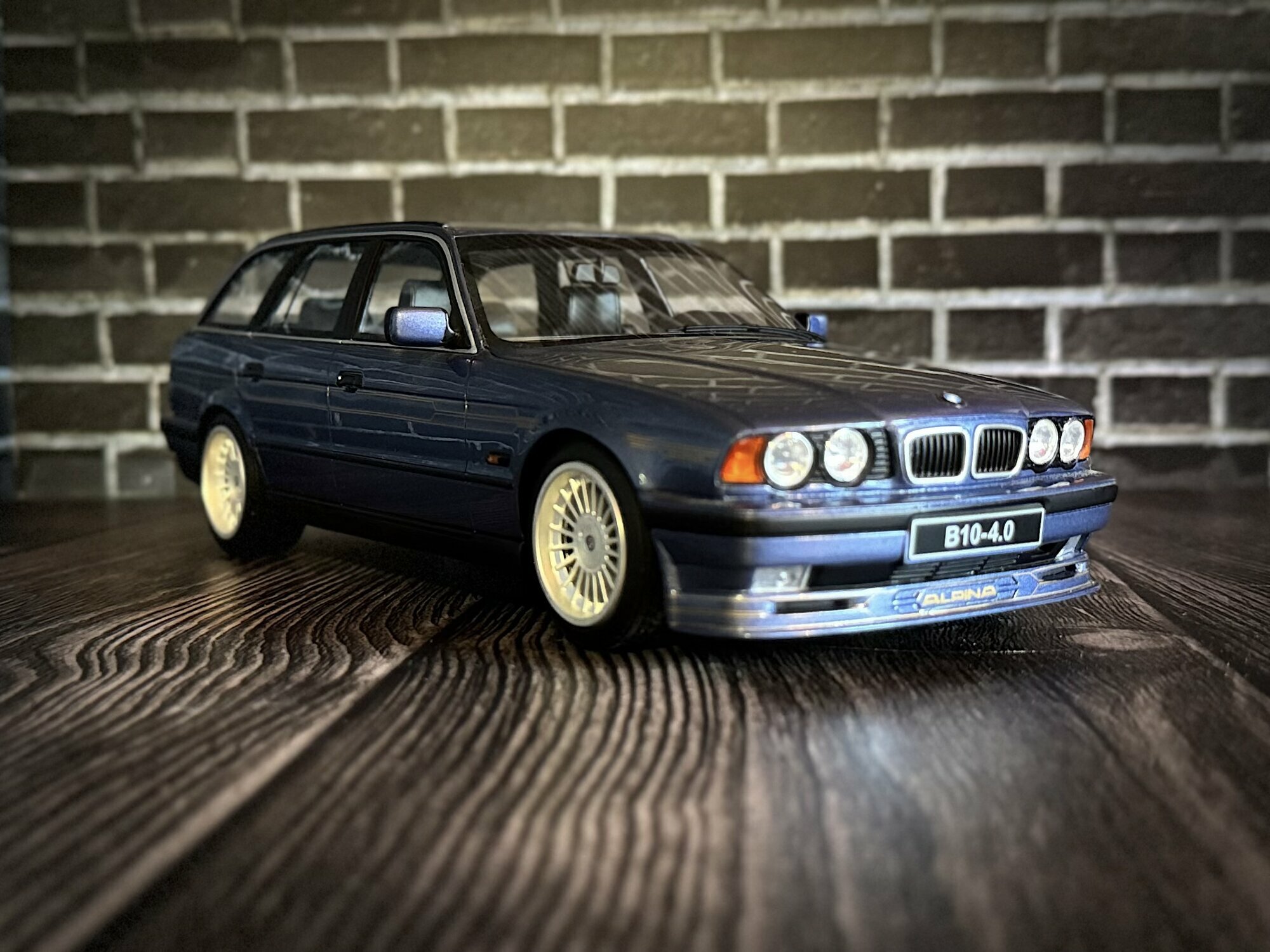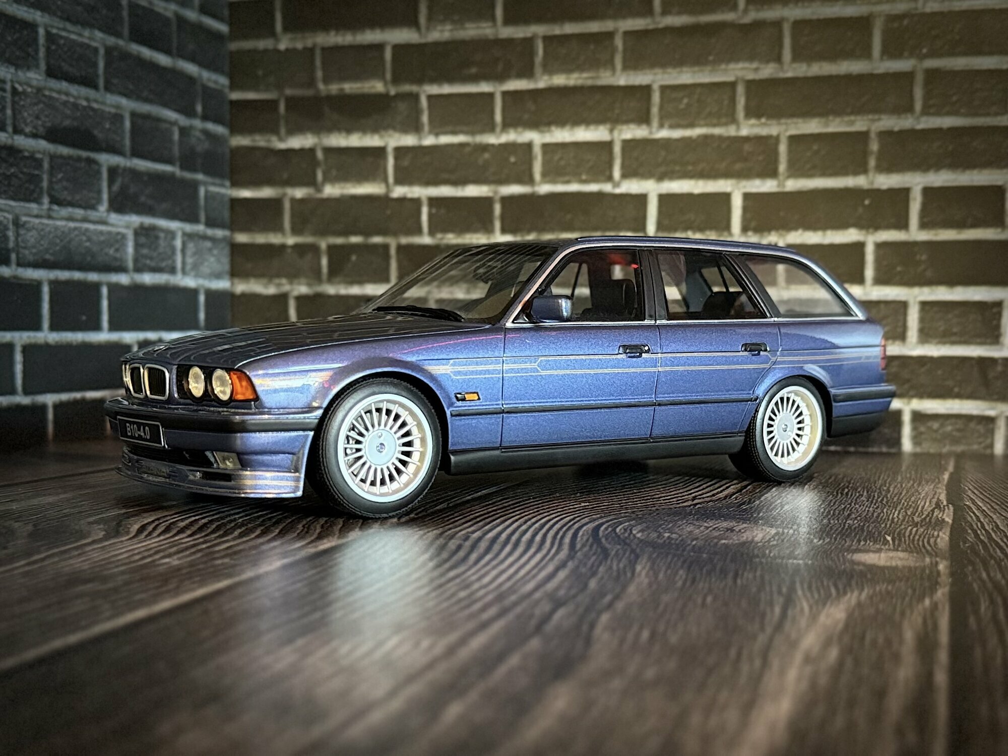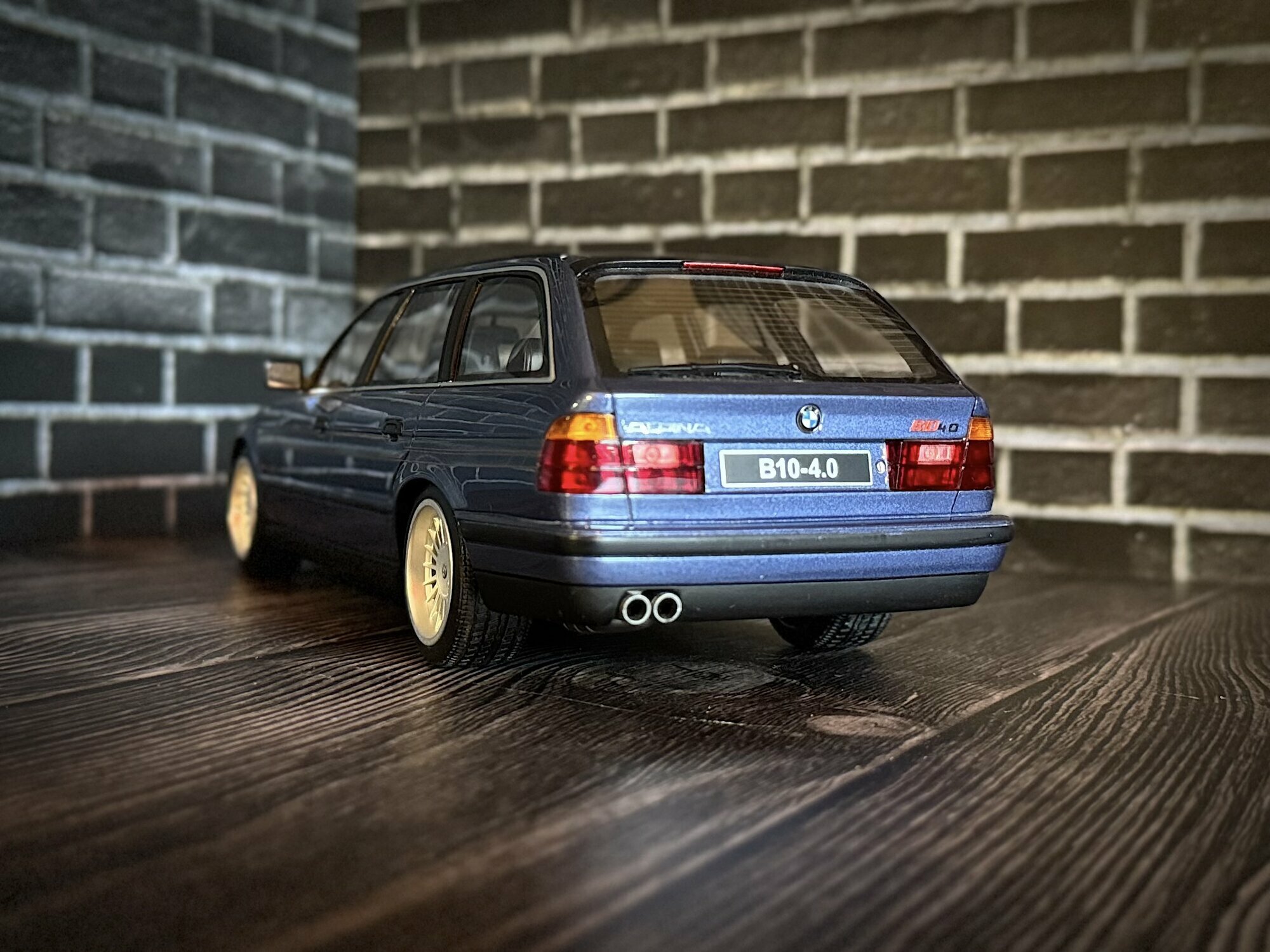 Die Bilder zeigen ein Modellauto aus der Kollektion des Modelly-Mitglieds „Evil500“. Es handelt sich um ein Modell im Maßstab 1:18 von Ottomobile, gefertigt auf Basis von diecast (Druckguss). Das Exemplar ist limitiert auf 3.000 Stück weltweit und damit für Sammler klar eingrenzbar. Frontseitig sind die Doppelscheinwerfer mit Klarglasoptik sauber umgesetzt; der BMW-Kühlergrill und die zierliche ALPINA-Frontlippe tragen die Schriftzüge „ALPINA“ und „B10-4.0“ wie beim Vorbild. Die Karosserie ist in einem feinkörnigen Blau-Metallic gehalten; entlang der Flanken verlaufen die typischen, zurückhaltenden ALPINA-Dekorstreifen. Die im Modell montierten Felgen greifen die Mehrspeichenform der ALPINA Classic korrekt auf; je nach Lichteinfall wirken sie silbern oder in einem leicht goldenen Ton, was den Kontrast zur dunklen Karosserie erhöht. Hinten finden sich die zweiteilige Heckleuchte, das Doppelendrohr links und die korrekte Prägung der Heckklappe mit Typkennzeichnung. Die Proportionen des Tourings – langer Dachverlauf, große Heckklappe und kurze Überhänge – sind stimmig getroffen. Türen und Hauben sind flächenbündig dargestellt; die Spaltverläufe sind gleichmäßig. Im Innenraum lassen sich Sportsitze, Mittelkonsole, Dreispeichenlenkrad sowie Armaturen mit Skalendruck erkennen. Als Modellauto im Maßstab 1:18 von Ottomobile ist es für vitrinentaugliche Detailtreue ausgelegt; gleichzeitig sorgt die diecast-Bauweise für ein spürbares Gewicht. Auch dieses Exemplar trägt die Limitierungsangabe limitiert auf 3.000 Stück weltweit auf der Verpackung.