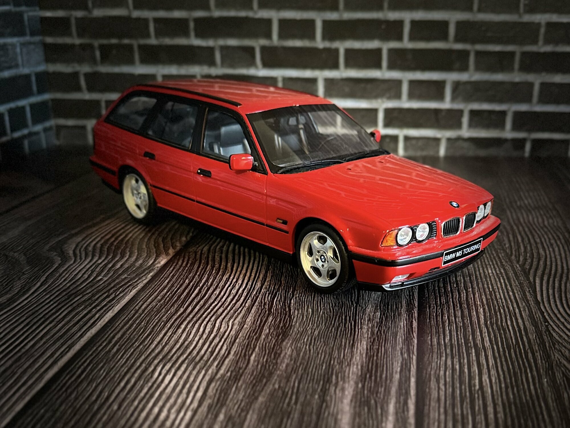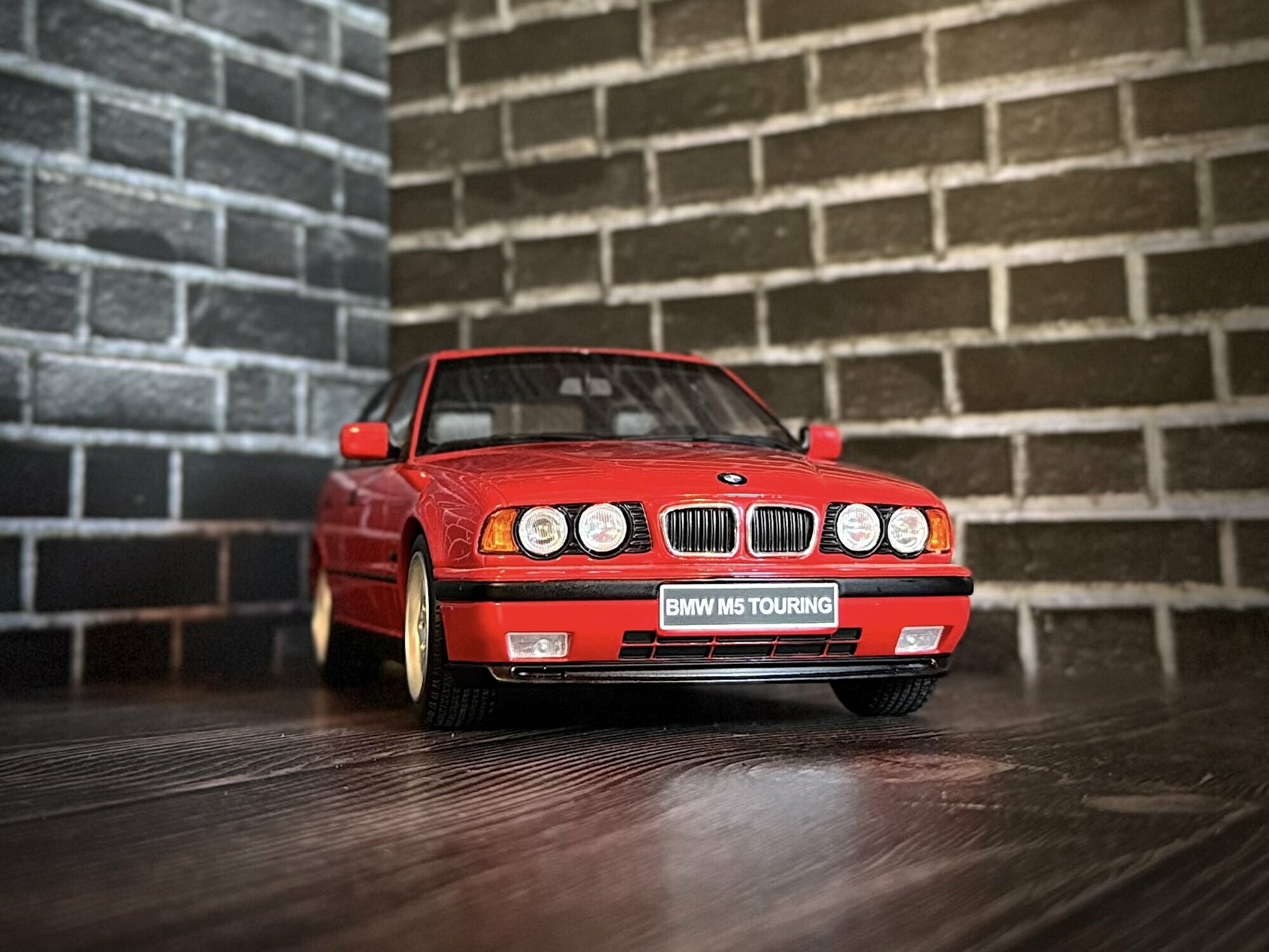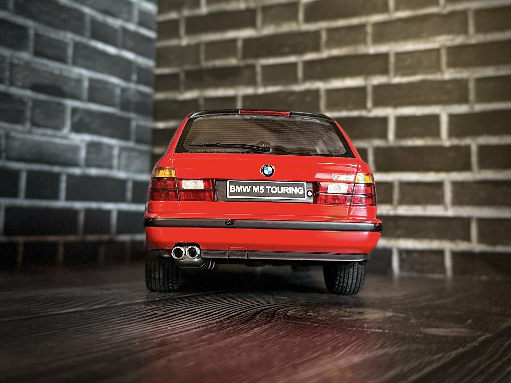 Das abgebildete Modell ist ein Modellauto im Maßstab 1:18 von Ottomobile, gefertigt aus Diecast-Druckguss. Es gehört zur Sammlung des Modelly-Mitglieds „Evil500“. Dieses Modell bildet die Linienführung des BMW M5 Touring mit klaren Sicken, den vier Rundscheinwerfern und der BMW-Niere korrekt ab. Die Front trägt ein Kennzeichen mit der Aufschrift „BMW M5 TOURING“, die Stoßfänger sind mit schmalen schwarzen Zierleisten umgesetzt, und am Heck ist die Doppelendrohr-Anlage sichtbar. Die seitliche Schutzleiste, die Dachreling und der dezente Dachkantenspoiler entsprechen der Touring-Silhouette des Vorbilds. Die Felgen orientieren sich an den erwähnten M System II „Throwing Star“ und passen stimmig zur Karosserie. Die Lackfarbe wirkt als kräftiges Rot, wahrscheinlich in Anlehnung an den BMW-Farbton „Mugellorot“, mit schwarzen Kontrastelementen an Fensterrahmen und Stoßfangern. In der Kabine lässt sich ein dunkles Interieur erkennen, inklusive Sportsitzen, Mittelkonsole und Dreispeichenlenkrad. Dieses Modellauto im Maßstab 1:18 von Ottomobile ist als limitiert auf 3.000 Stück weltweit (eines von 3000) gekennzeichnet und richtet sich somit an Sammler, die eine klar dokumentierte Auflage bevorzugen.
