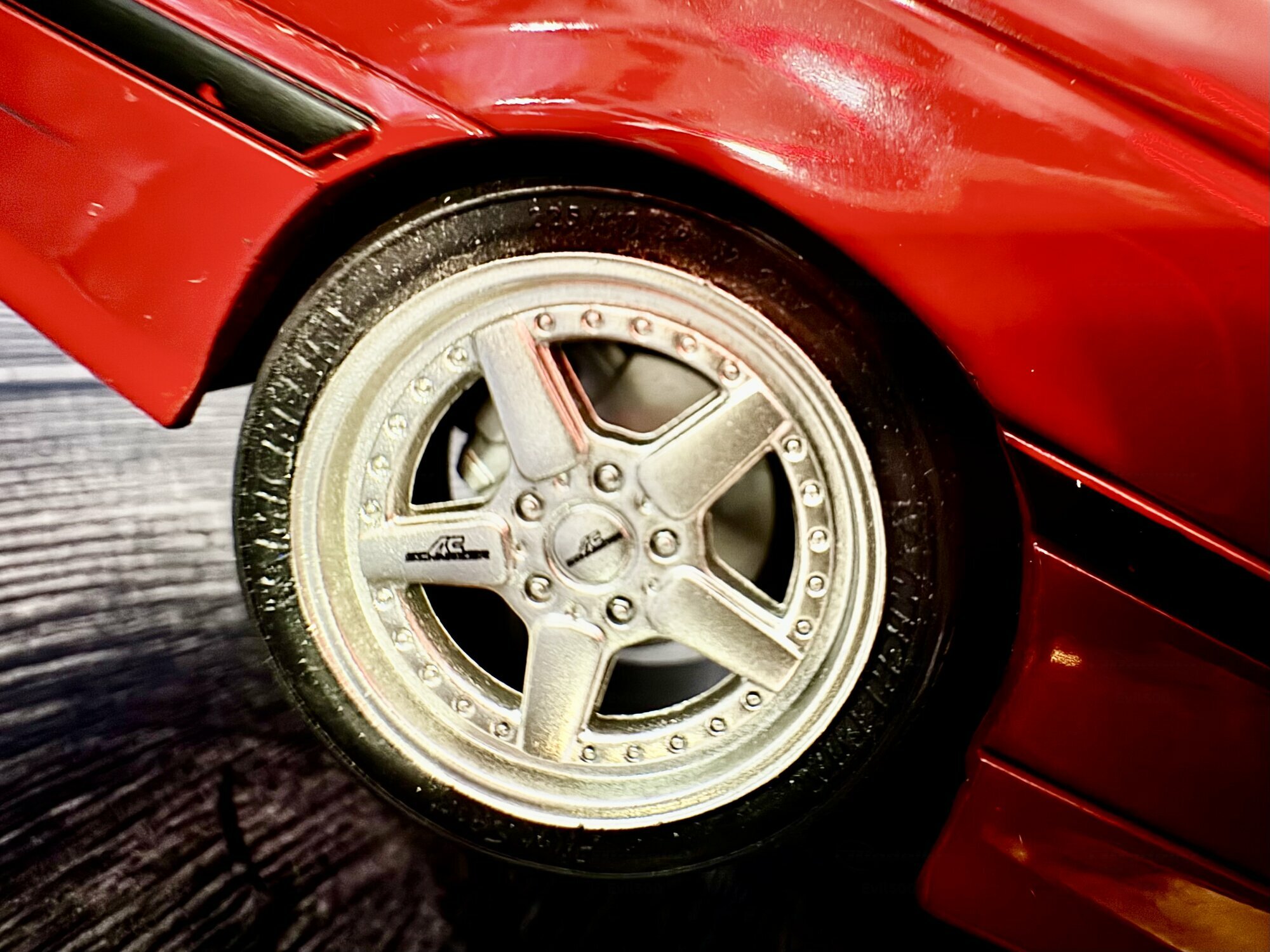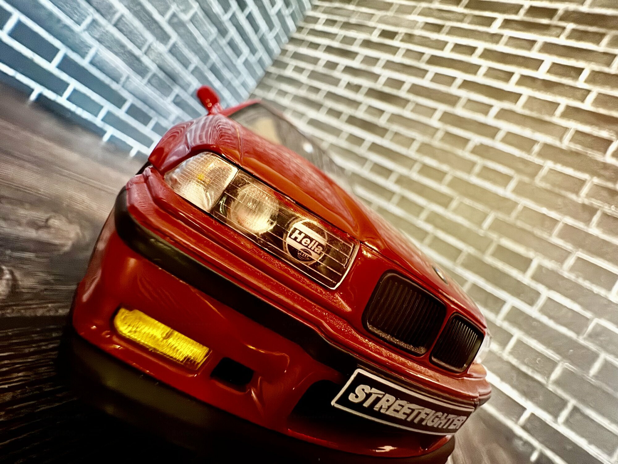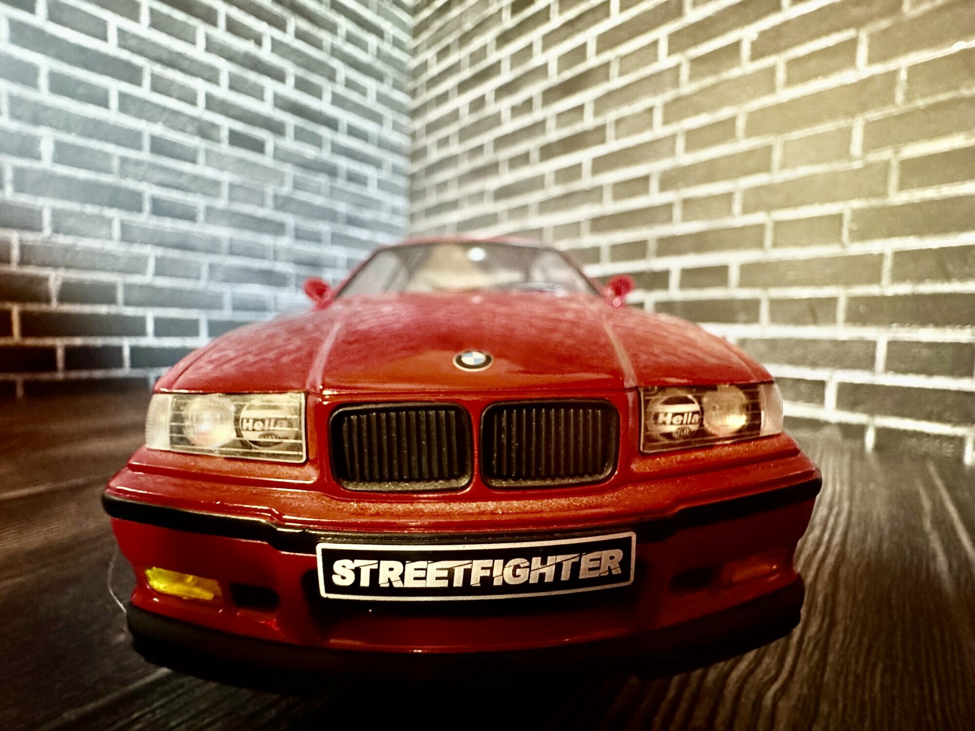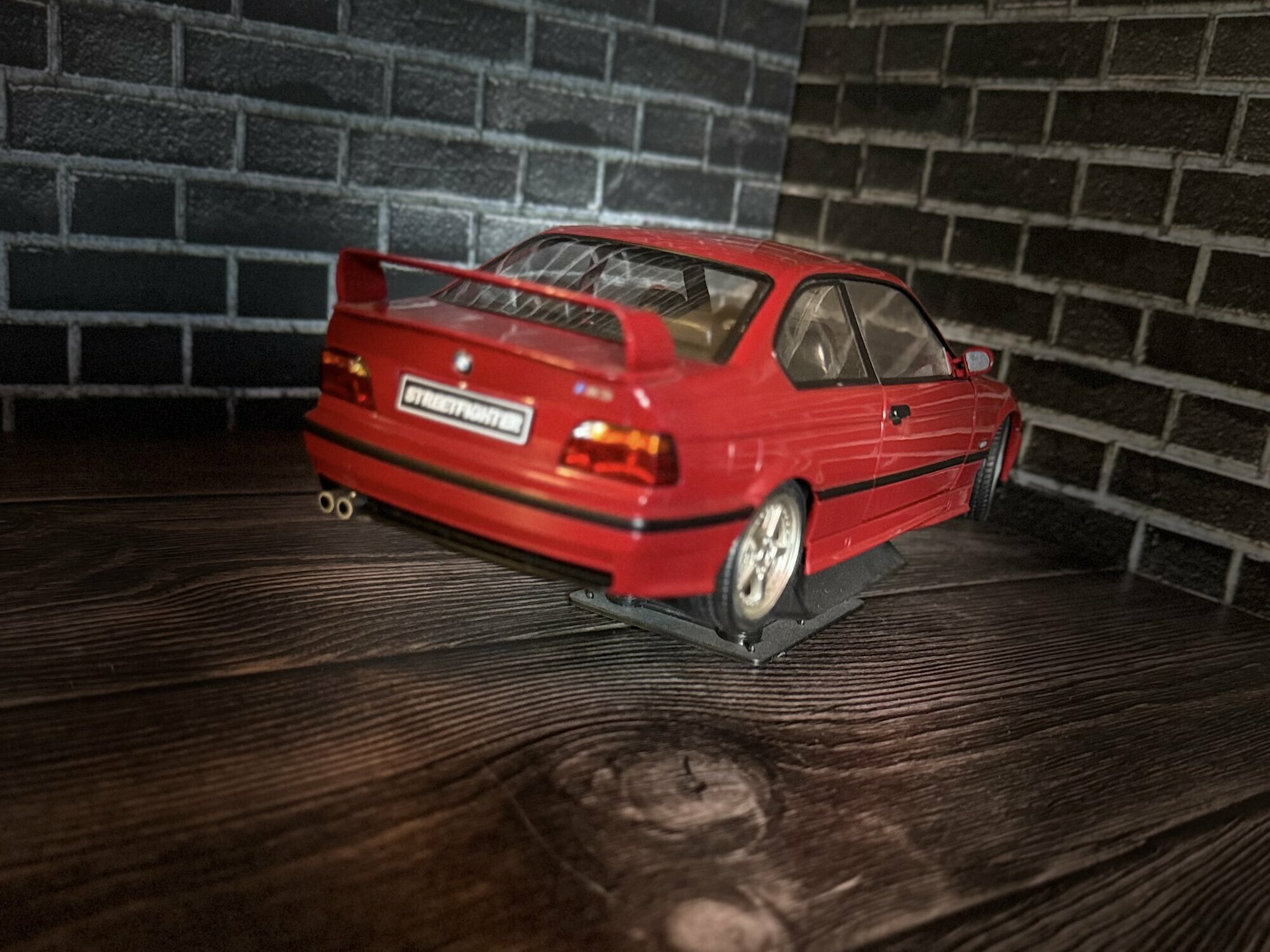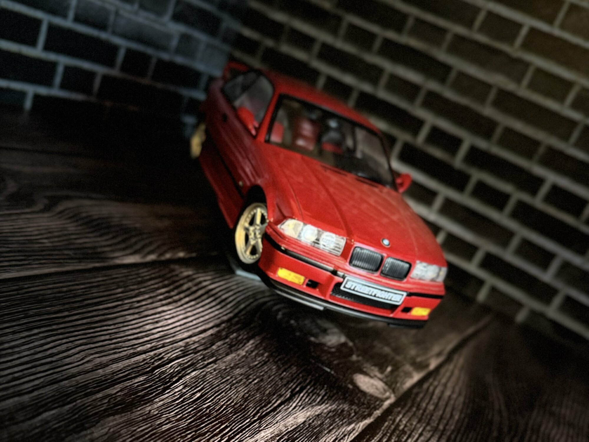 Die hier gezeigte Miniatur gehört zur Sammlung des Modelly‑Mitglieds „Evil500“ und stellt ein Modellauto im Maßstab 1:18 dar, das von Solido gefertigt wurde. Es handelt sich um ein Diecast‑Modell, also um ein Spritzgussmodell aus Zinkdruckguss, was das greifbare Gewicht und die haptische Stabilität erklärt. Die Fotos zeigen ein Coupé mit roter Lackierung, die sehr nahe an BMW‑Farbtönen wie „Hellrot“ liegt. Vorn sind die M‑typischen Lufteinlässe und die leicht eingezogenen Nieren erkennbar; die Blinker und Nebelleuchten sind in gelblicher Transparenz umgesetzt. Das Kennzeichen weist auf eine „Streetfighter“-Interpretation hin; ungeachtet dessen bleibt die Grundform eindeutig dem BMW M3 E36 zuzuordnen. Auffällig sind die goldfarbenen Fünfspeichen‑Felgen mit sichtbarer Tiefbettoptik und Niederquerschnittsreifen. Seitlich erkennt man die schwarzen Schutzleisten des E36 und eine dezente Tieferlegung. Hinten präsentiert das Modell einen markanten Heckspoiler, die typischen zweiflutigen Endrohre links sowie die „M3“-Heckklappenplakette. Die Heckleuchten sind mehrteilig mit roten und orangenen Segmenten umgesetzt. Die Innenraumdarstellung ist dunkel gehalten; Schalensitze und Türtafeln sind sauber abgegrenzt. Insgesamt überträgt das Modell die Proportionen des BMW M3 E36 stimmig: lange Motorhaube, kurze Überhänge und die flach geneigte Heckscheibe des Coupés. Auch die Gravuren der Motorhaubenlinien, die Spaltmaße an Türen und Stoßfängern sowie die Rückspiegel mit rotem Gehäuse fallen sauber auf. Dieses Modellauto im Maßstab 1:18 von Solido wirkt damit als solide Basis für Vitrinen‑ oder Dioramendarstellungen.